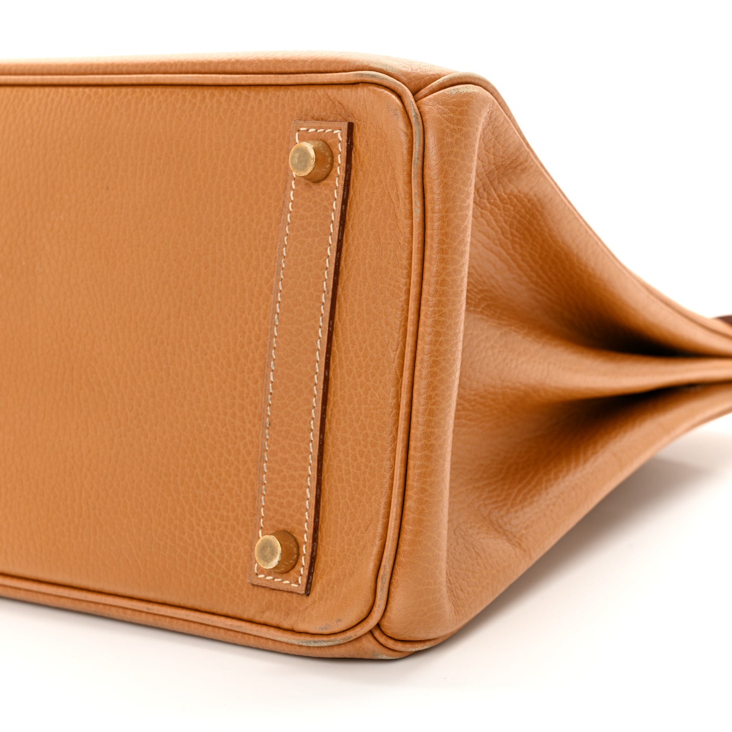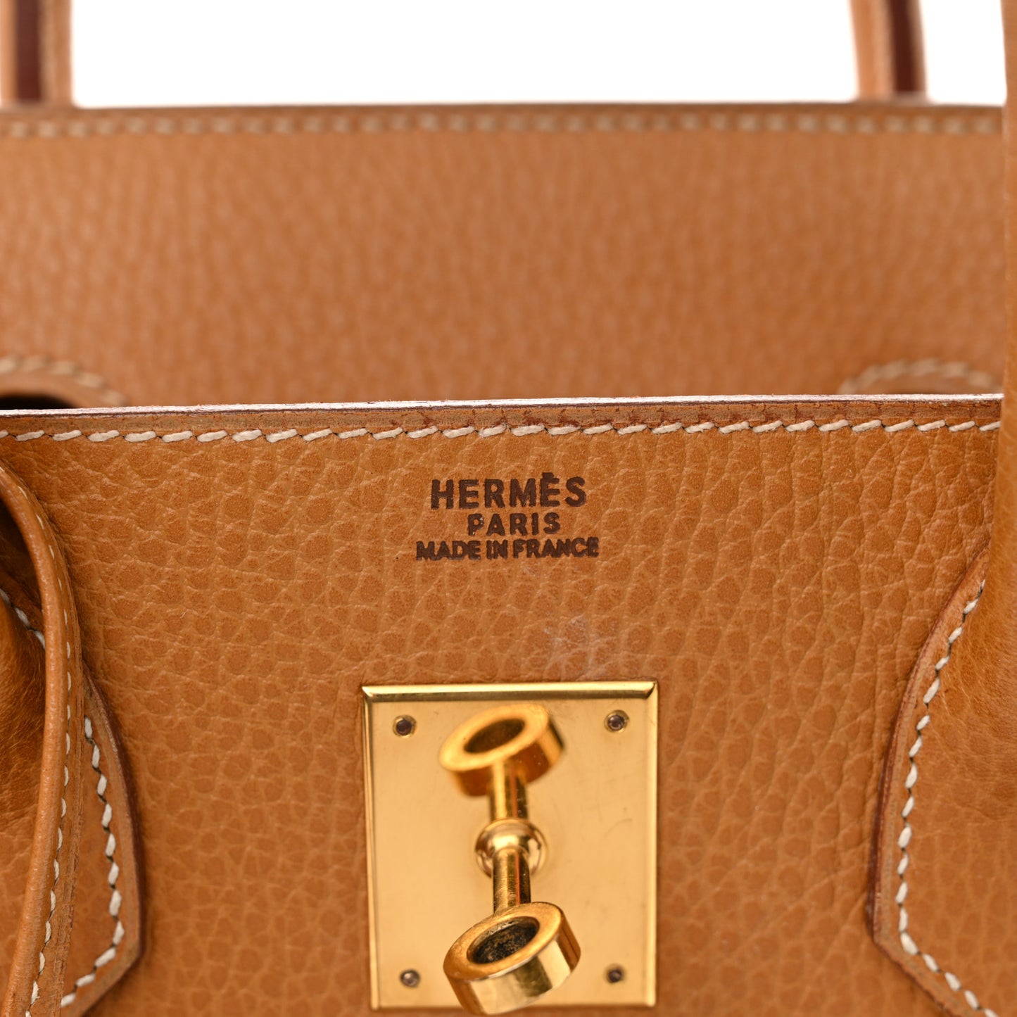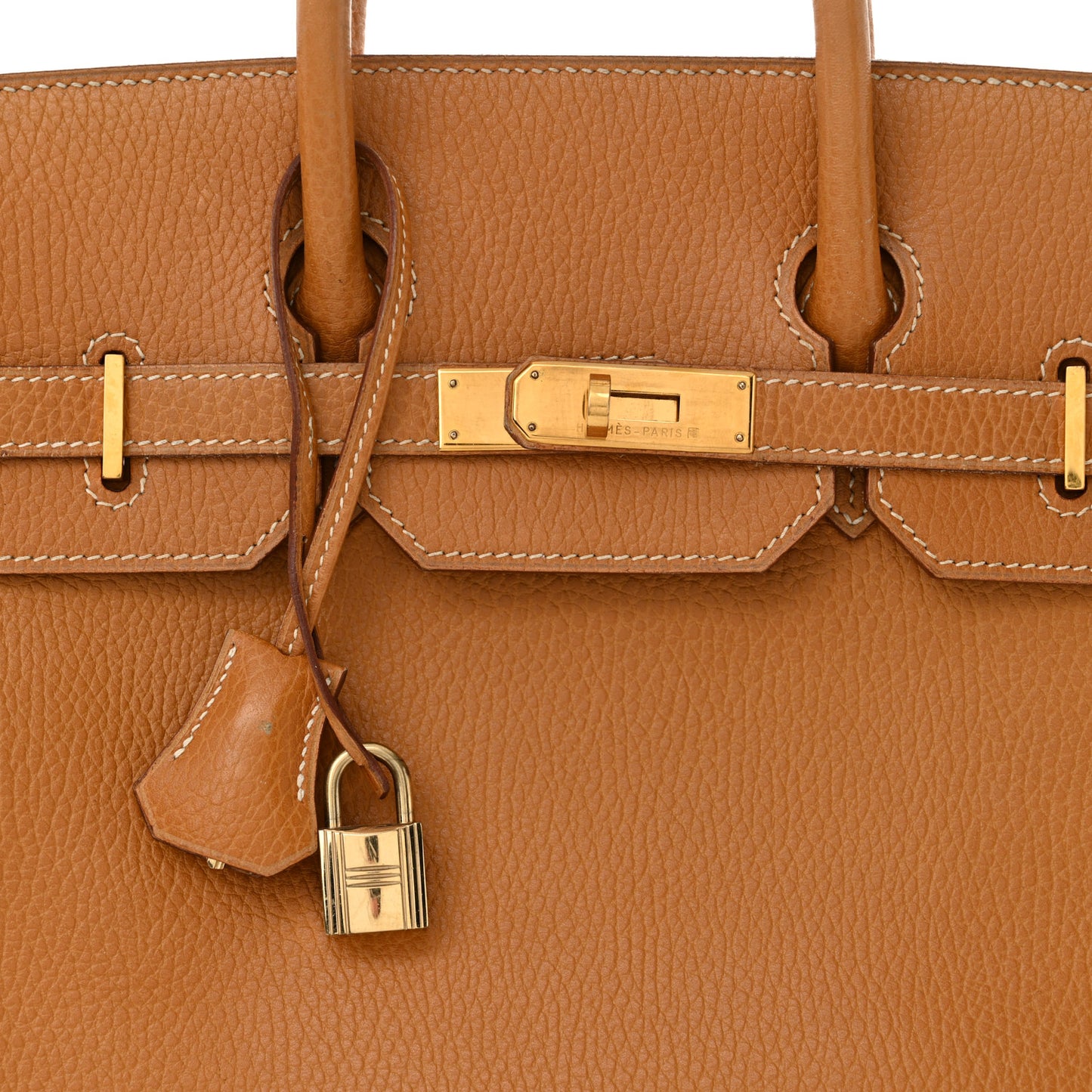 This is an authentic HERMES Ardennes HAC Birkin 32 in Naturelle. This stunning Birkin classic tote is crafted of beautifully textured calfskin leather in golden brown. The bag features leather top handles and a cross over flap with vertical strap closure and a gold plated turn lock and padlock. This opens to a chévre goatskin leather interior with pockets.Follow this item for alerts. Hermes is a registered trademark of Hermes. FASHIONPHILE is not affiliated with Hermes.