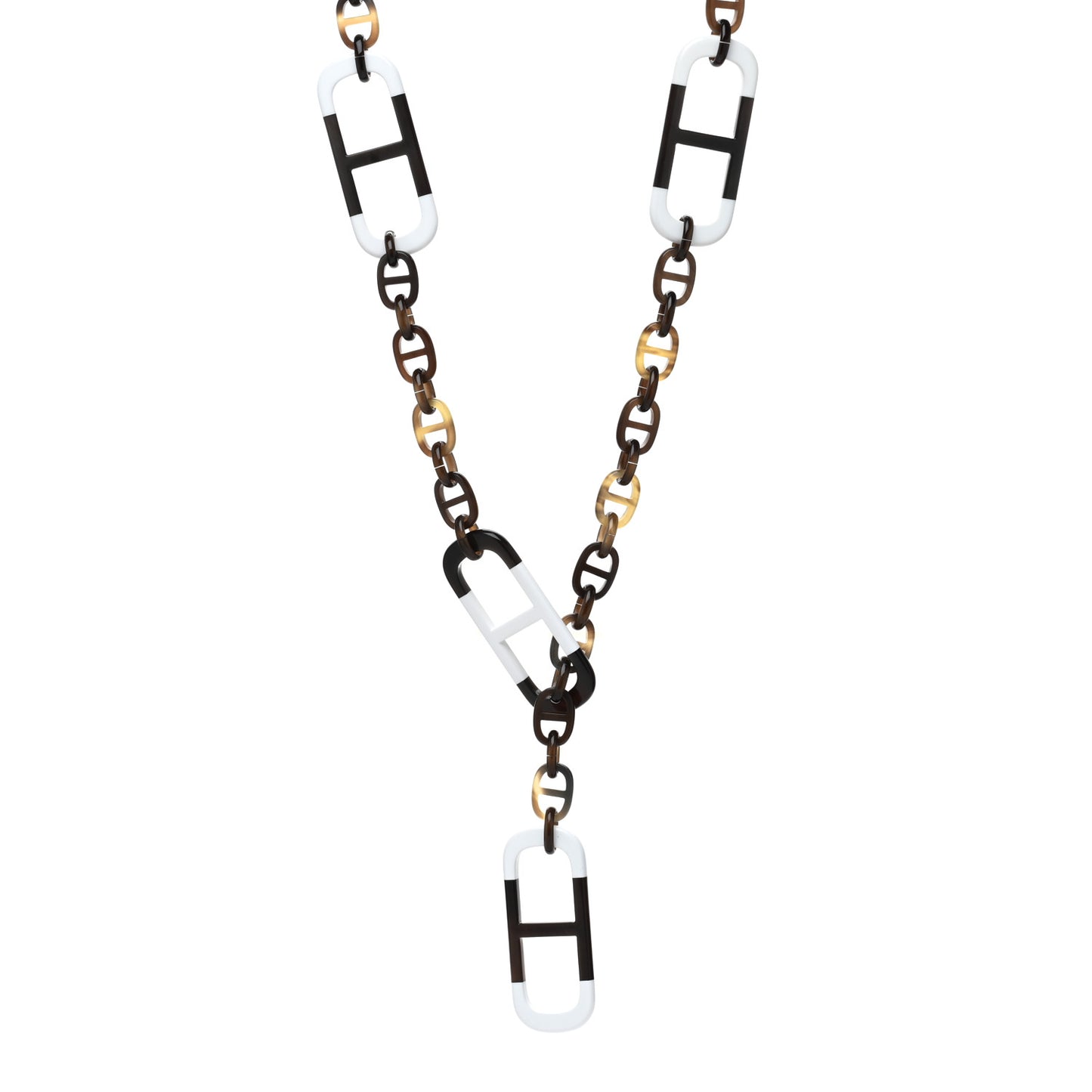 This is an authentic HERMES Buffalo Horn Lacquer Amarres Necklace in White. This unique necklace is crafted of buffalo horn in a tortoise design with white accents.Follow this item for alerts. Hermes is a registered trademark of Hermes. FASHIONPHILE is not affiliated with Hermes.
