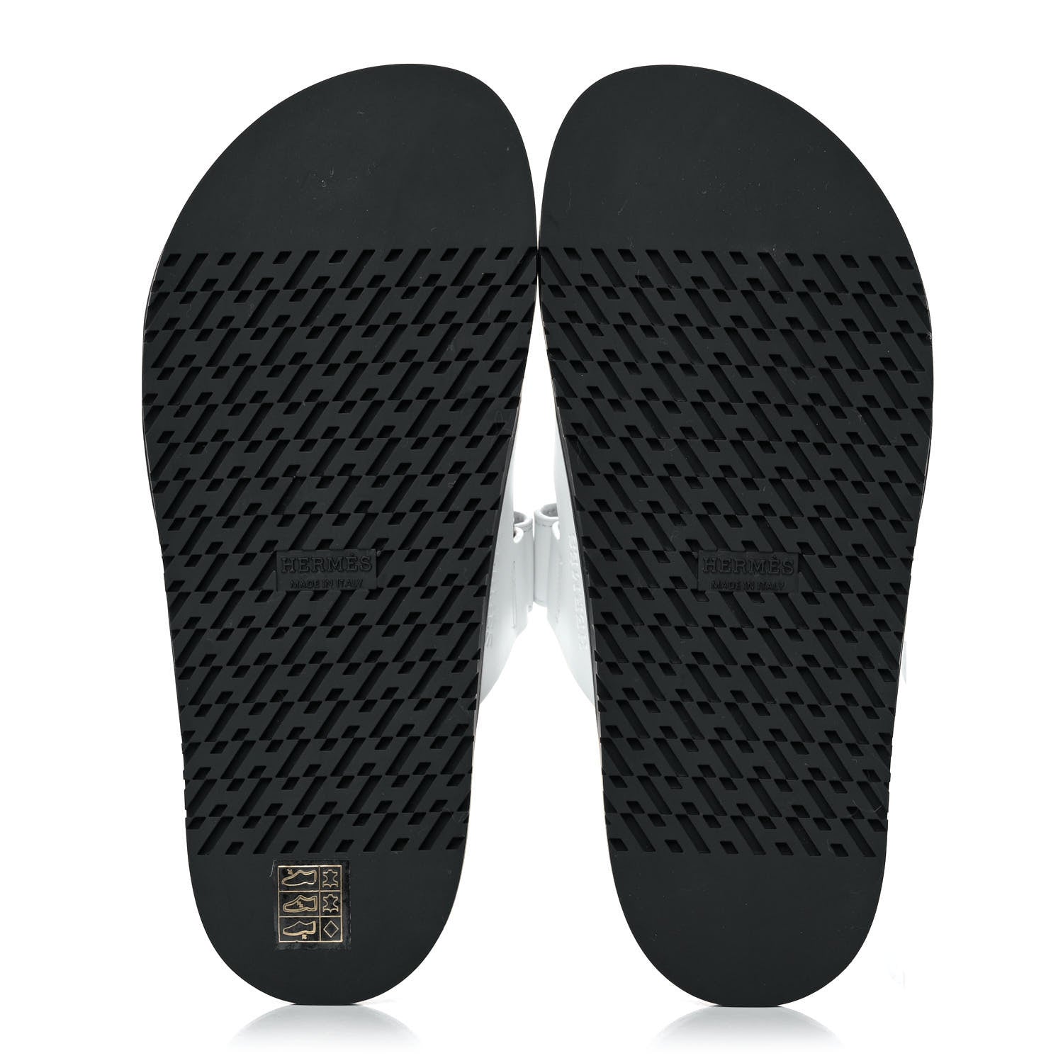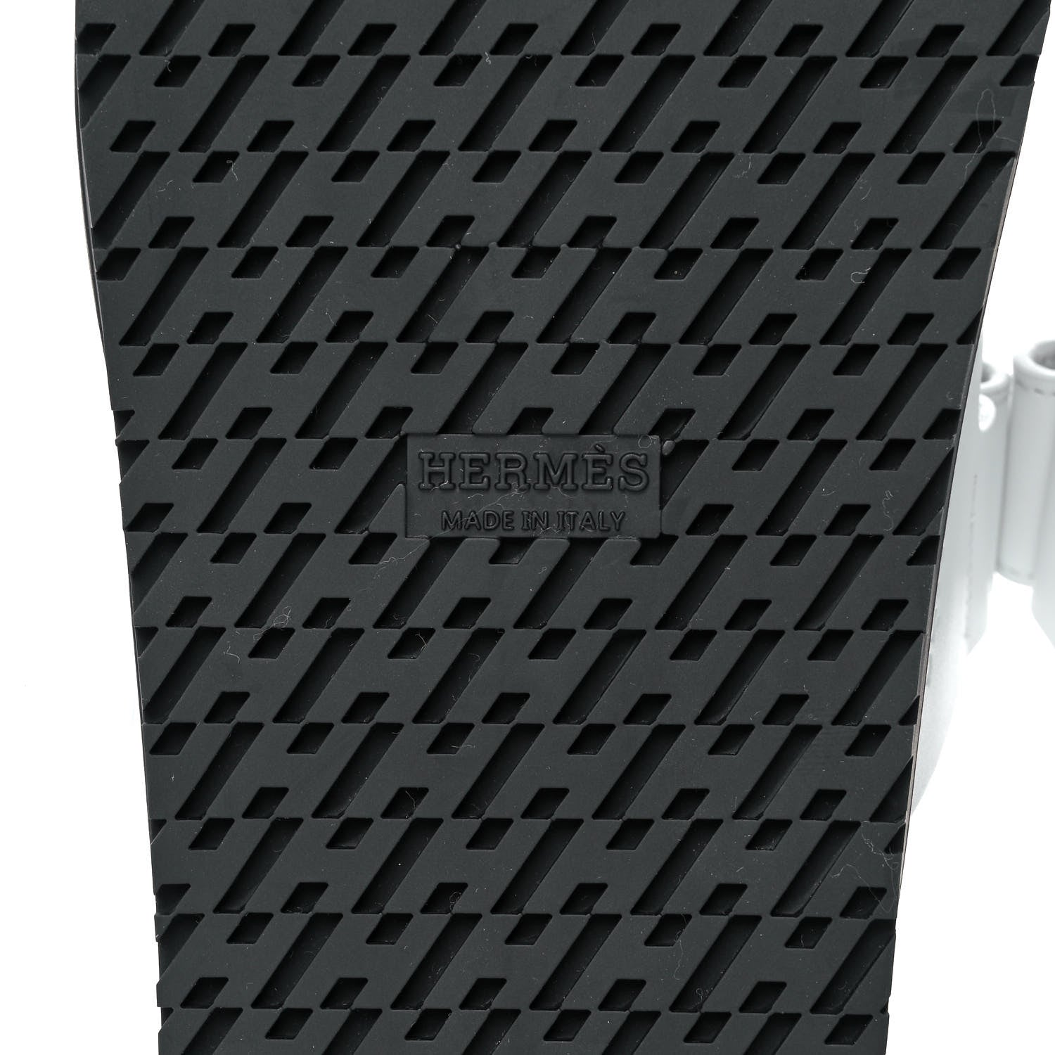 This is an authentic pair of HERMES Calfskin Women's Chypre Sandal size 38.5 in White. These stylish sandals are crafted of leather in white with black soles. They feature a toe strap and a cross over large Hermes H and an adjustable strap.Follow this item for alerts. Hermes is a registered trademark of Hermes. FASHIONPHILE is not affiliated with Hermes.