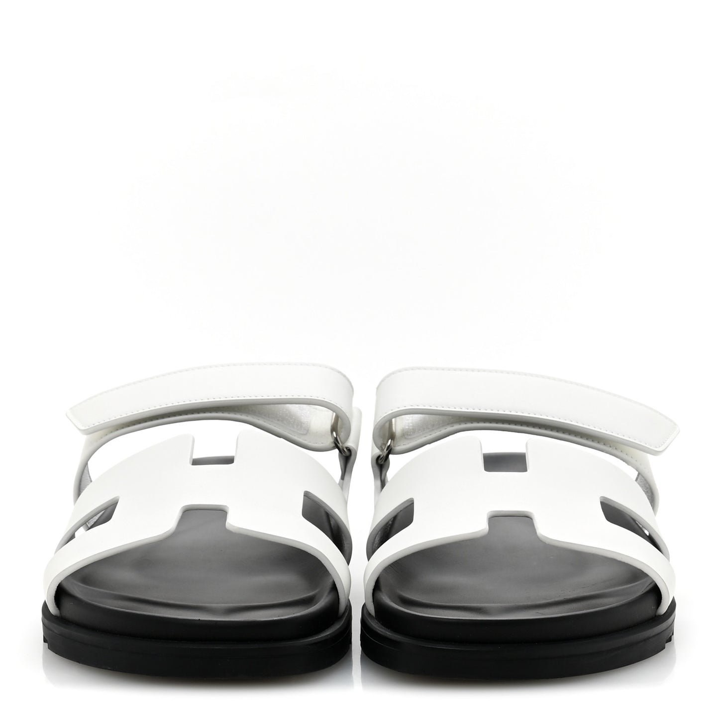 This is an authentic pair of HERMES Calfskin Womens Chypre Sandals in size 41 in White. These stylish sandals are crafted of leather in white. They feature a contoured footbed, toe strap with a cross-over large Hermes H and an adjustable strap.Follow this item for alerts. Hermes is a registered trademark of Hermes. FASHIONPHILE is not affiliated with Hermes.