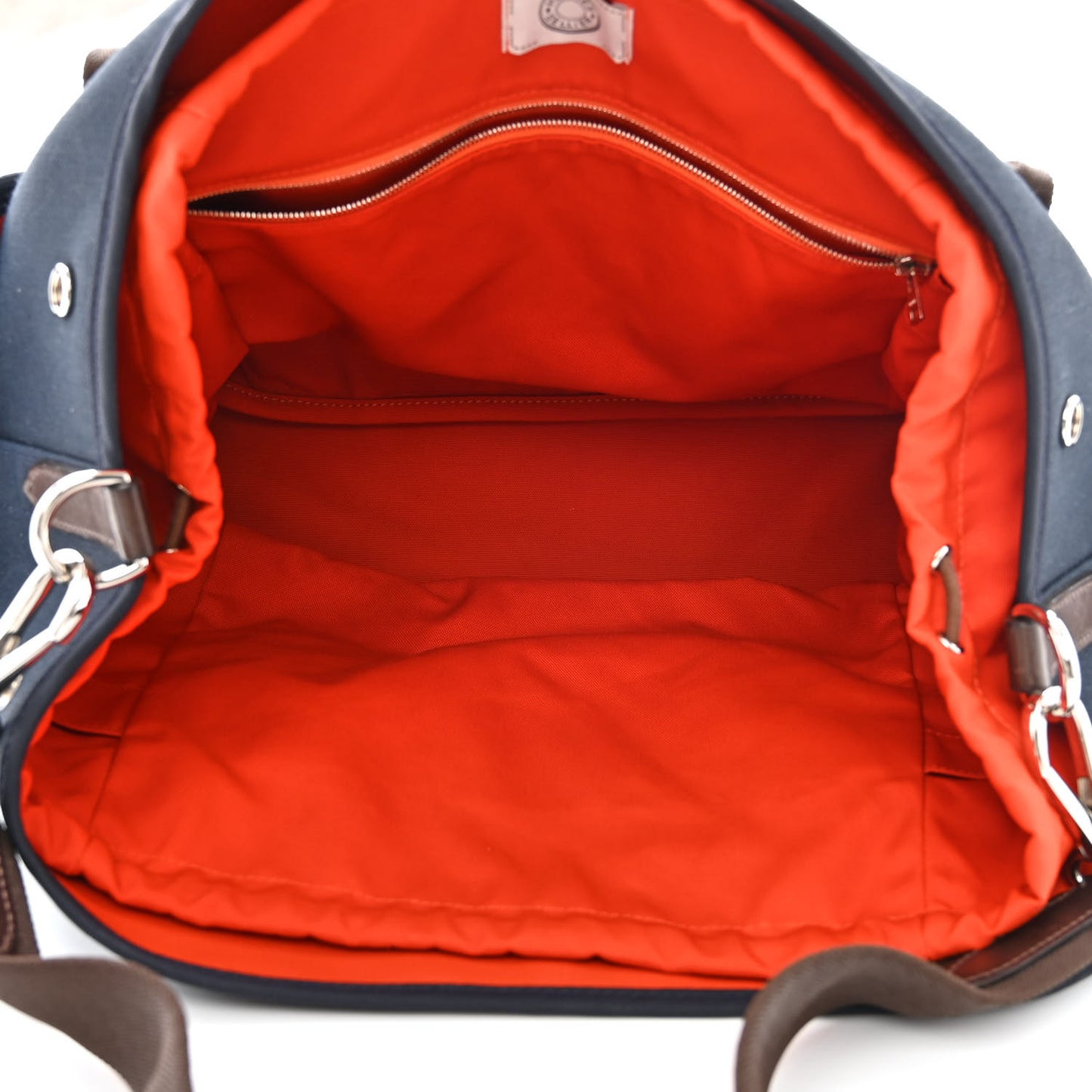 This is an authentic HERMES Canvas The Grooming Bag in Bleu Navy and Feu. This luxury grooming bag is crafted of durable canvas in dark blue. The bag features exterior pockets, brown canvas handles, an optional brown shoulder strap, brown trim, and palladium silver hardware. The top opens to a central large orange removable insert and pocketsFollow this item for alerts. Hermes is a registered trademark of Hermes. FASHIONPHILE is not affiliated with Hermes.
