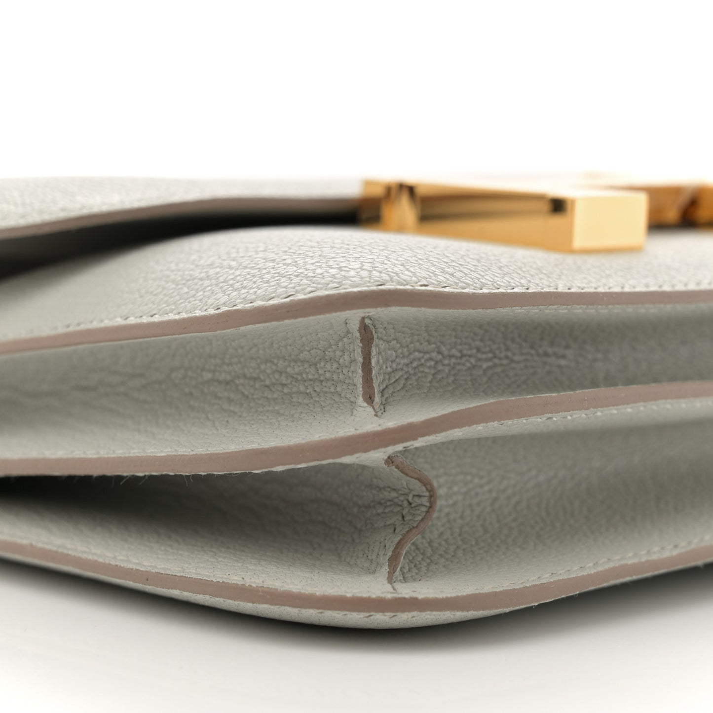 This is an authentic HERMES Chevre Mysore Constance 18 in Gris Perle. This is a chic small bag that is finely crafted of luxurious chevre goatskin leather in grey. The shoulder bag features a leather shoulder strap, a front flap, and a polished gold Hermes H logo clasp. The flap opens to a partitioned smooth grey leather interior with patch pockets.Follow this item for alerts. Hermes is a registered trademark of Hermes. FASHIONPHILE is not affiliated with Hermes.