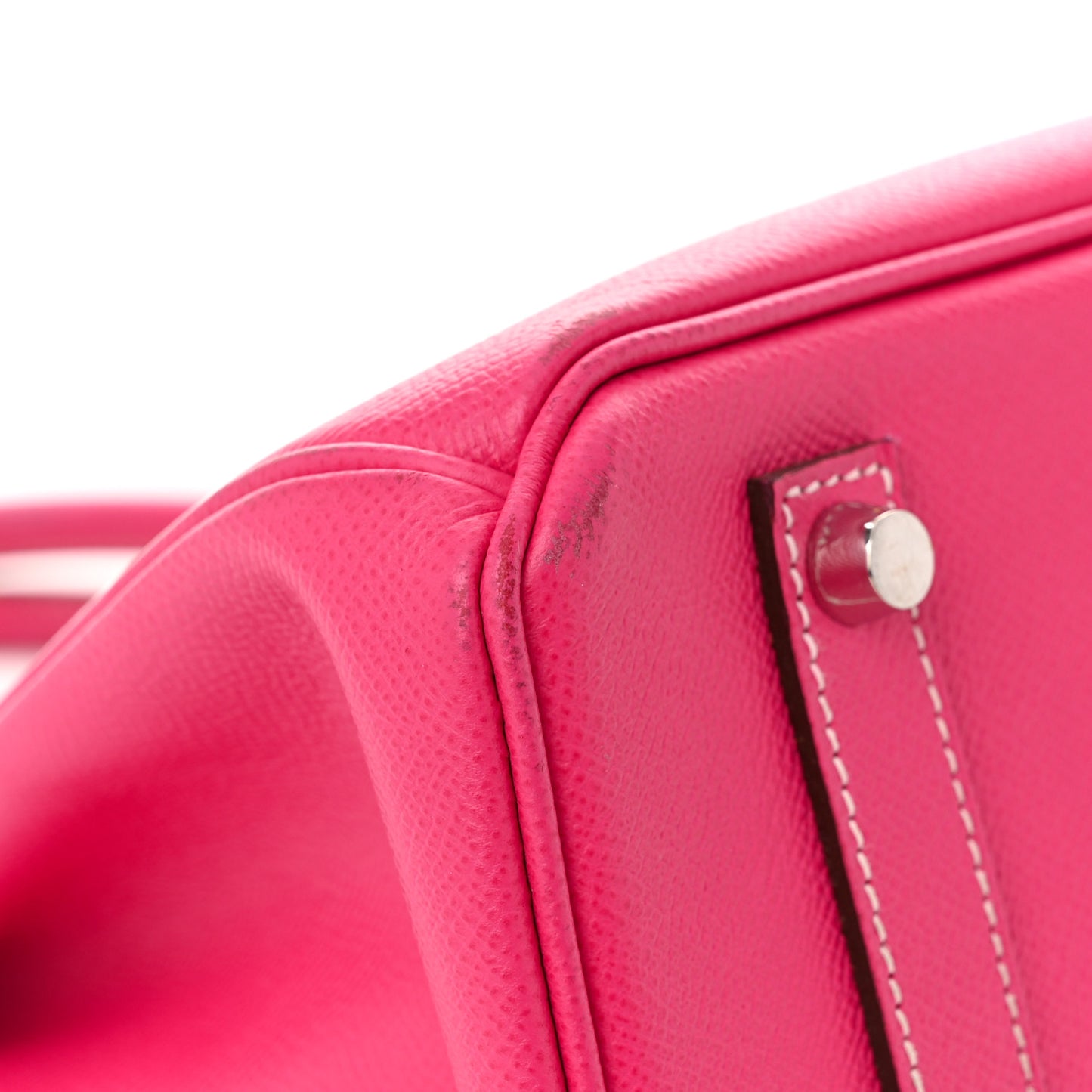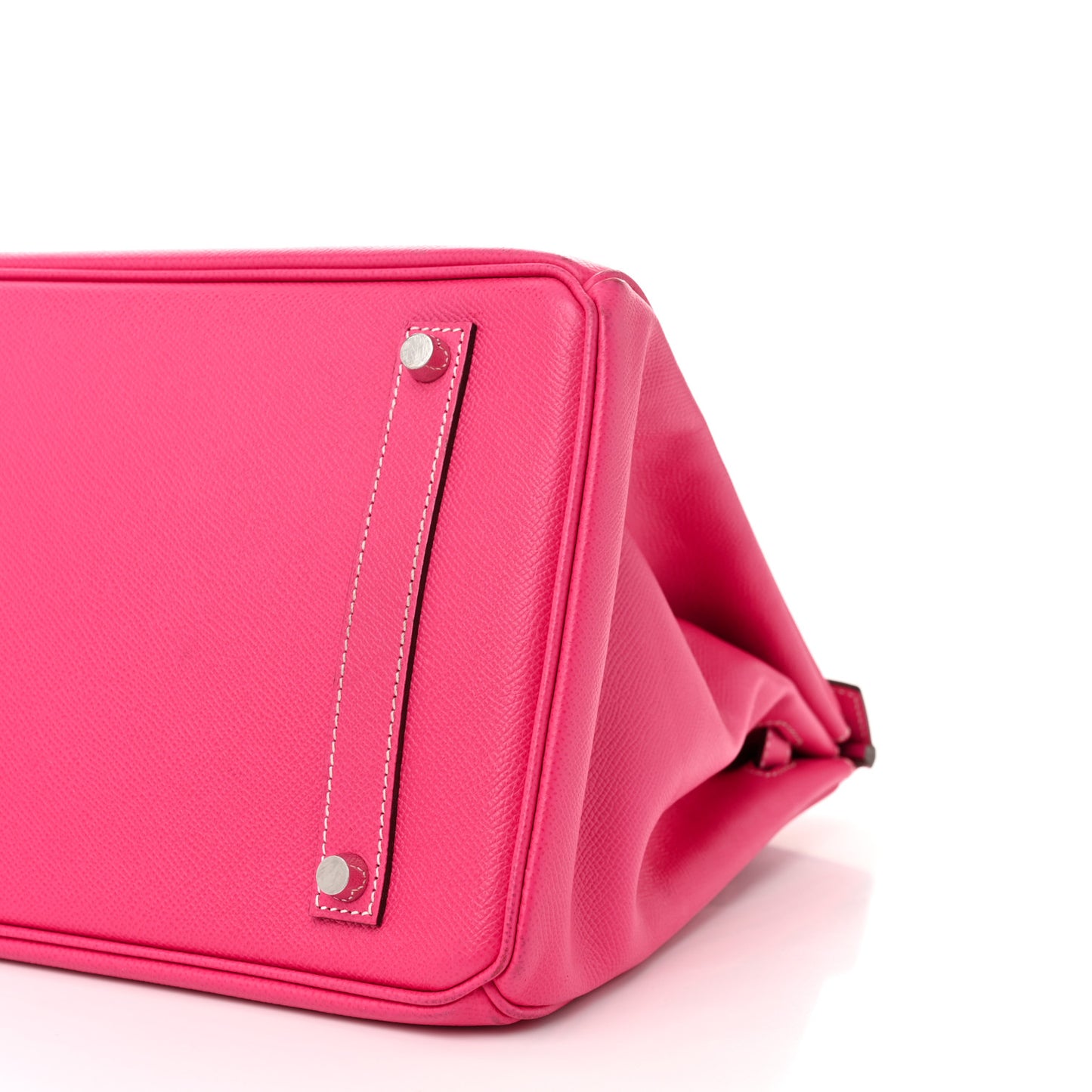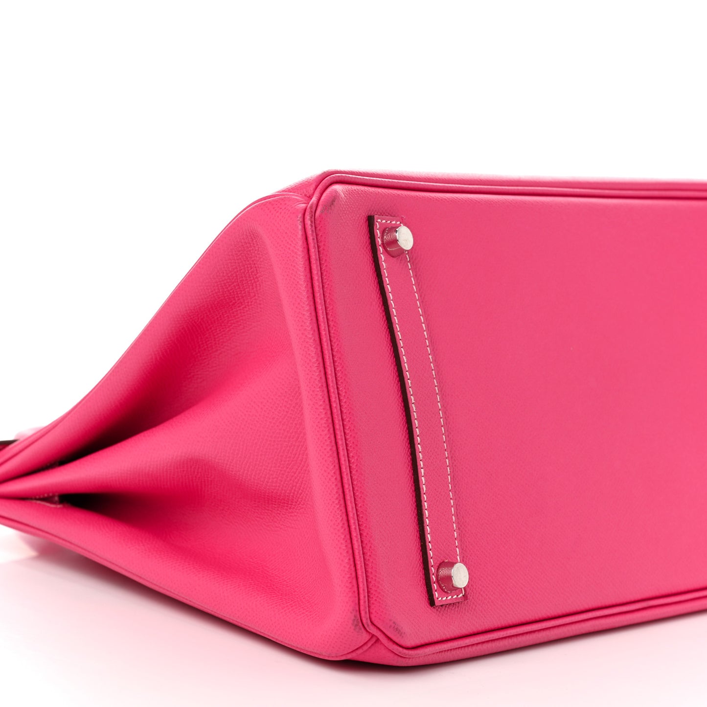 This is an authentic HERMES Epsom Birkin 35 in Rose Tyrien. This stylish tote is beautifully crafted of epsom calfskin leather in bright pink with contrast white stitching. The bag features rolled leather top handles, a short flap and strap closure, and palladium silver-plated hardware including a turn lock and padlock and keys. This opens to a matte chevre goatskin interior with a zipper and flat pocket.Follow this item for alerts. Hermes is a registered trademark of Hermes. FASHIONPHILE is not affiliated with Hermes.
