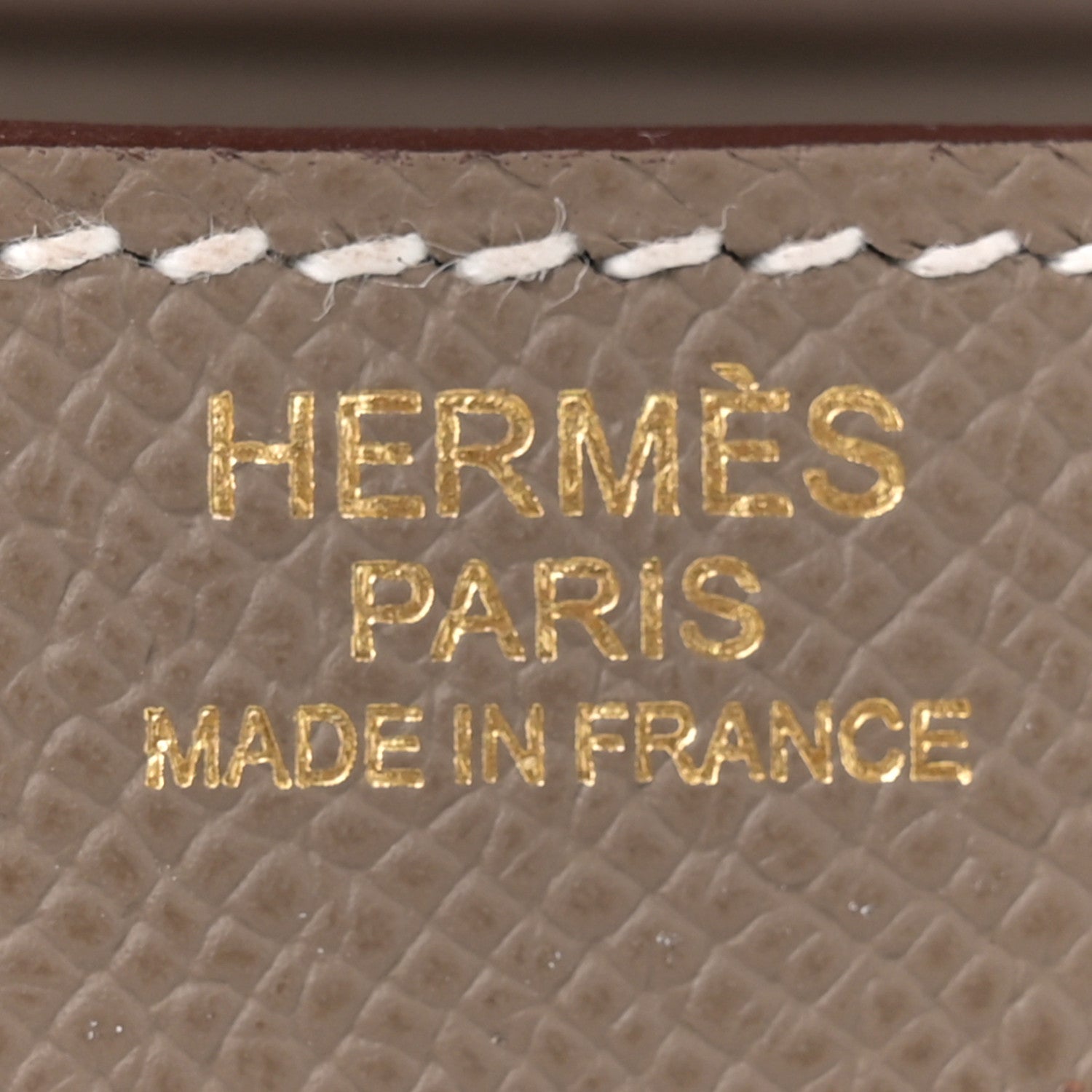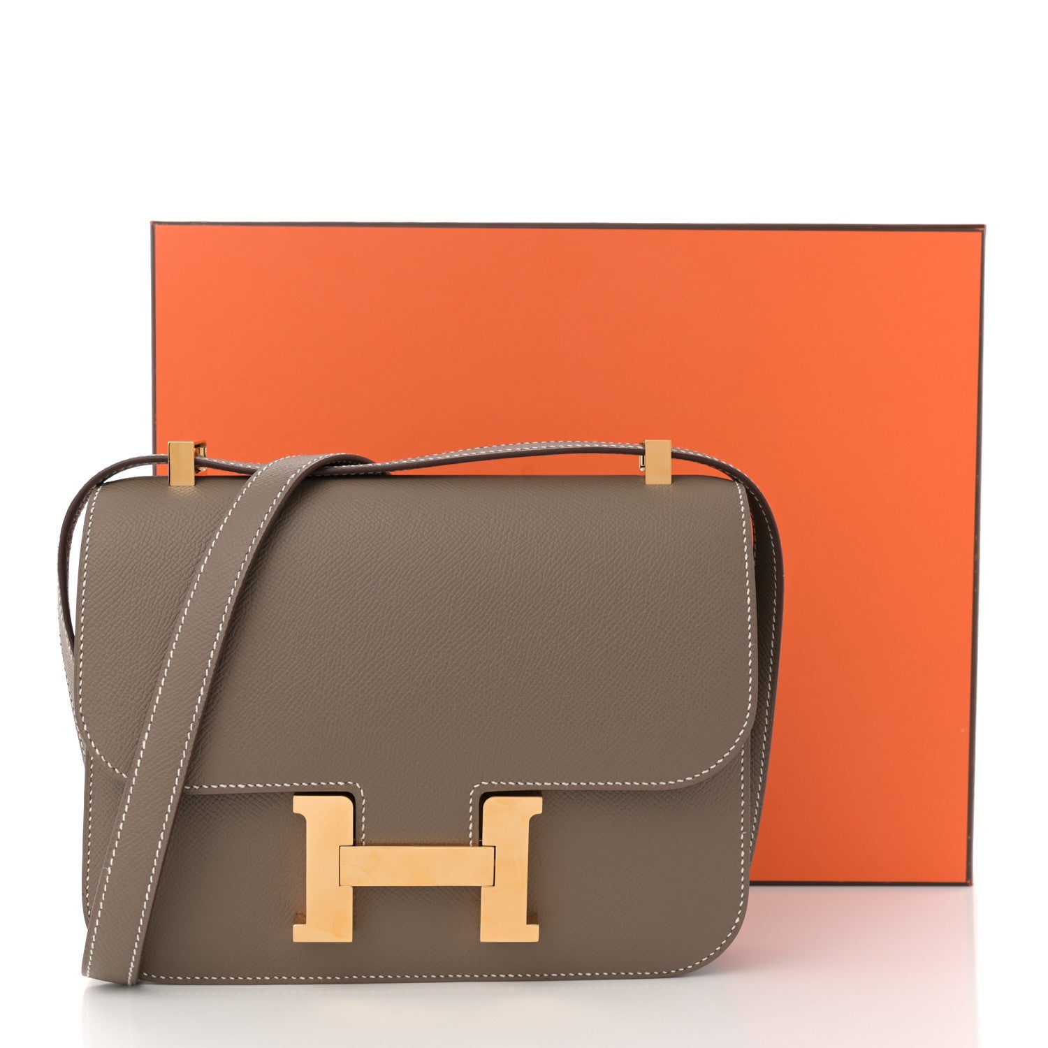 This is an authentic HERMES Epsom Constance 1-24 in Etoupe. This stylish shoulder bag is crafted of epsom calfskin leather in taupe. The bag features a rear slip pocket, a long shoulder strap with gold plated hardware, and a gold H buckle on the front. This opens the flap to a smooth beige leather interior with zippered and flat pockets and a removable mirror.Follow this item for alerts. Hermes is a registered trademark of Hermes. FASHIONPHILE is not affiliated with Hermes.