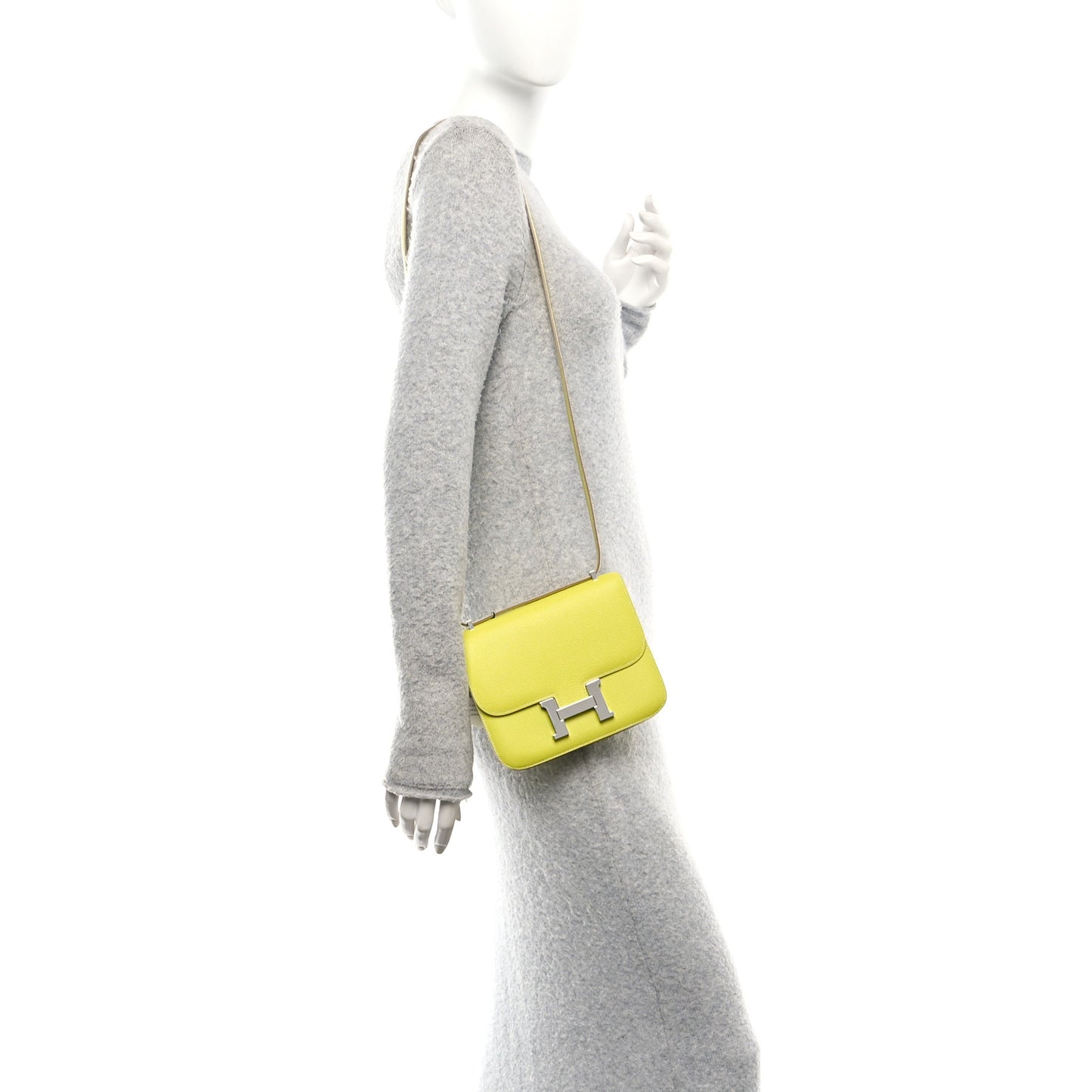 This is an authentic HERMES Epsom Constance 18 in Lime. This is a chic small bag that is finely crafted of luxurious epsom calfskin leather in yellow. The bag features a leather cross body shoulder strap, expandable sides, a facing flap, and polished palladium-plated Hermes H logo. The flap opens to a partitioned smooth matching leather interior with a pocket.Follow this item for alerts. Hermes is a registered trademark of Hermes. FASHIONPHILE is not affiliated with Hermes.