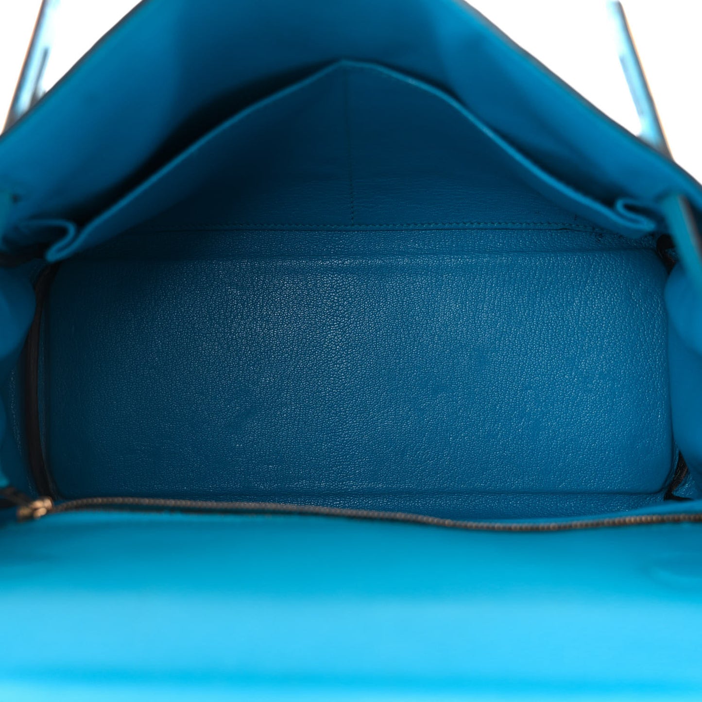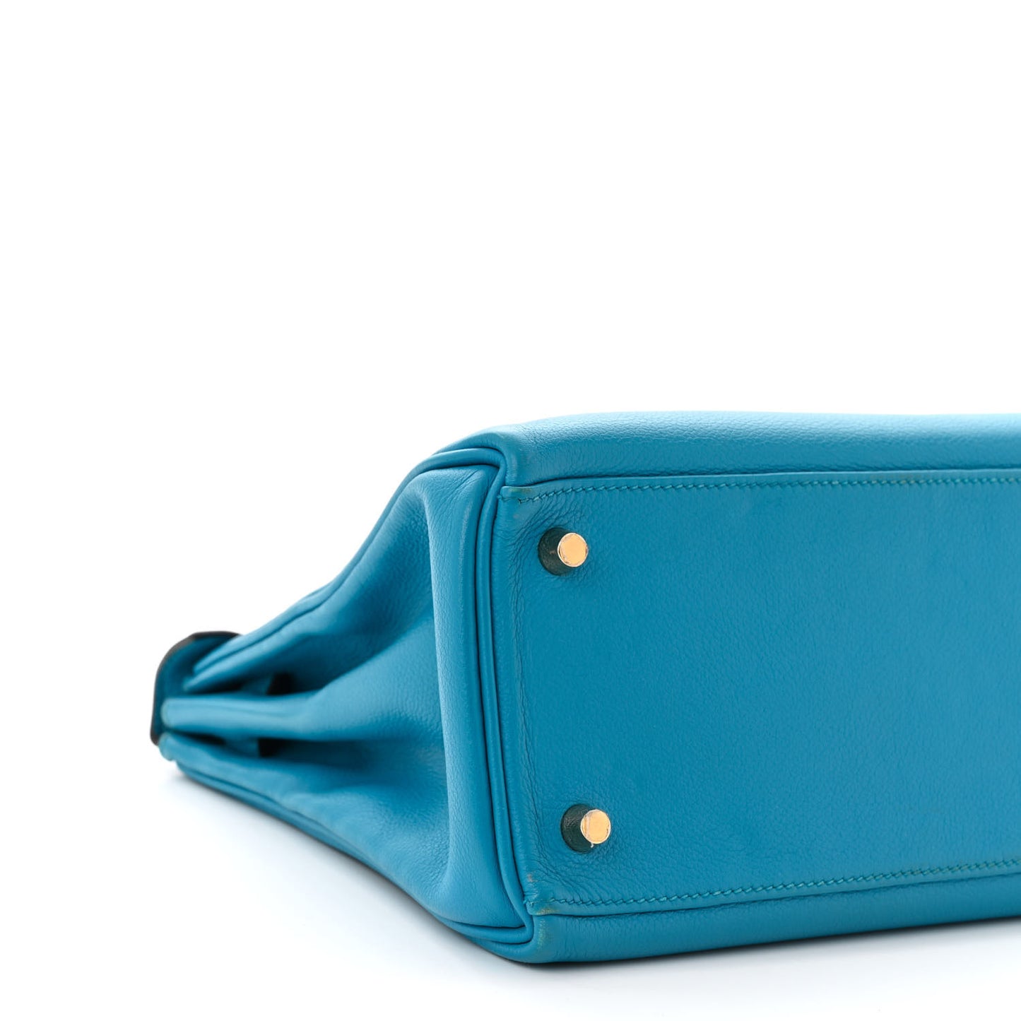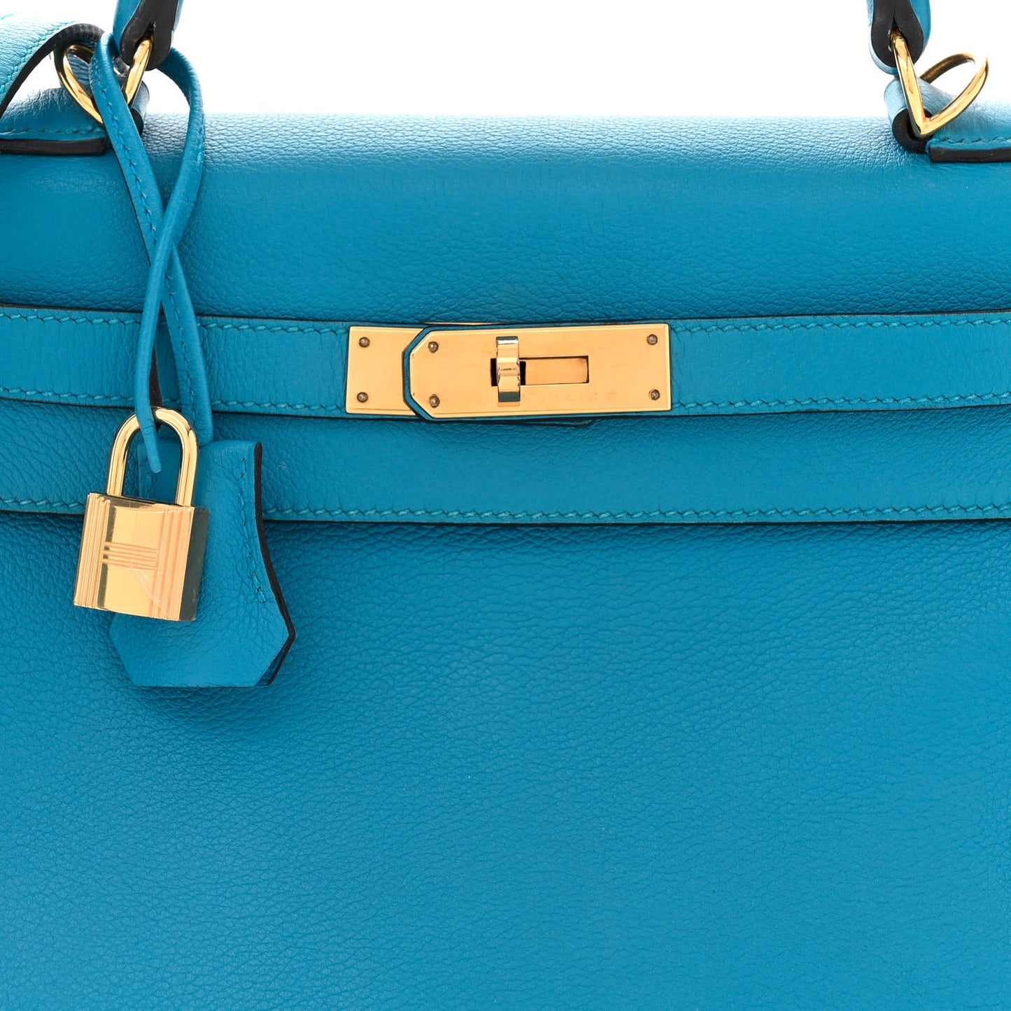 This is an authentic HERMES Evercolor Kelly Retourne 28 in Bleu Zanzibar. This chic Kelly handbag is crafted of rich evercolor calfskin leather in a vibrant blue. The bag features a reinforced rolled leather top handle, an optional shoulder strap, polished gold plated hardware including a signature Kelly turn lock, a padlock, and a hanging clochette with keys. The flap opens to a matte leather interior with zipper and flat pockets.Follow this item for alerts. Hermes is a registered trademark of Hermes. FASHIONPHILE is not affiliated with Hermes.