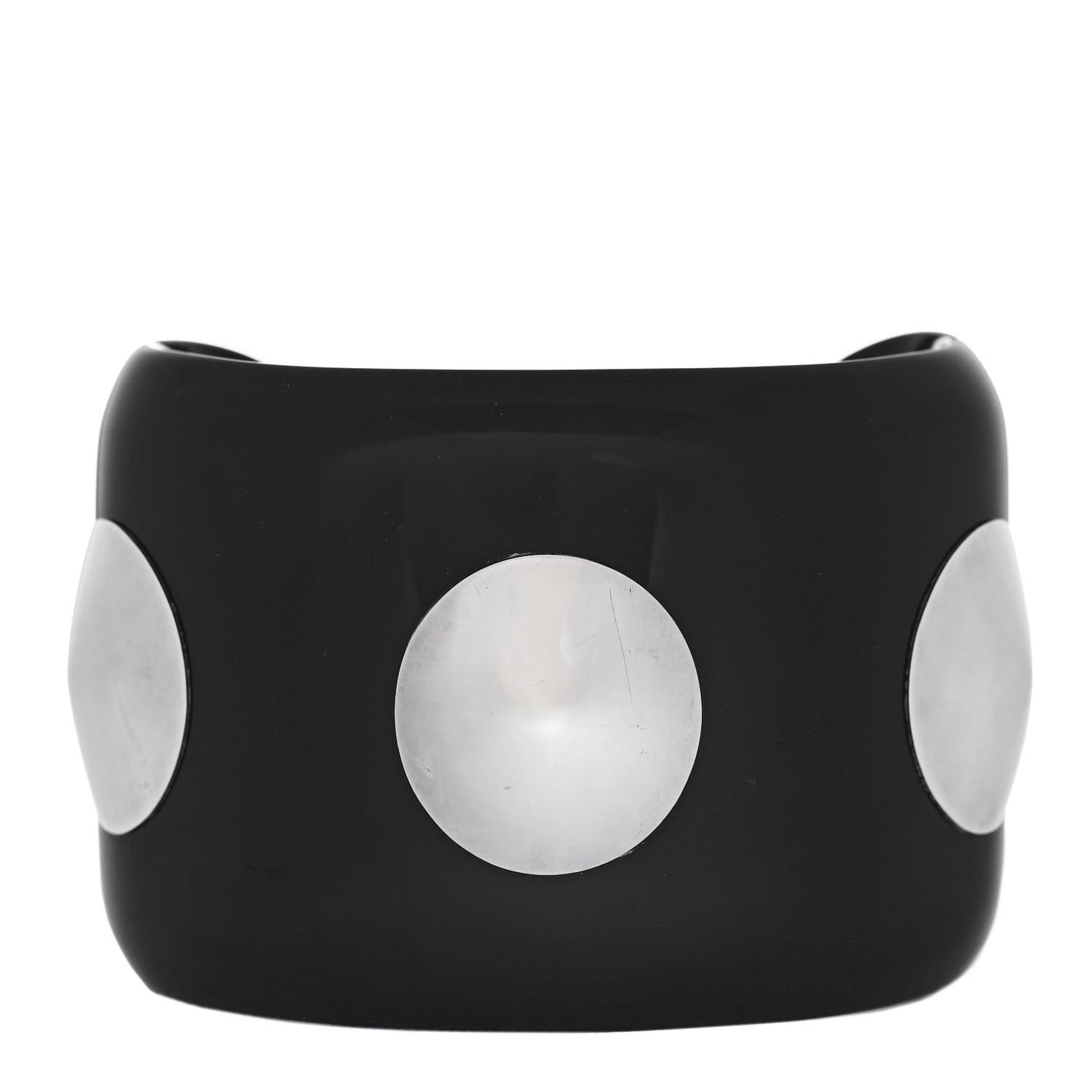 This is an authentic HERMES Horn Sterling Silver Cuff Bracelet PM in Black. This cuff bracelet is crafted of lacquered horn with disks of sterling silver.Follow this item for alerts. Hermes is a registered trademark of Hermes. FASHIONPHILE is not affiliated with Hermes.