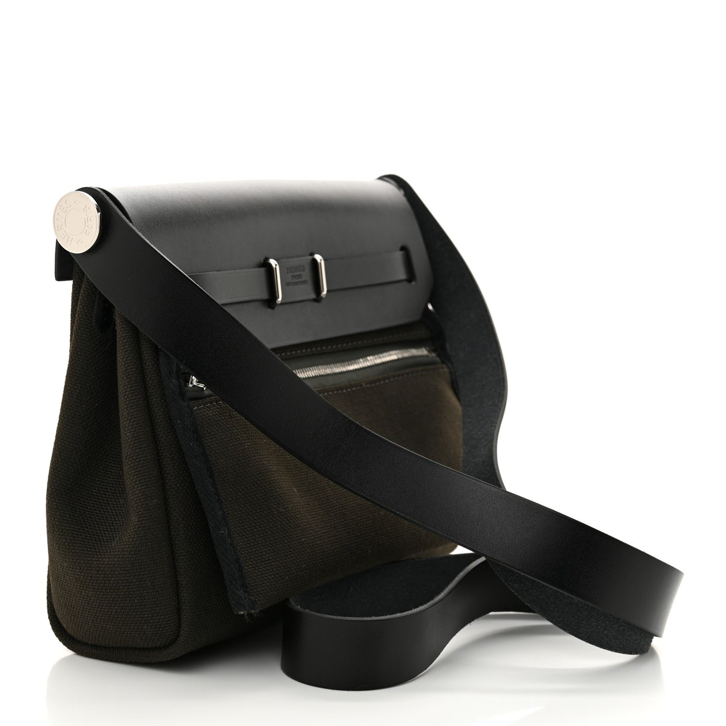 This is an authentic Military Toile Vache Hunter Herbag Zip Retourne 20 PM in Vert De Gris and Black. This stylish mini Herbag is crafted of toile canvas in a grey-green color and black. It features a rear exterior zip pocket, a black leather top crest with a leather strap, and strap closure with palladium hardware. This opens to a matching interior.Follow this item for alerts. Hermes is a registered trademark of Hermes. FASHIONPHILE is not affiliated with Hermes.