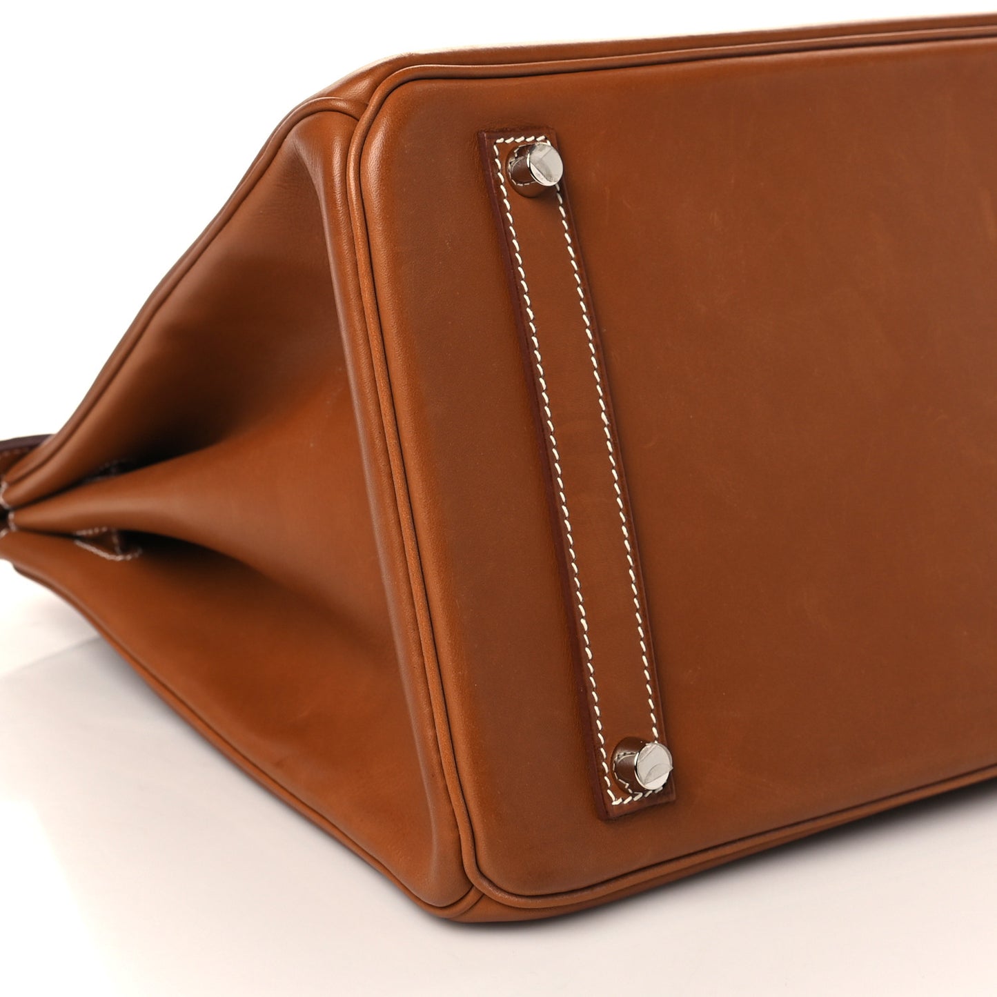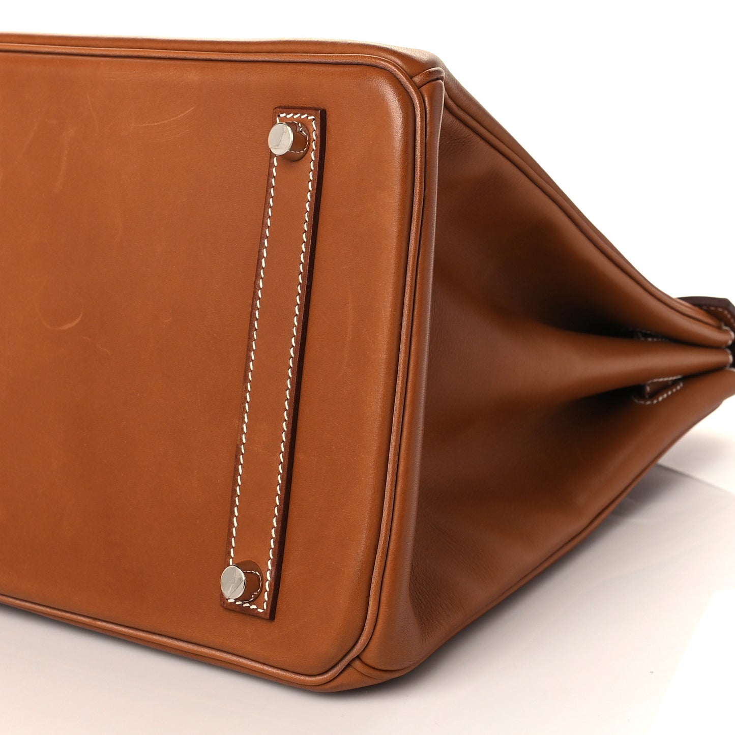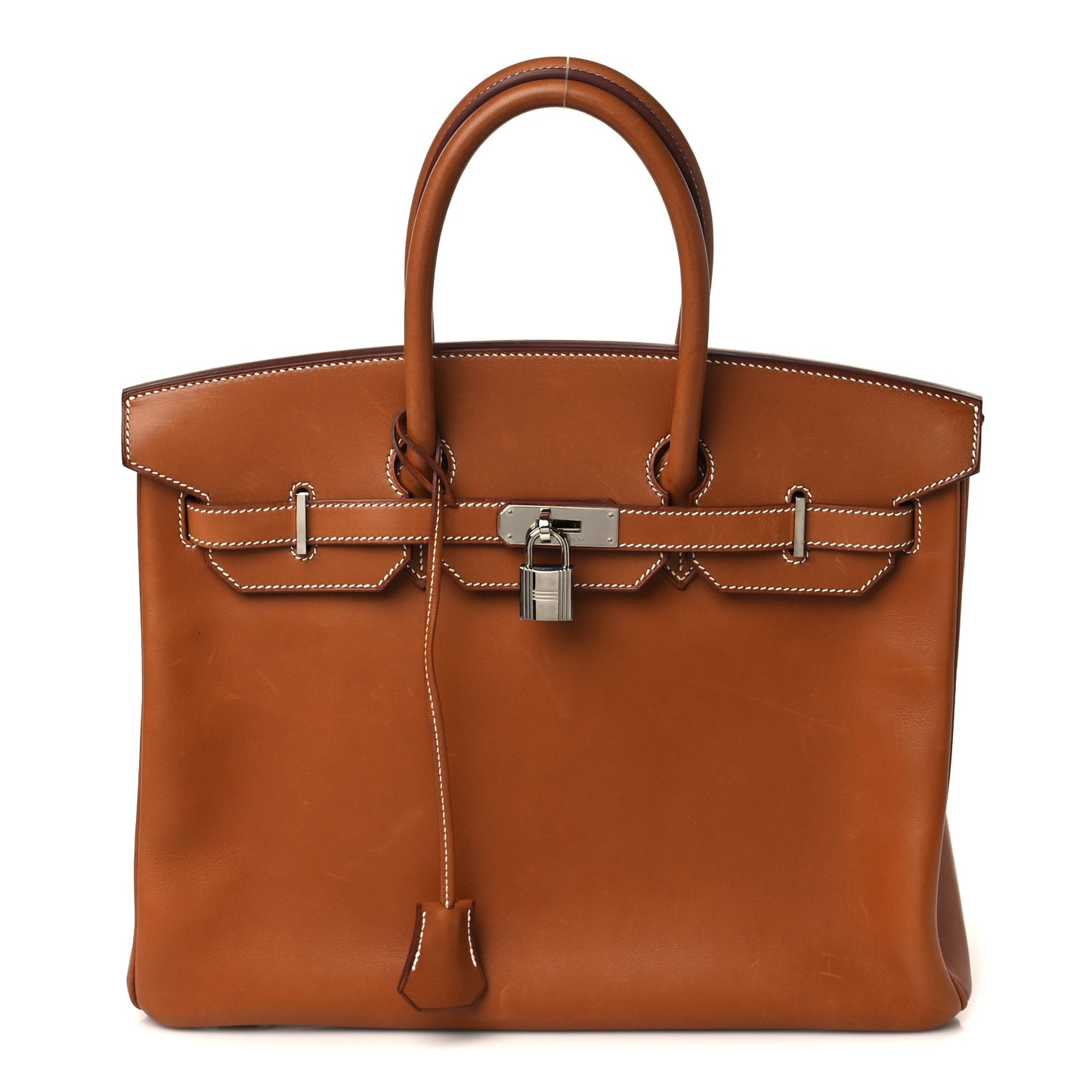 This is an authentic HERMES Natural Barenia Birkin 35 in Fauve. This rare handbag is finely crafted of golden brown barenia leather. The bag features white top stitching, rolled leather top handles, leather front closure belts, and a palladium plated turn lock with a padlock and hanging clochette for the keys. This opens to a matching leather interior with zipper and patch pockets.Follow this item for alerts. Hermes is a registered trademark of Hermes. FASHIONPHILE is not affiliated with Hermes.