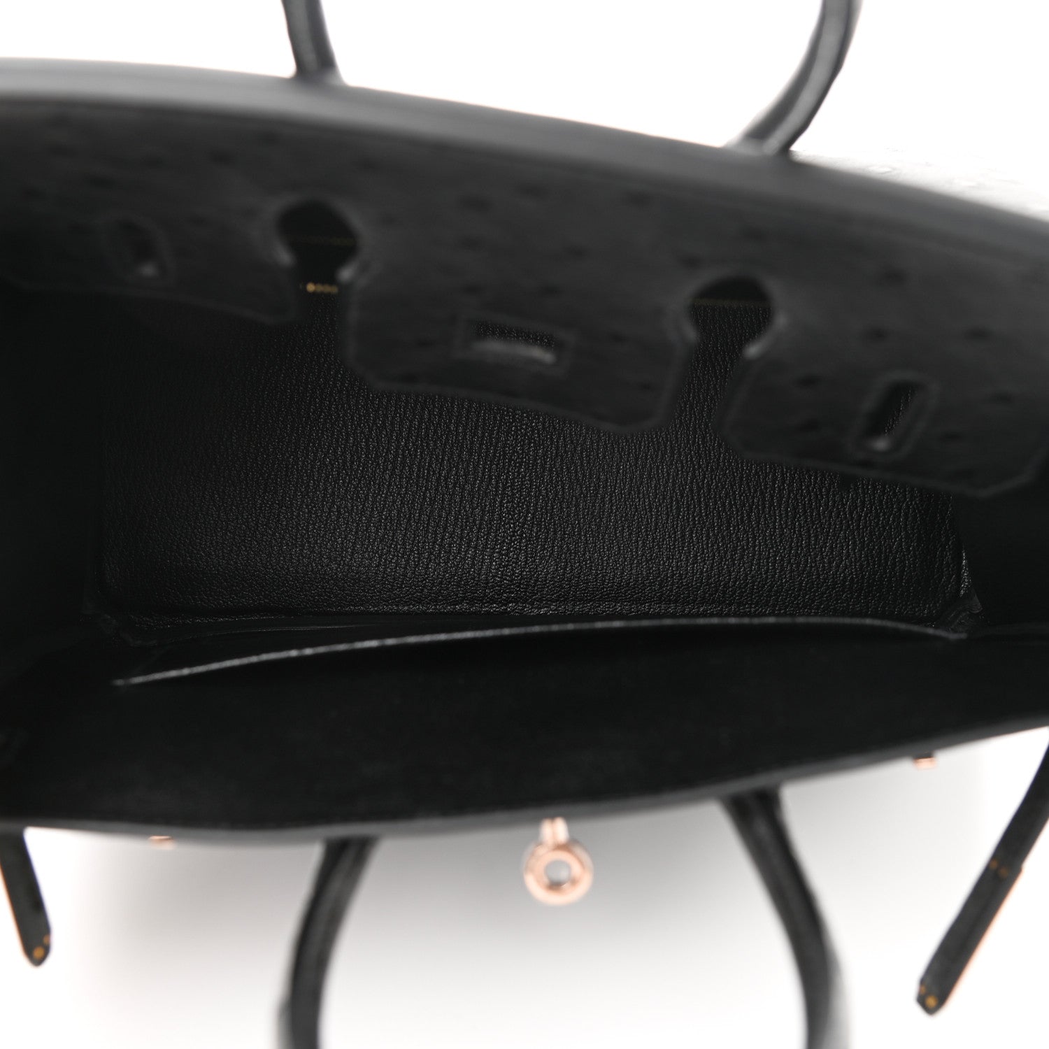 This is an authentic HERMES Ostrich Birkin 25 in Black. This chic handbag is expertly handcrafted of exotic ostrich leather in black. The bag features rolled leather top handles, a frontal flap with a strap closure with rose gold plated hardware, including a padlock. The top flap opens to a matching leather interior with zipper and patch pockets.Follow this item for alerts. Hermes is a registered trademark of Hermes. FASHIONPHILE is not affiliated with Hermes.