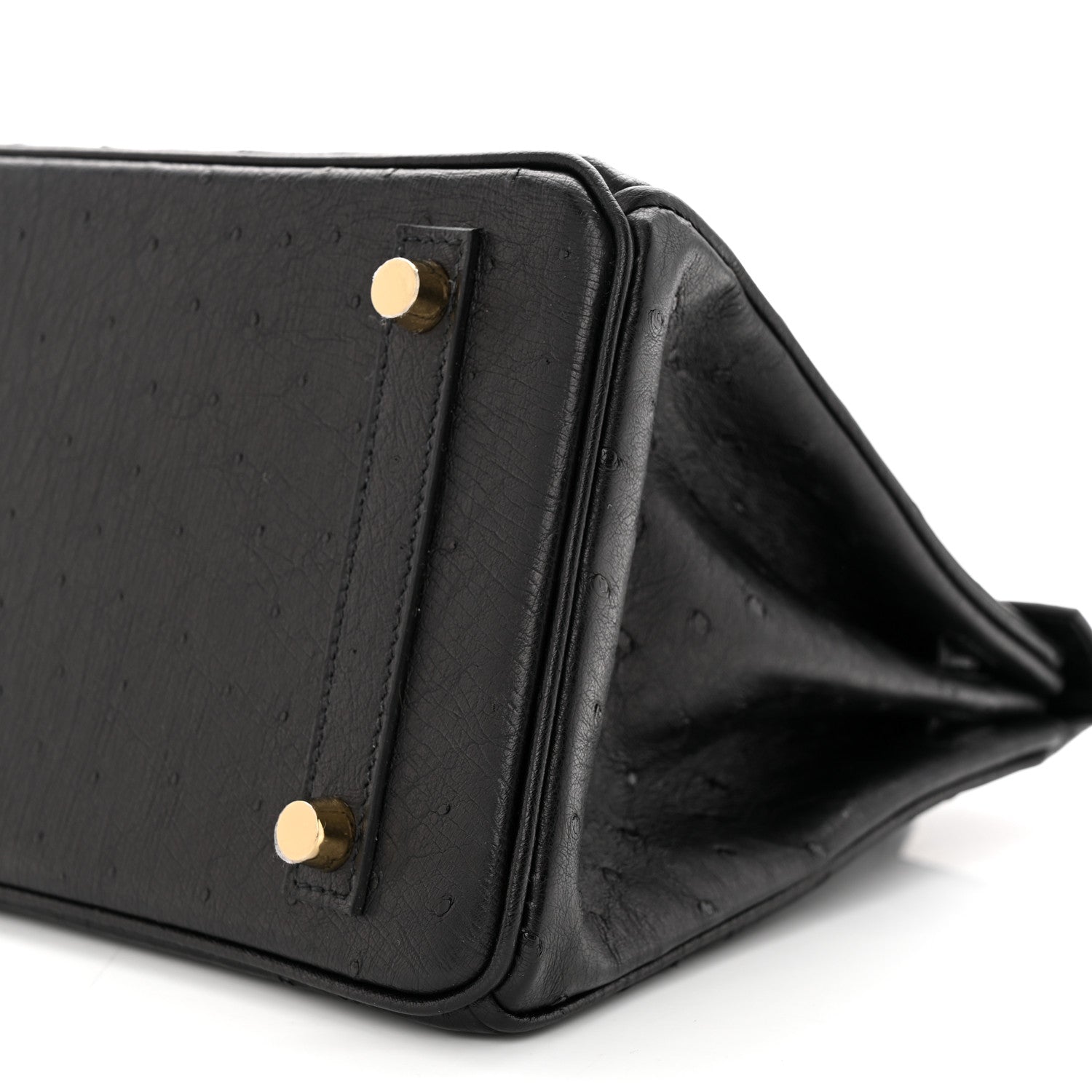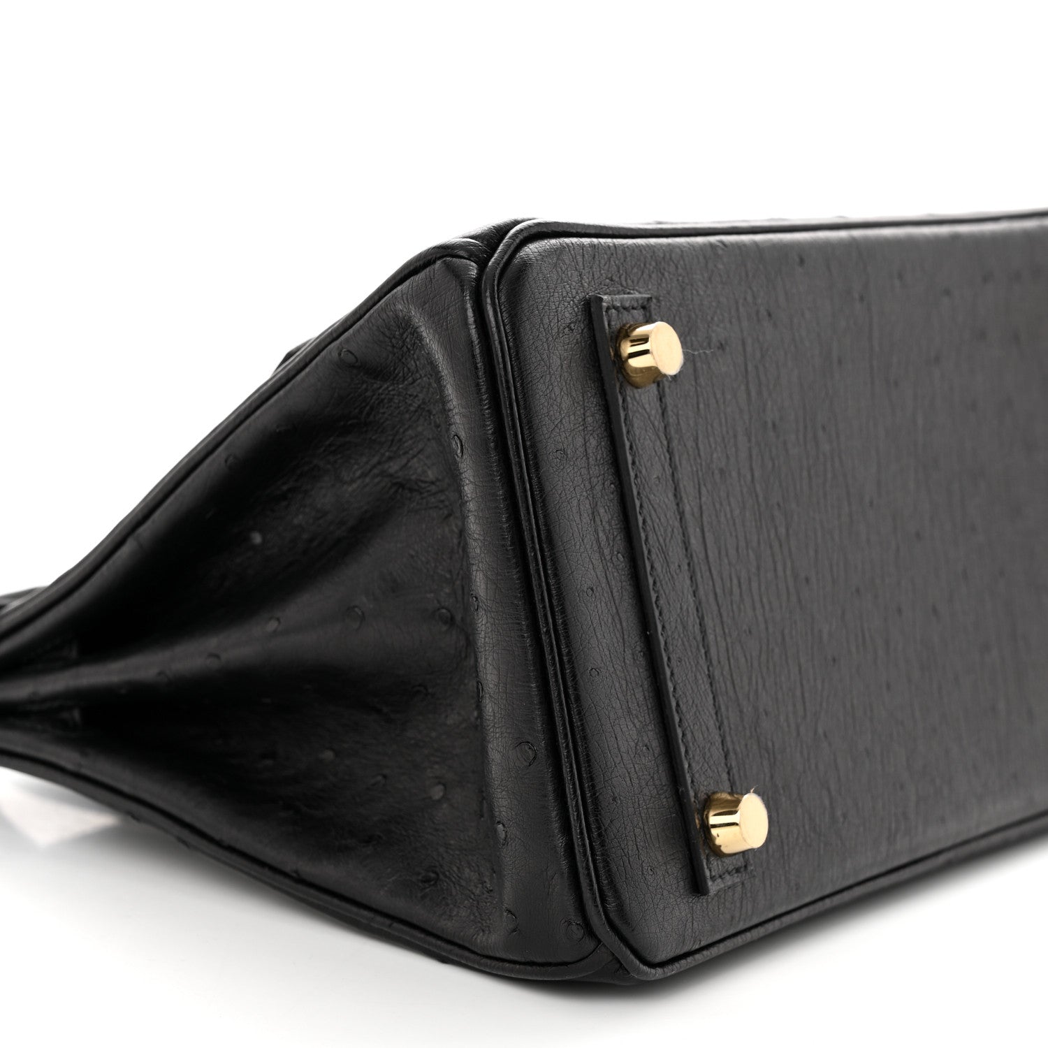 This is an authentic HERMES Ostrich Birkin 25 in Black. This chic handbag is expertly handcrafted of exotic ostrich leather in black. The bag features rolled leather top handles, a frontal flap with a strap closure with gold plated hardware, including a padlock. The top flap opens to a black leather interior with zipper and patch pockets.Follow this item for alerts. Hermes is a registered trademark of Hermes. FASHIONPHILE is not affiliated with Hermes.