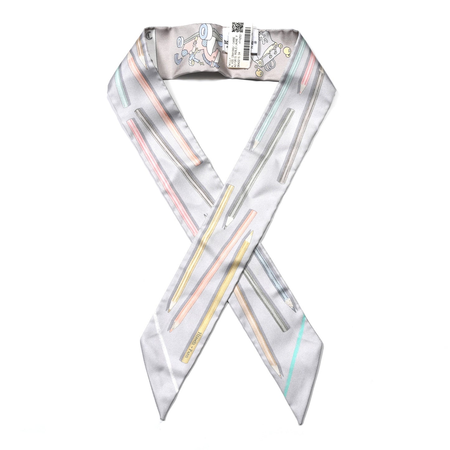 This is an authentic HERMES Silk A Vos Crayons Twilly in Gris Perle and Jaune Pale. This 100% fine silk bandeau scarf features different colored crayons.Follow this item for alerts. Hermes is a registered trademark of Hermes. FASHIONPHILE is not affiliated with Hermes.