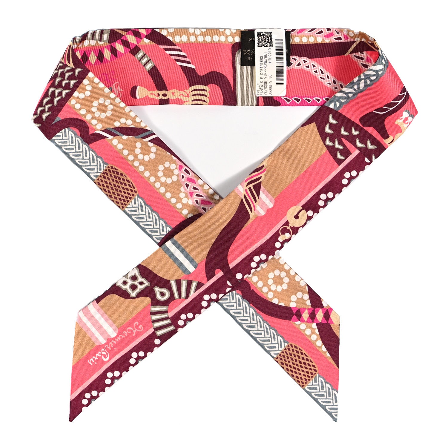 Hermes/ Accessories/ Scarves /Hermes Silk Fantaisie D'Etriers Twilly Rose Vif Prune Beige
