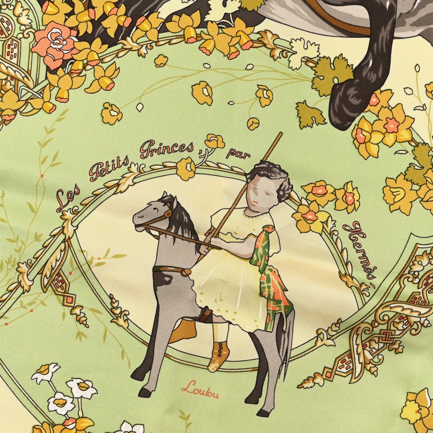 This is an authentic HERMES Silk Les Petits Princes Scarf 90. This scarf is 100% silk with an array of royal figures on a light green background.Follow this item for alerts. Hermes is a registered trademark of Hermes. FASHIONPHILE is not affiliated with Hermes.