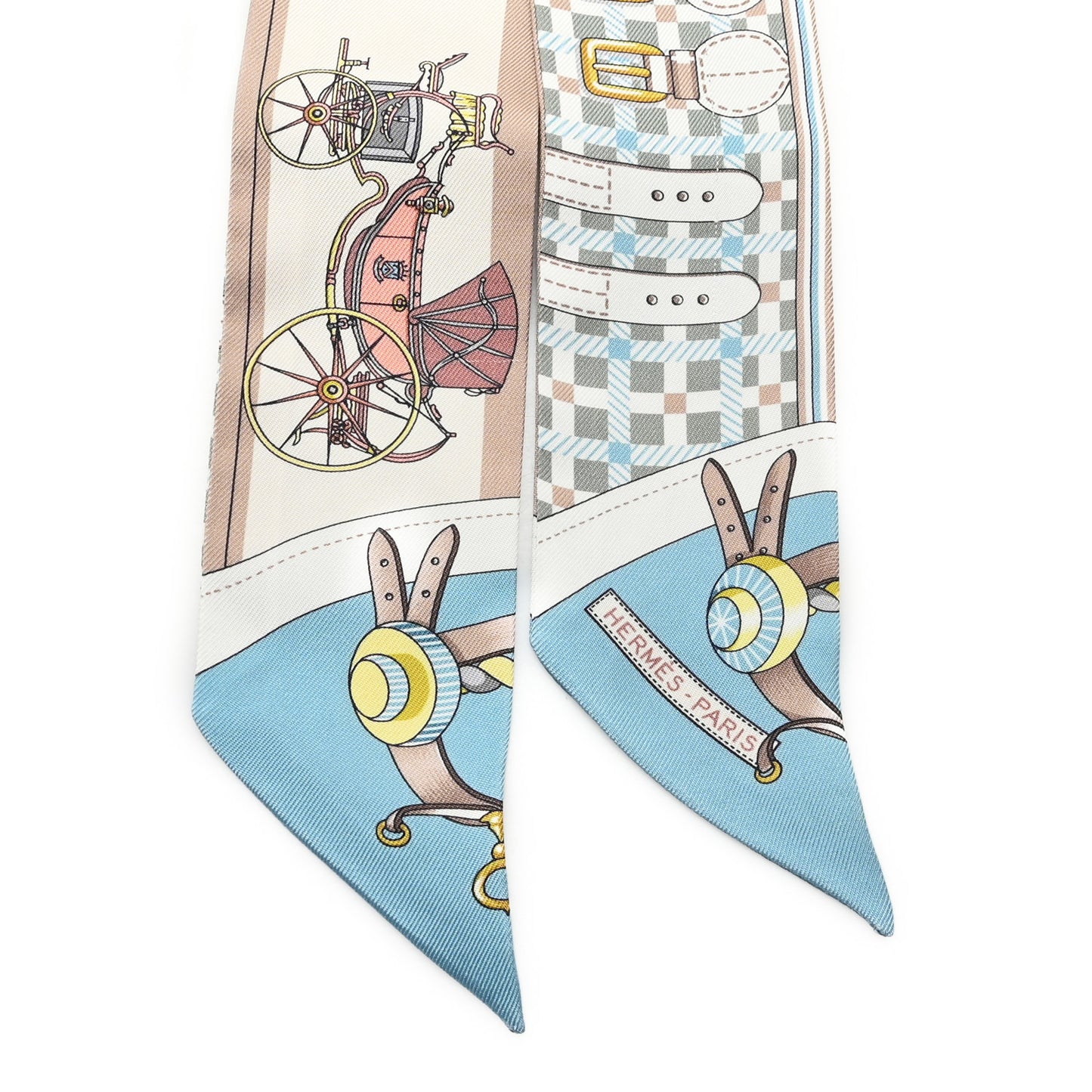 This is an authentic HERMES Silk Les Voitures Nouvelle Twilly in Vert Amande and Bleu Glacier. This 100% fine silk bandeau scarf features a vibrant carriage motif on a background with a multicolored pattern on the reverse.Follow this item for alerts. Hermes is a registered trademark of Hermes. FASHIONPHILE is not affiliated with Hermes.