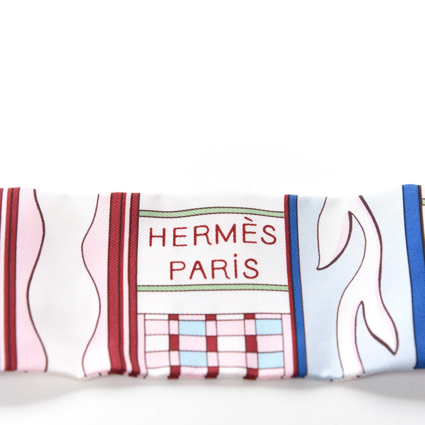 This is an authentic HERMES HERMES Silk Voltes Et Pirouettes Twilly in Rose Ciel Bordeaux. This stylish 100% silk twilly scarf has a pattern of blue, pink, and green.