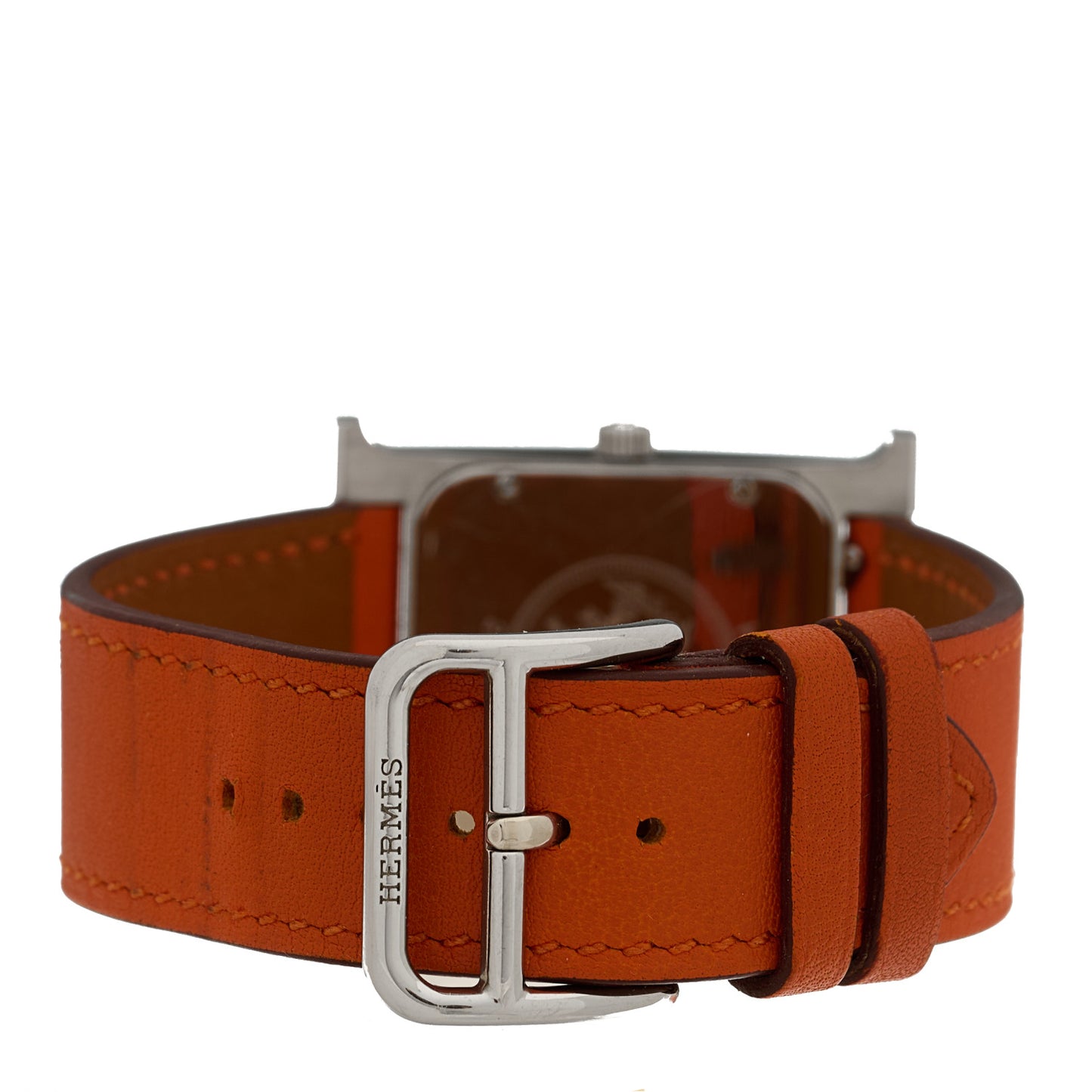 This is an authentic HERMES Stainless Steel Swift 26mm Heure H Hour Quartz Watch Orange. The watch is crafted of stainless steel and features a white dial, silver sword hands, sapphire crystal, orange calfskin strap, and a quartz movement.Follow this item for alerts. Hermes is a registered trademark of Hermes. FASHIONPHILE is not affiliated with Hermes.