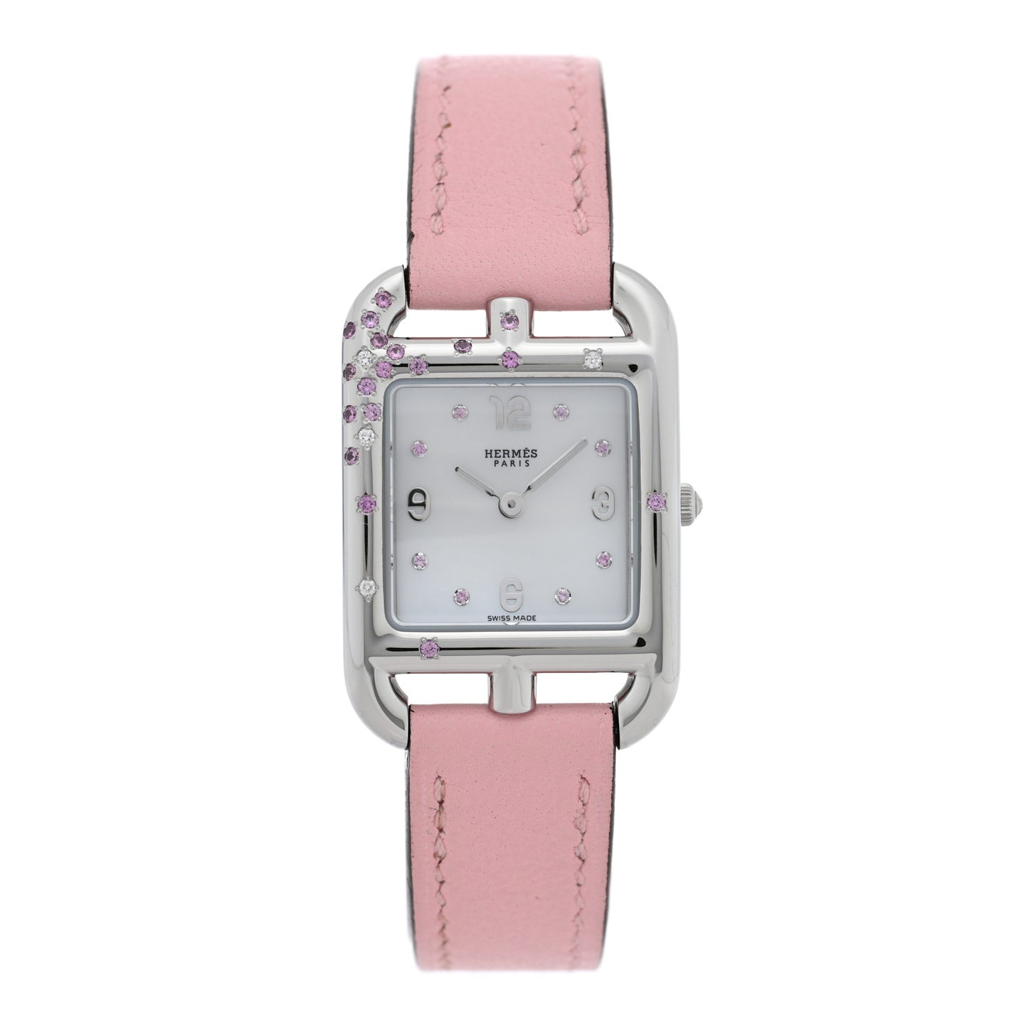 This is an authentic HERMES Stainless Steel Swift Diamond Pink Sapphire Mother of Pearl 23mm Cape Cod Quartz Watch Rose Sakura. The watch is crafted of stainless steel and features a mother of pearl dial, pink sapphire hour markers, diamond and pink sapphire bezel, pink calfskin strap, sapphire crystal, and a quartz movement.Follow this item for alerts. Hermes is a registered trademark of Hermes. FASHIONPHILE is not affiliated with Hermes.