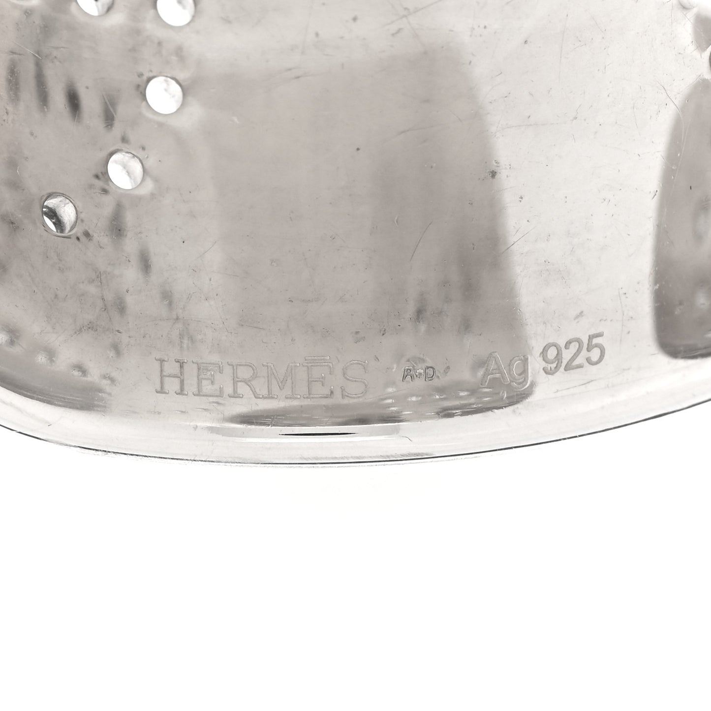 This is an authentic HERMES Sterling Silver Eclipse Cuff, size Large. This striking wide cuff bracelet is crafted of genuine sterling silver and features a perforated H design, reminiscent of the Evelyne handbag. This is a marvelous open bracelet with the signature style only from Hermes!Follow this item for alerts. Hermes is a registered trademark of Hermes. FASHIONPHILE is not affiliated with Hermes.