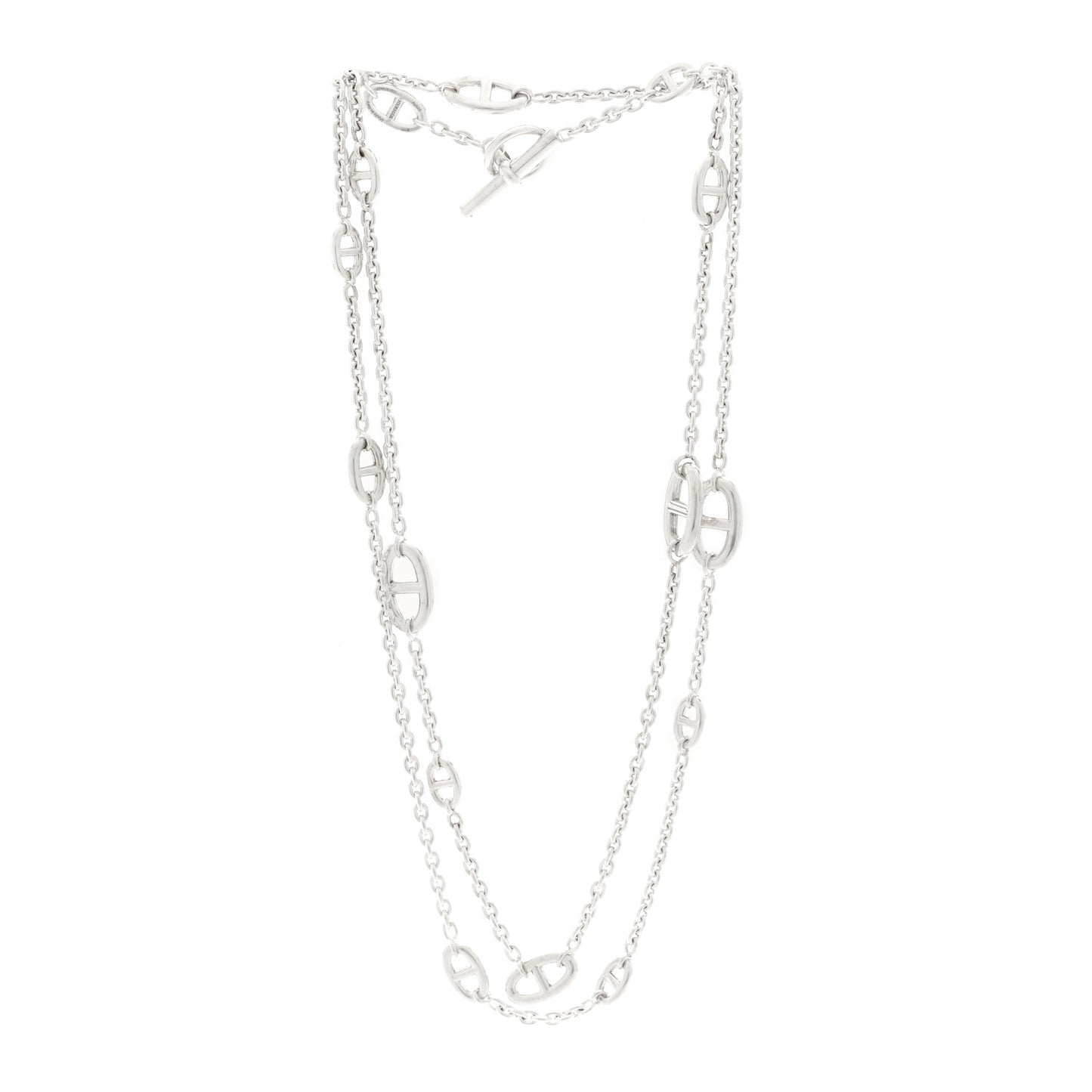 This is an authentic HERMES Sterling Silver Farandole Necklace 120. The necklace is crafted of sterling silver and features Chaine d' Ancre links in various sizes throughout the chain.Follow this item for alerts. Hermes is a registered trademark of Hermes. FASHIONPHILE is not affiliated with Hermes.