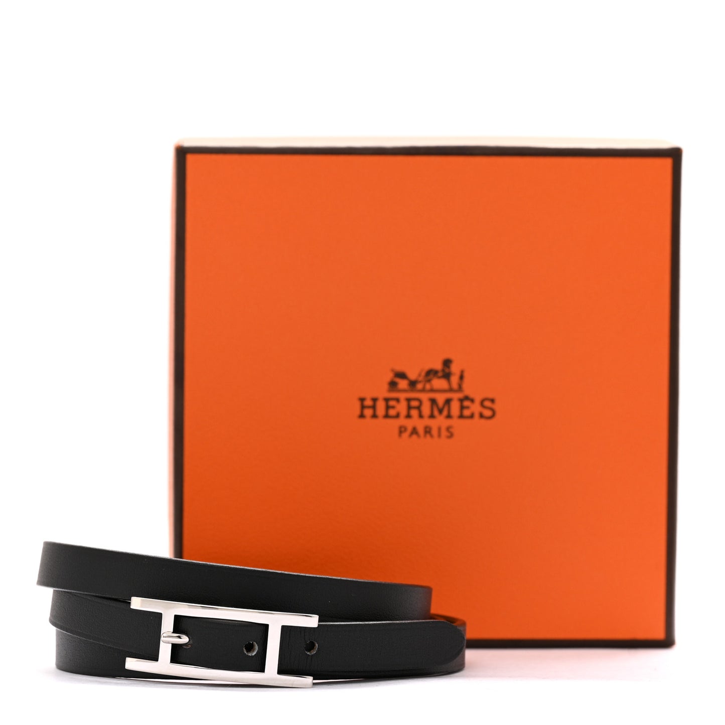 This is an authentic HERMES Swift Behapi Double Tour Bracelet Size S in Black. The bracelet is a long strap of black swift calfskin leather that wraps around the wrist two times and closes with a palladium-plated Hermes H buckle. It is reversible to calfskin in a shade of brown.Follow this item for alerts. Hermes is a registered trademark of Hermes. FASHIONPHILE is not affiliated with Hermes.
