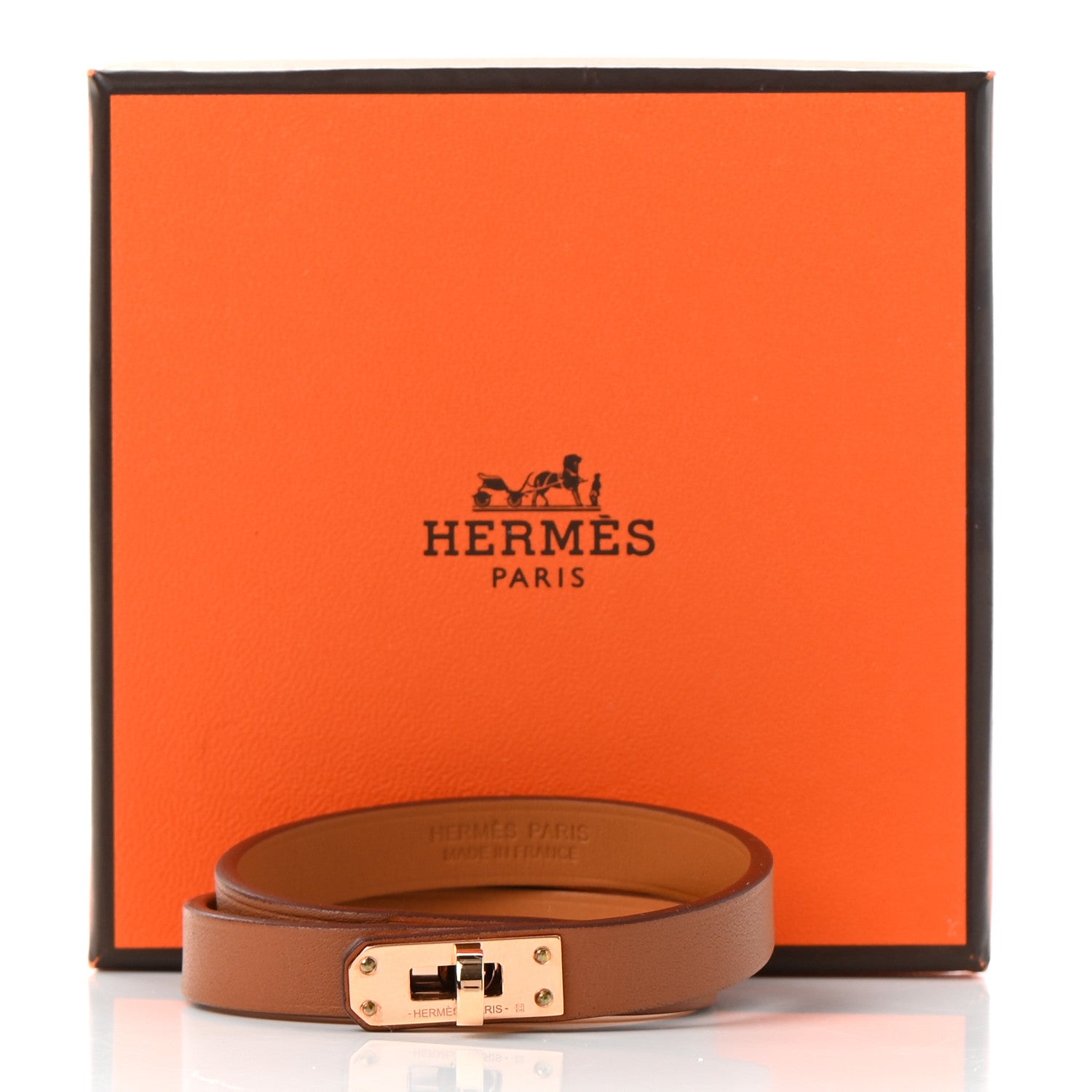 This is an authentic HERMES Swift Kelly Double Tour Bracelet T2 in Gold. This bracelet is crafted of soft calfskin leather in brown with a rose gold plated signature Kelly turn lock. This bracelet wraps around the wrist twice for a "double tour".Follow this item for alerts. Hermes is a registered trademark of Hermes. FASHIONPHILE is not affiliated with Hermes.