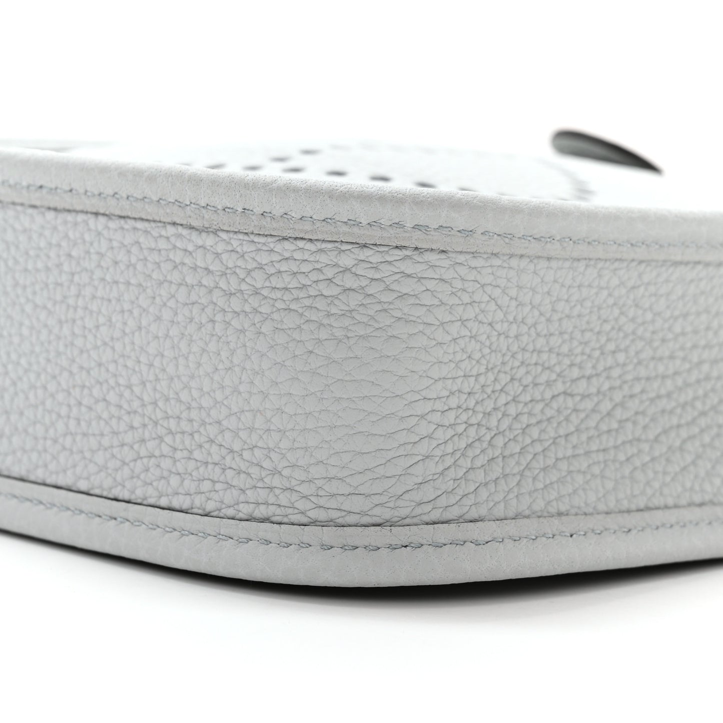 This is an authentic HERMES Taurillon Clemence Amazone Evelyne TPM in Bleu Pale and Nata. This stylish small messenger bag is crafted of textured Taurillon Clemence calfskin leather in very light blue. It features a perforated Hermes H oval, a cream colored canvas crossbody strap and gold plated hardware. The bag opens with a crossover strap to a suede interior.Follow this item for alerts. Hermes is a registered trademark of Hermes. FASHIONPHILE is not affiliated with Hermes.