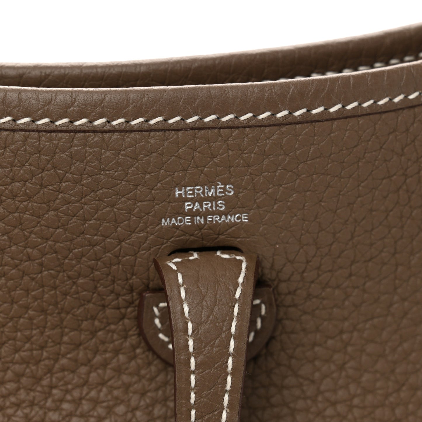 This is an authentic HERMES Taurillon Clemence Amazone Evelyne TPM in Etoupe and Bleu Indigo. This small chic messenger bag is crafted of rich taurillon clemence calfskin leather in taupe. The shoulder bag features a dark blue canvas body strap, silver plated hardware, and a perforated Hermes H oval logo. The top of the bag opens with a crossover strap to a matching suede interior.Follow this item for alerts. Hermes is a registered trademark of Hermes. FASHIONPHILE is not affiliated with Hermes.