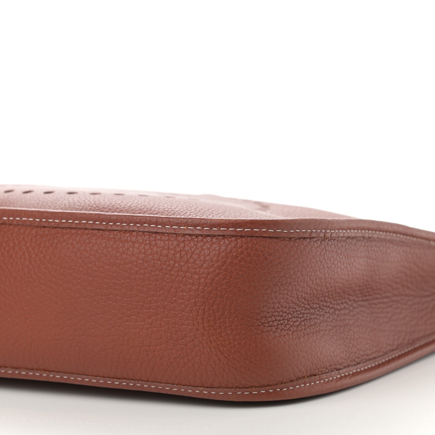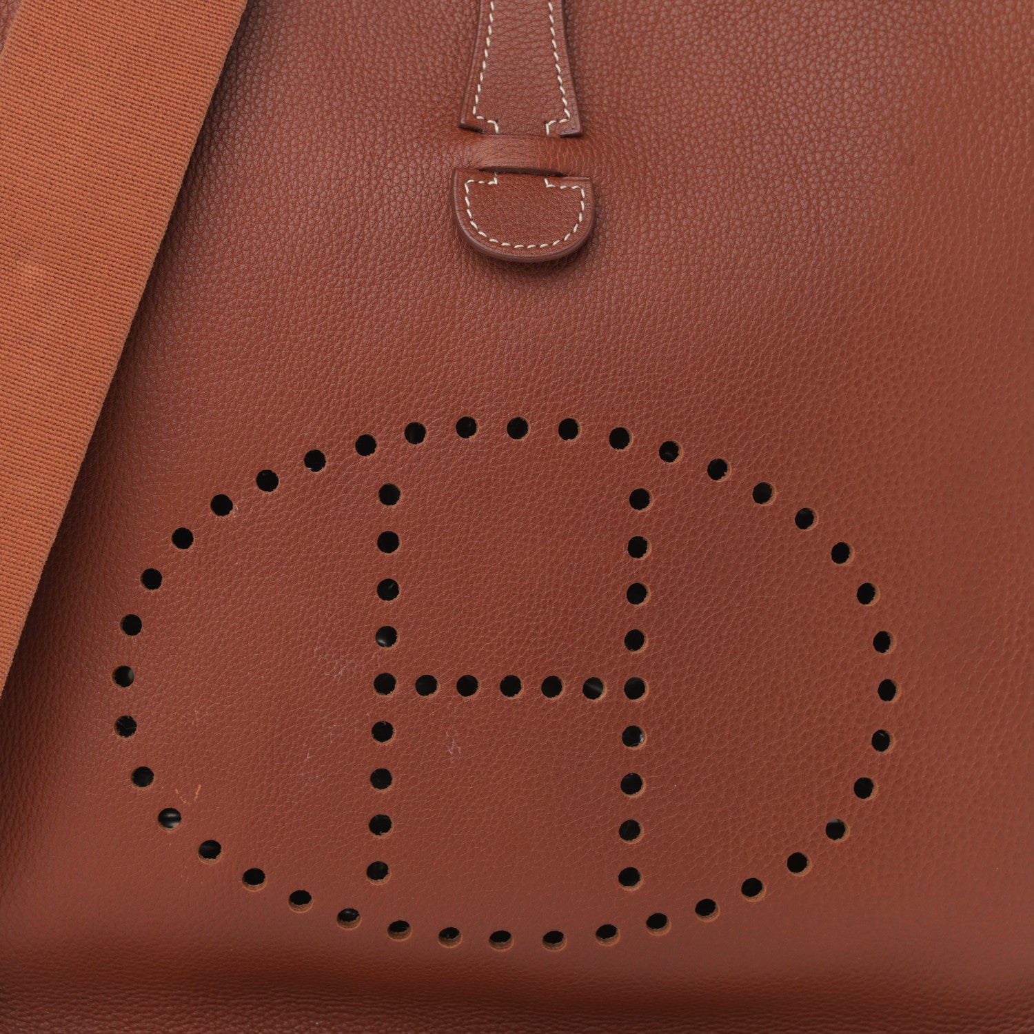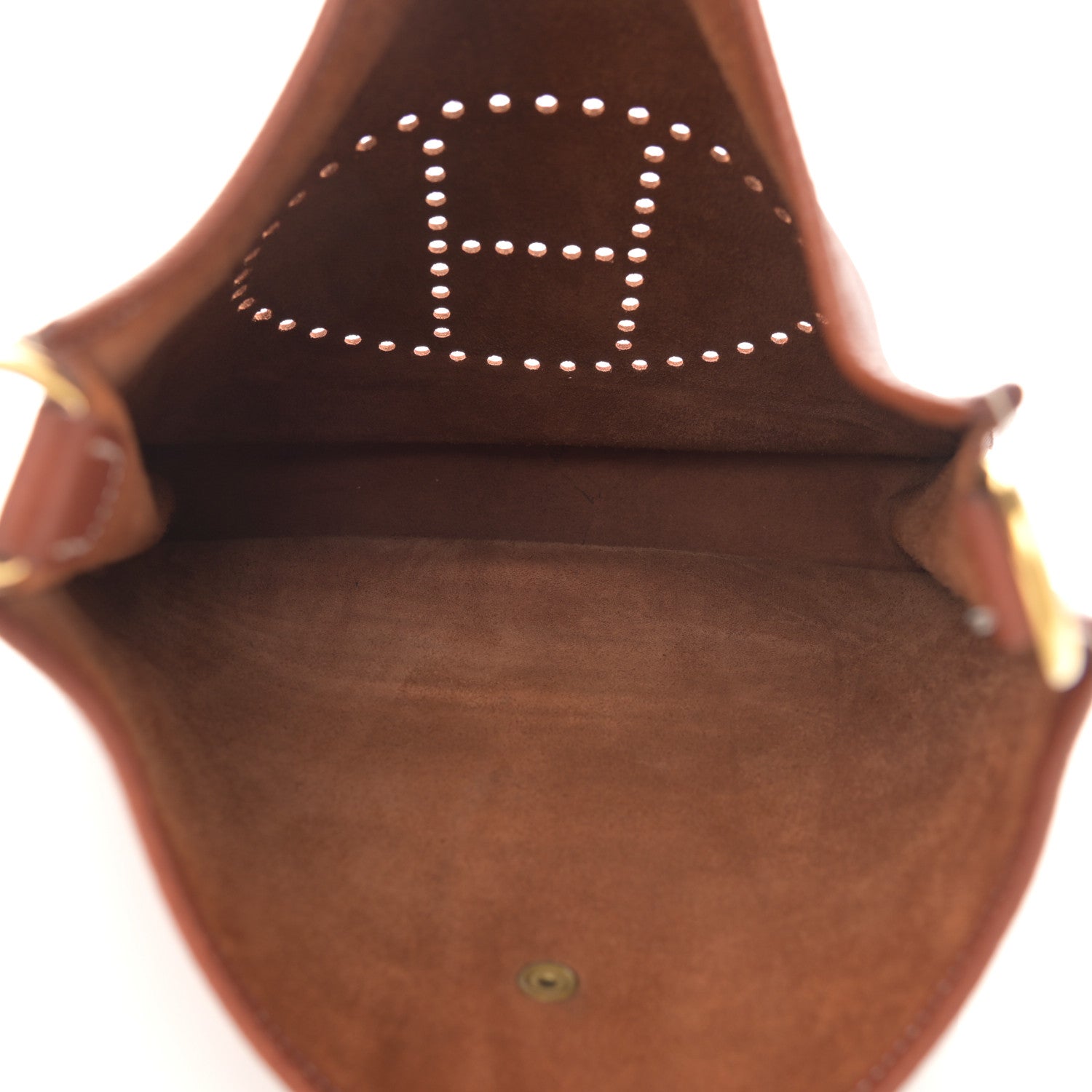 This is an authentic HERMES Taurillon Clemence Evelyne GM in Gold. This stylish messenger bag is crafted of fine Taurillon Clemence calfskin leather in golden brown and features a matching canvas shoulder strap, gold hardware, and a perforated Hermes H oval on the front of the bag. The top of the bag opens with a cross over strap to a matching suede interior.Follow this item for alerts. Hermes is a registered trademark of Hermes. FASHIONPHILE is not affiliated with Hermes.
