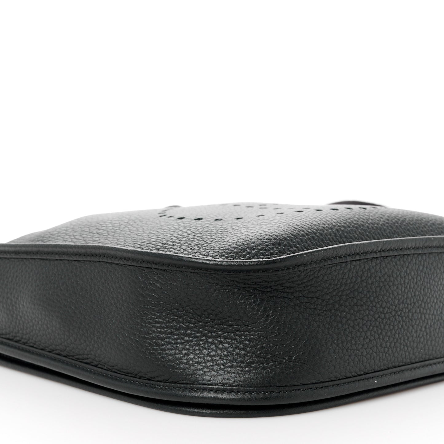 This is an authentic HERMES Taurillon Clemence Evelyne II PM in Black. This stylish crossbody bag is finely crafted of clemence calfskin leather in black. The shoulder bag features a black canvas strap, a front perforated Hermes H, a rear patch pocket polished palladium hardware including clasps for the adjustable shoulder strap. The top opens to a matching suede interior.Follow this item for alerts. Hermes is a registered trademark of Hermes. FASHIONPHILE is not affiliated with Hermes.