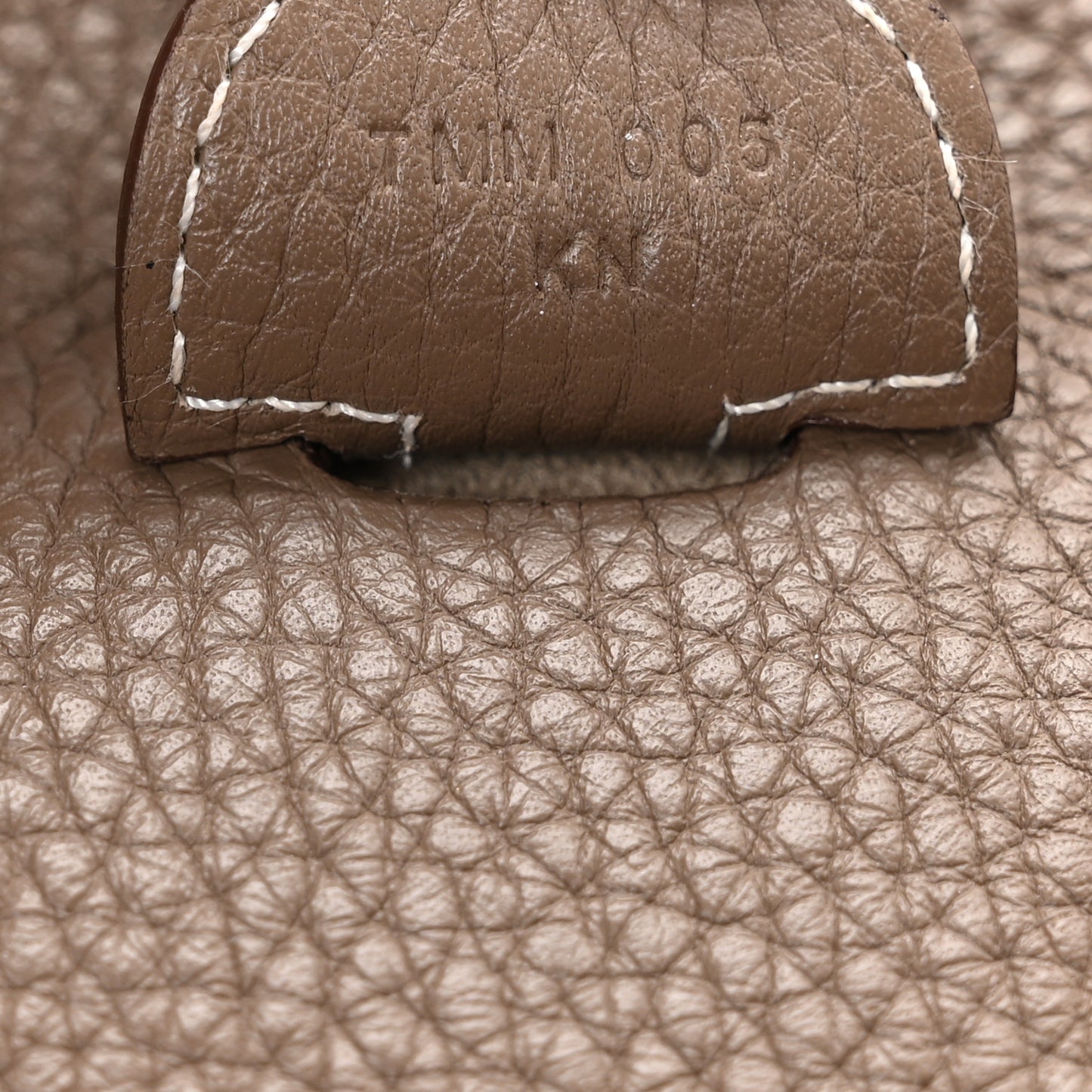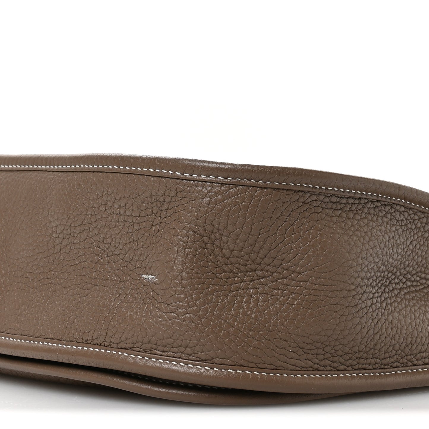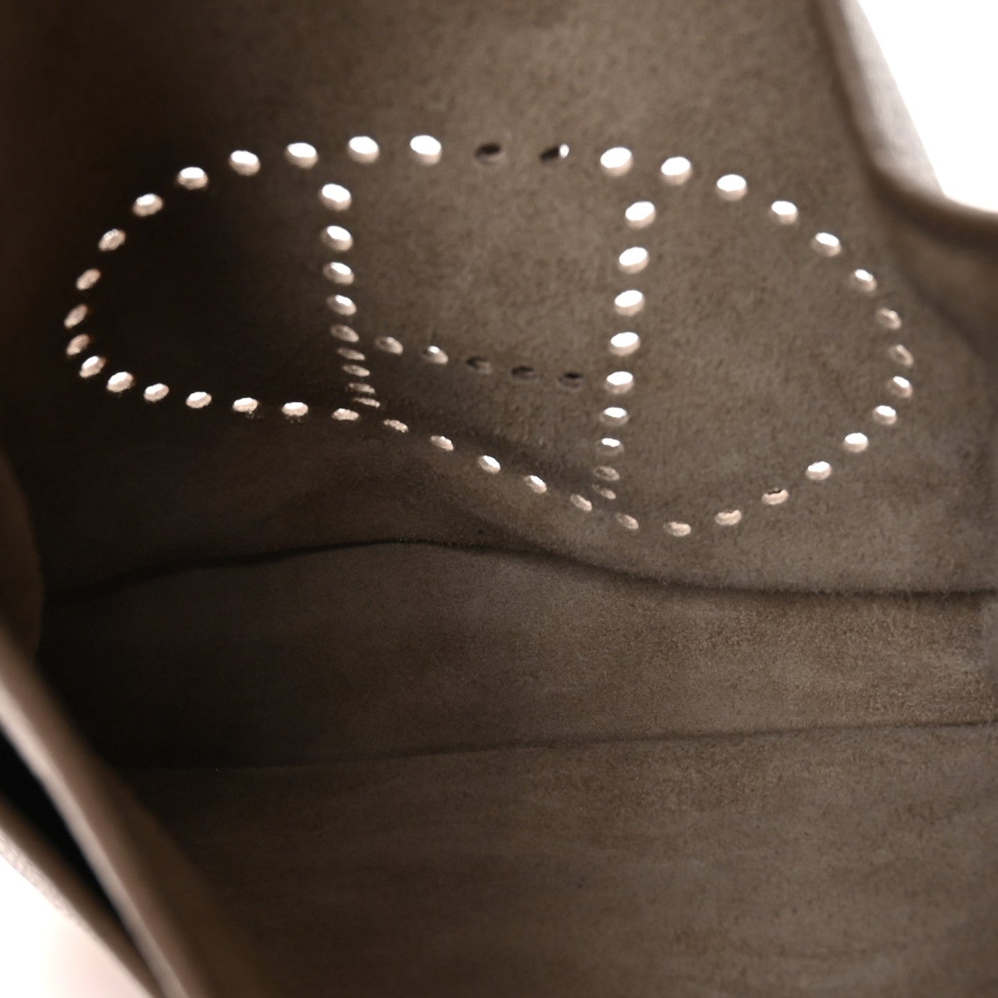 This is an authentic HERMES Taurillon Clemence Evelyne III PM in Etoupe. This bag is crafted of taupe calfskin leather with a perforated Hermes H oval logo on the front. The bag features an adjustable fabric shoulder strap and an exterior flat pocket. The top opens to a matching suede interior.Follow this item for alerts. Hermes is a registered trademark of Hermes. FASHIONPHILE is not affiliated with Hermes.