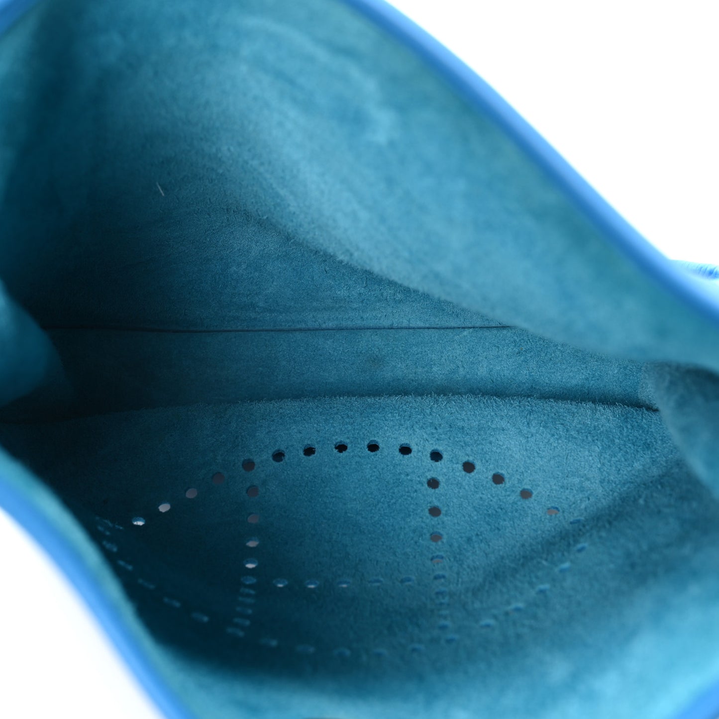 This is an authentic HERMES Taurillon Clemence Evelyne III PM in Bleu Zanzibar. This stylish crossbody bag is finely crafted of Clemence calfskin leather in light blue. It features an adjustable canvas crossbody strap with polished palladium hardware, a perforated Hermes H oval logo on the front, and a patch pocket on the back. The top is open to a matching blue suede interior.Follow this item for alerts. Hermes is a registered trademark of Hermes. FASHIONPHILE is not affiliated with Hermes.