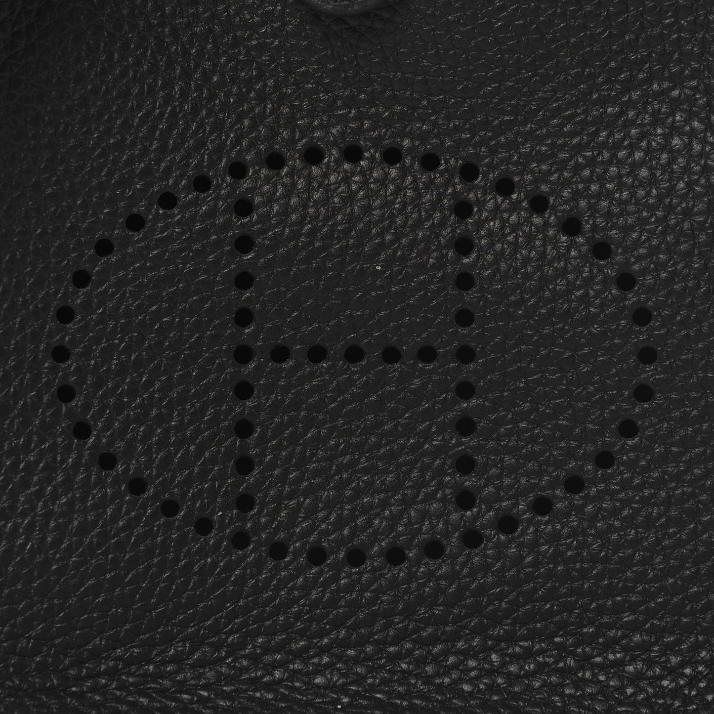 This is an authentic HERMES Taurillon Clemence Evelyne TPM in Black. This classic small shoulder bag is crafted from Clemence calfskin leather in black, featuring a front perforated Hermes "H" oval. The crossbody bag features a black canvas shoulder strap with palladium hardware. The top crossover strap and snap open to an interior of black suede.Follow this item for alerts. Hermes is a registered trademark of Hermes. FASHIONPHILE is not affiliated with Hermes.