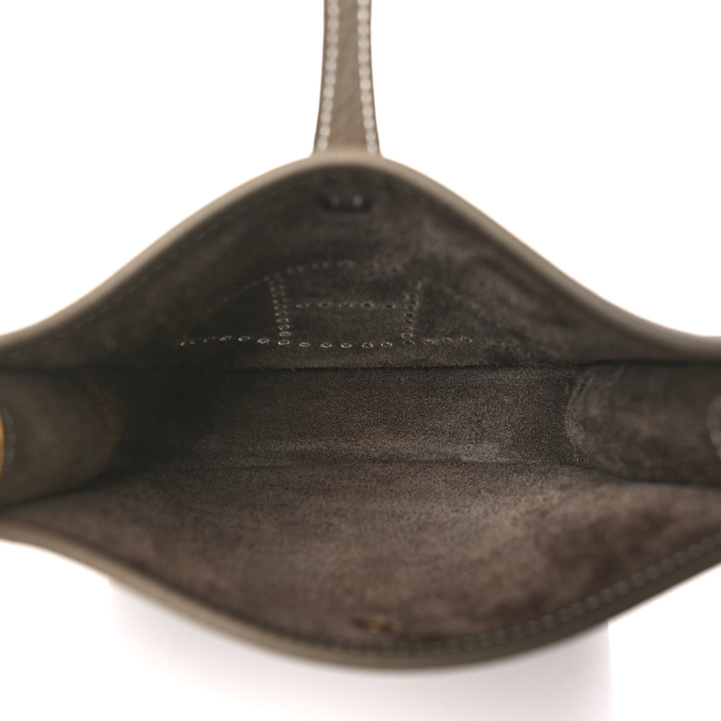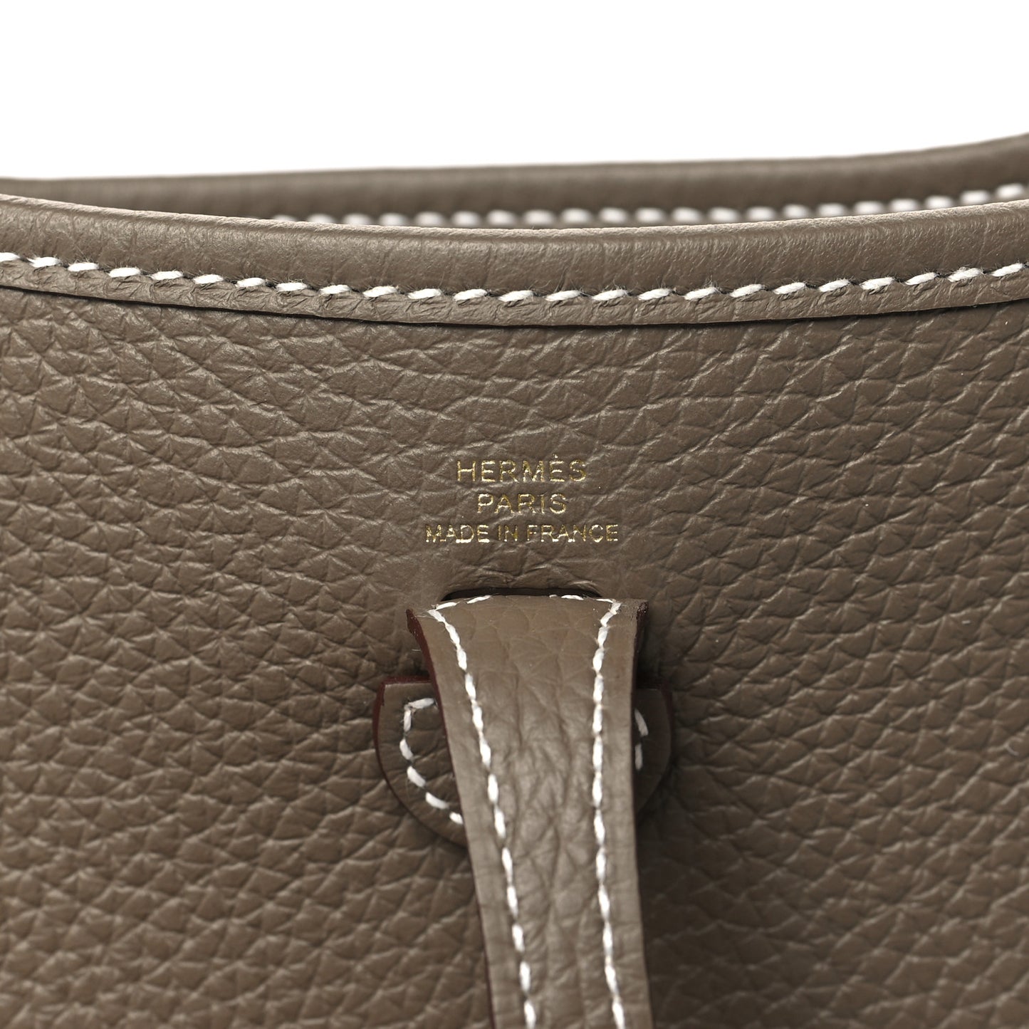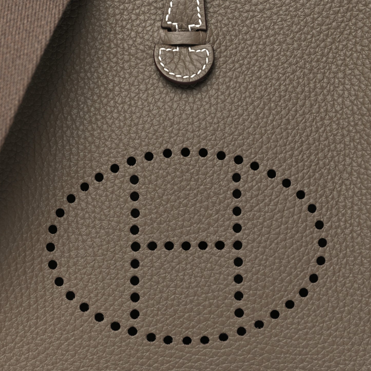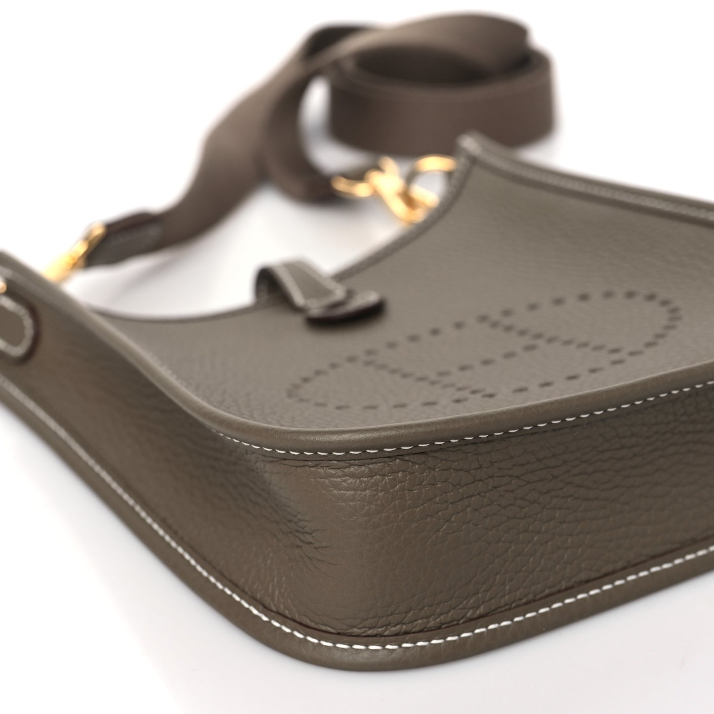 This is an authentic HERMES Taurillon Clemence Evelyne TPM in Etoupe. This small chic messenger bag is crafted of rich taurillon clemence calfskin leather in brown. The shoulder bag features a canvas body strap, gold plated hardware, and a perforated Hermes H oval logo. The top of the bag opens with a crossover strap to a matching suede interior.Follow this item for alerts. Hermes is a registered trademark of Hermes. FASHIONPHILE is not affiliated with Hermes.