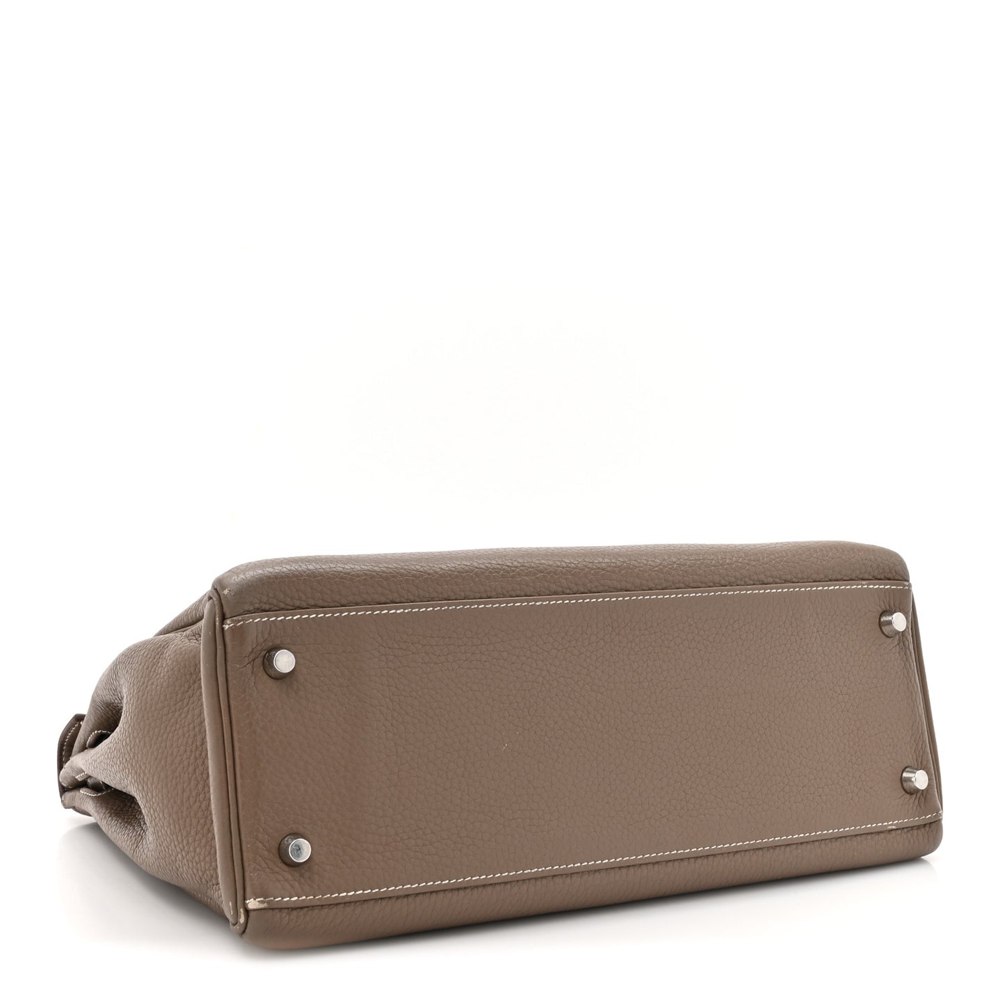 This is an authentic HERMES Taurillon Clemence Kelly Retourne 32 in Etoupe. This Kelly handbag is crafted of richly textured calfskin leather in taupe grey. It features a reinforced leather top handle with silver hardware links, an optional leather shoulder strap, a crossover flap, and a strap closure with a signature Kelly turn lock and padlock in a palladium tone. The flap opens to a chevre leather interior with a zipper and patch pockets.Follow this item for alerts. Hermes is a registered trademark of Hermes. FASHIONPHILE is not affiliated with Hermes.