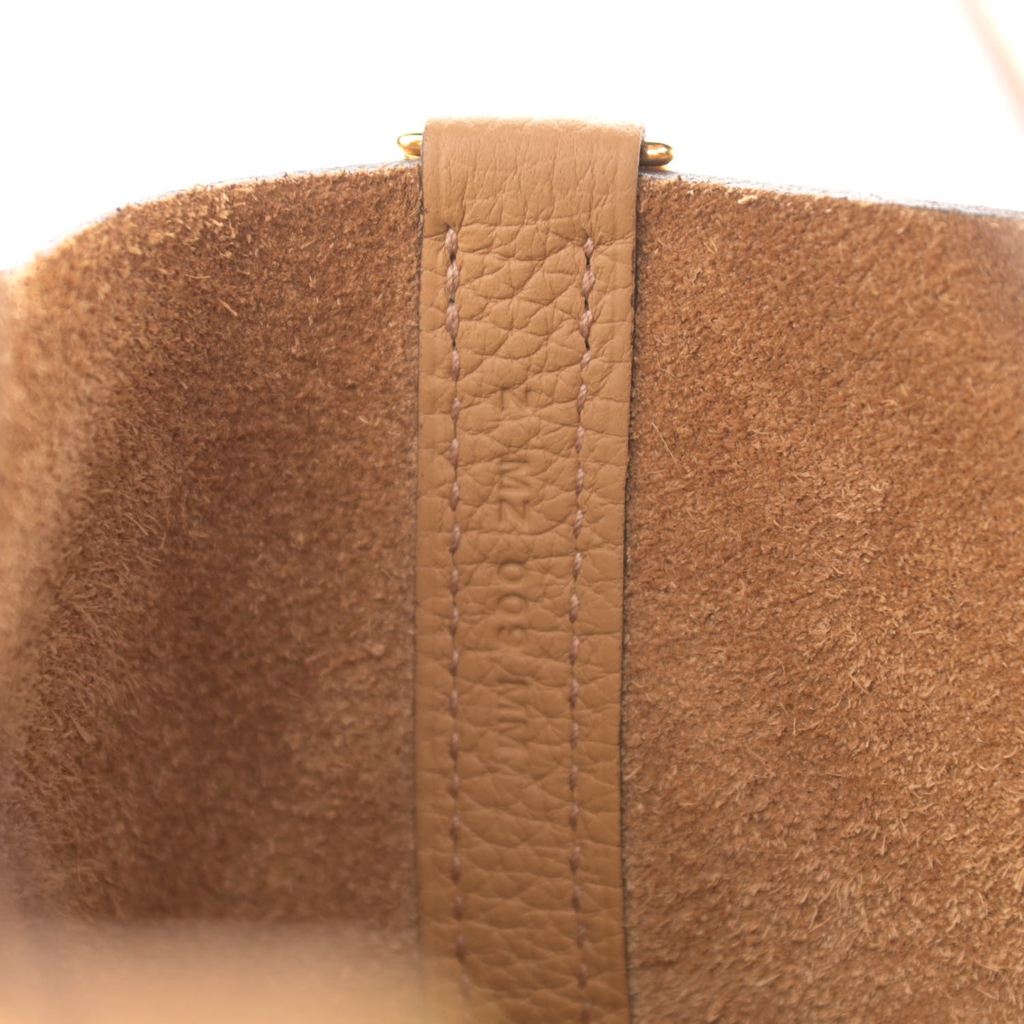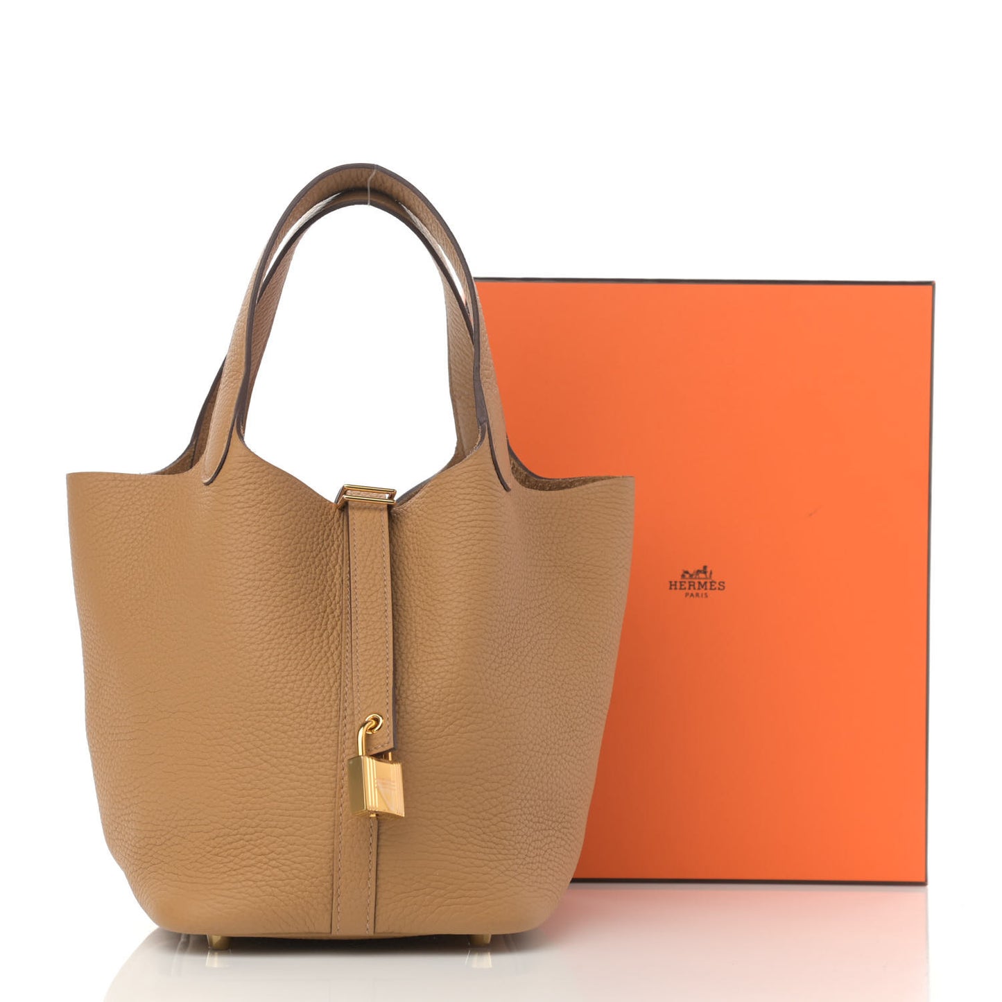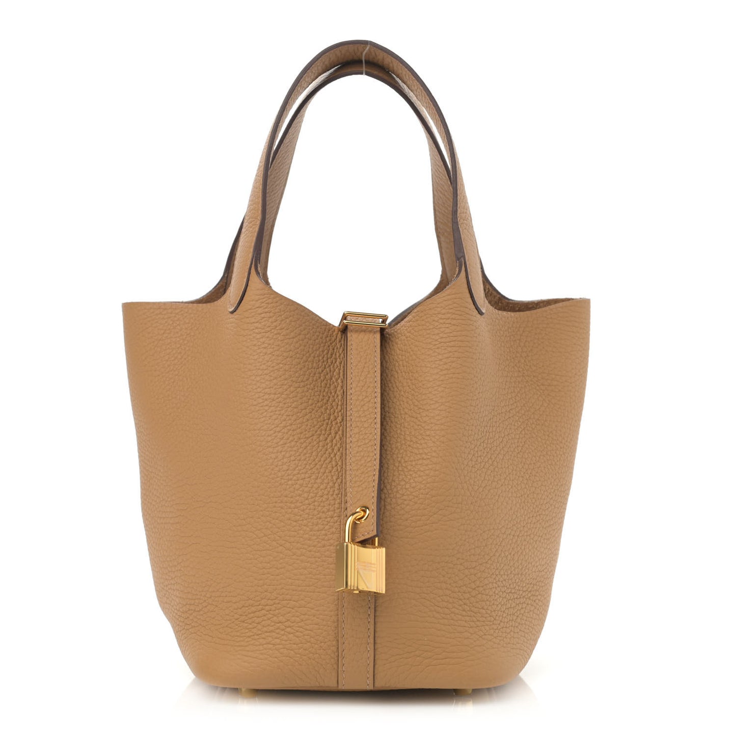 This is an authentic HERMES Taurillon Clemence Picotin Lock 18 PM in Biscuit. This chic tote is crafted of textured calfskin leather in brown. This bucket style bag features a unique one piece reinforced design with leather top handles and a closure strap that is secured by a polished gold plated padlock. This opens to a spacious matching suede interior.Follow this item for alerts. Hermes is a registered trademark of Hermes. FASHIONPHILE is not affiliated with Hermes.