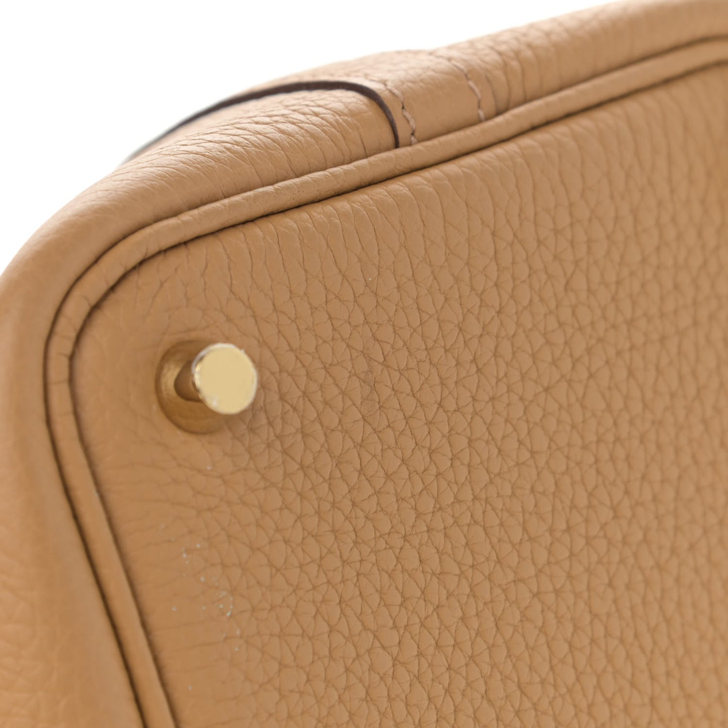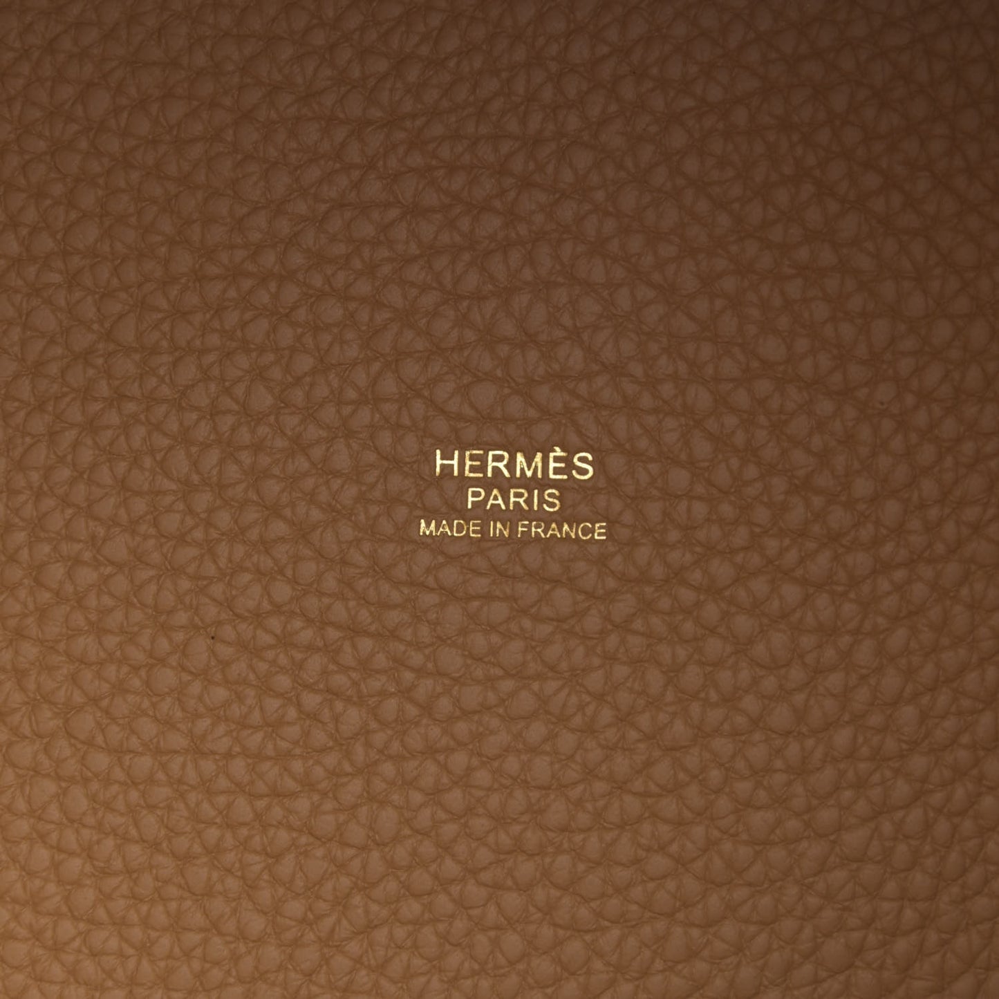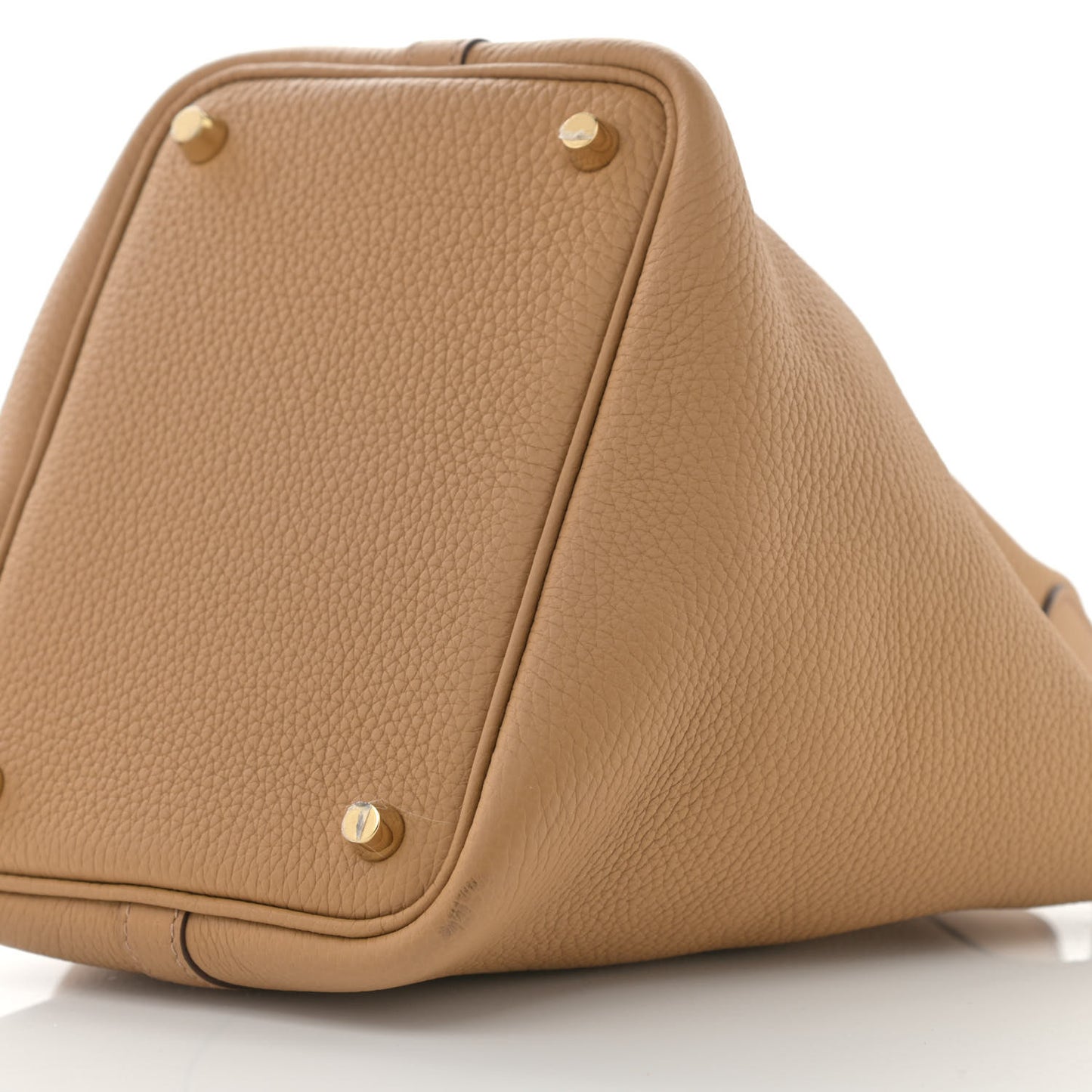 This is an authentic HERMES Taurillon Clemence Picotin Lock 18 PM in Biscuit. This chic tote is crafted of textured calfskin leather in brown. This bucket style bag features a unique one piece reinforced design with leather top handles and a closure strap that is secured by a polished gold plated padlock. This opens to a spacious matching suede interior.Follow this item for alerts. Hermes is a registered trademark of Hermes. FASHIONPHILE is not affiliated with Hermes.