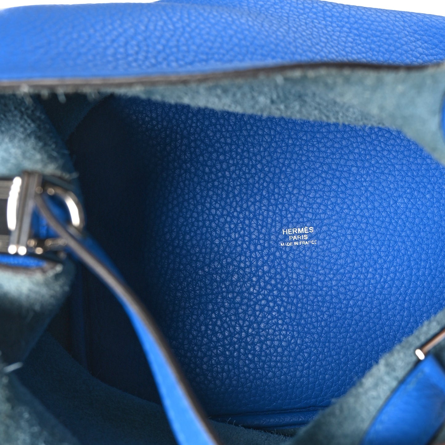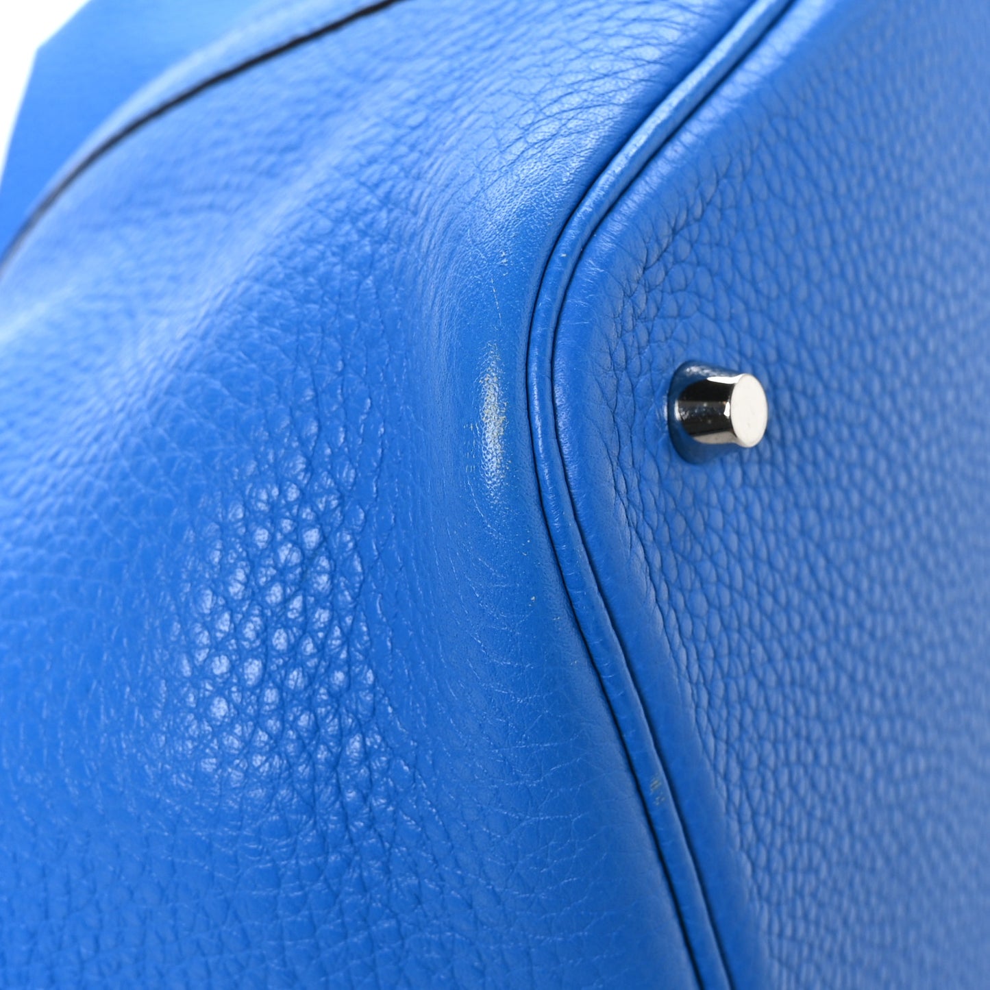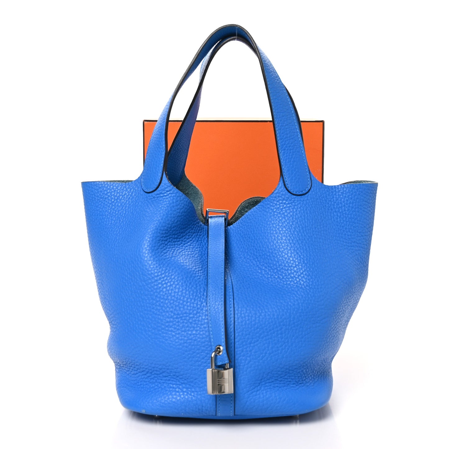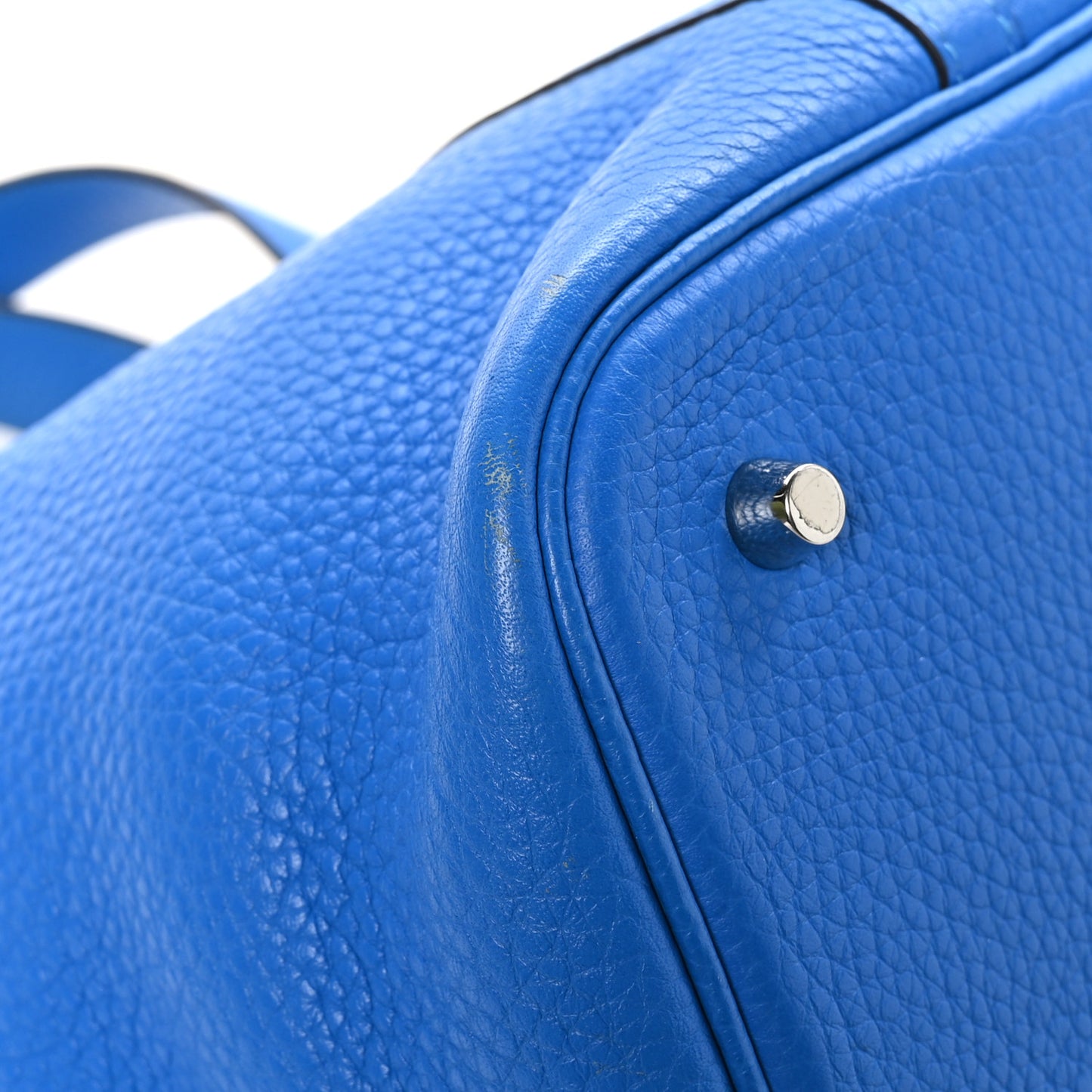 This is an authentic HERMES Taurillon Clemence Picotin Lock 22 MM in Blue Hydra. This chic tote is crafted of textured clemence calfskin leather in bright blue. This bucket style bag features a unique one piece reinforced design with leather top handles and a closure strap that can be secured by a polished palladium padlock. This opens to a spacious blue suede interior.Follow this item for alerts. Hermes is a registered trademark of Hermes. FASHIONPHILE is not affiliated with Hermes.