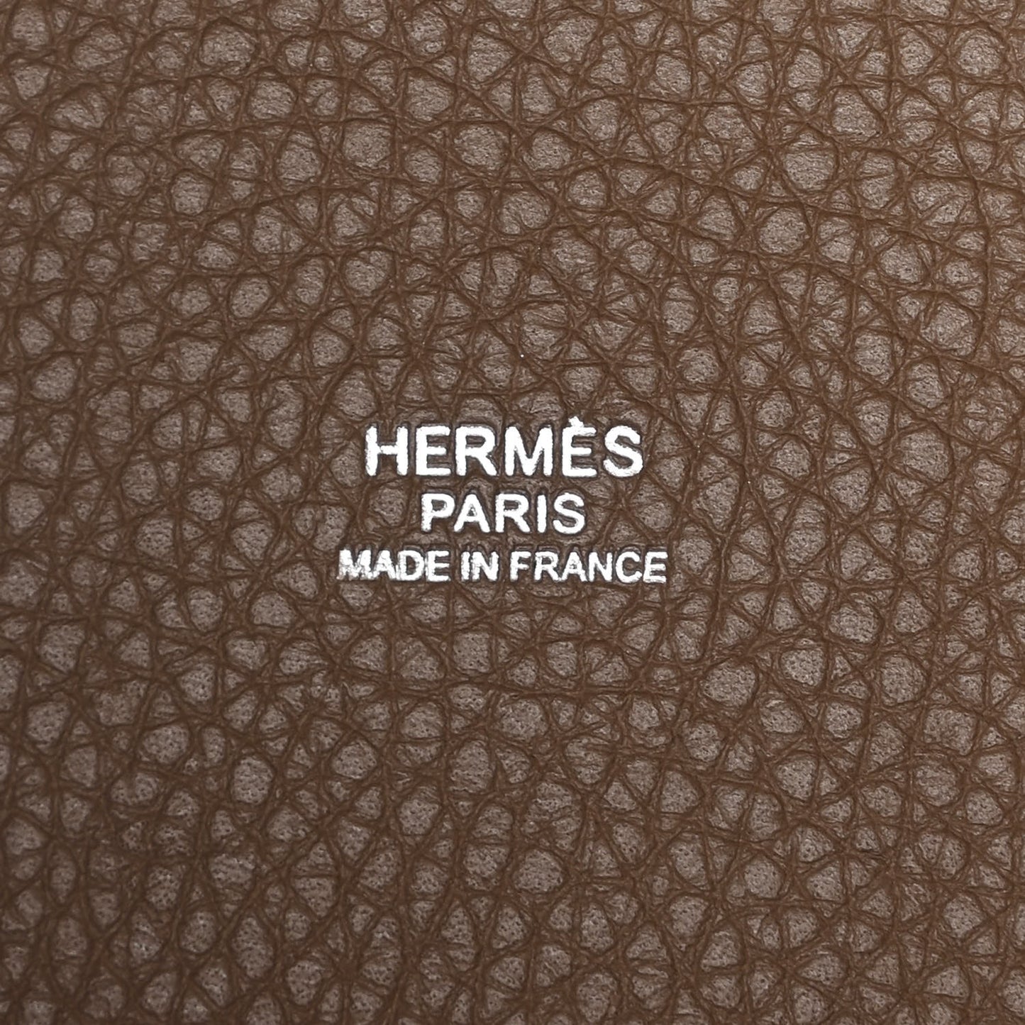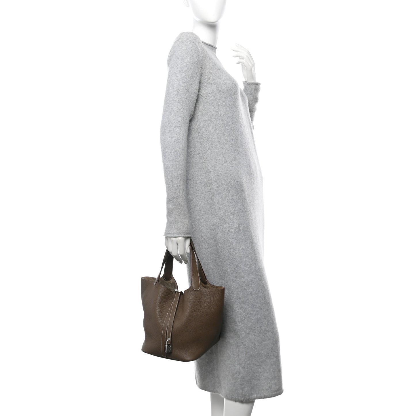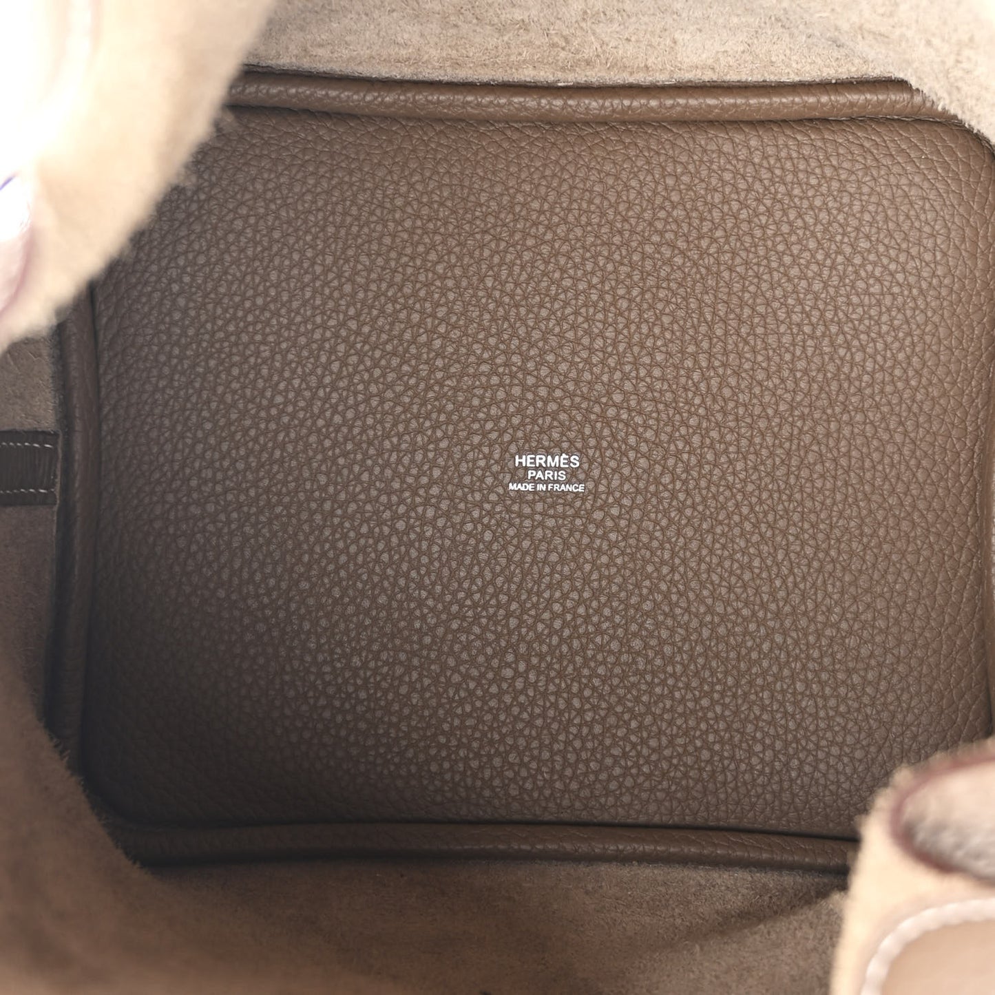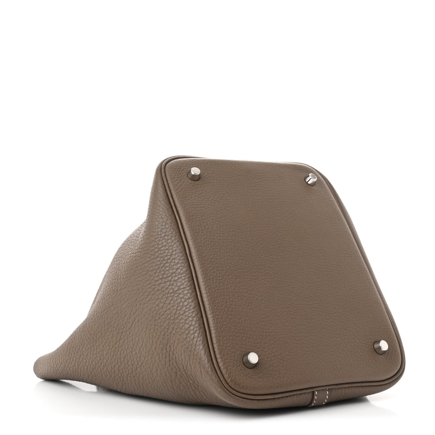 This is an authentic HERMES Taurillon Clemence Picotin Lock 22 MM in Etoupe. This stunning tote is crafted of luxuriously soft Clemence calfskin leather in taupe, in a relaxed bucket style, with polished palladium hardware. The bag features a unique one-piece reinforced design with leather top handles and a thin cross-over strap. The top is open to a matching suede interior.Follow this item for alerts. Hermes is a registered trademark of Hermes. FASHIONPHILE is not affiliated with Hermes.