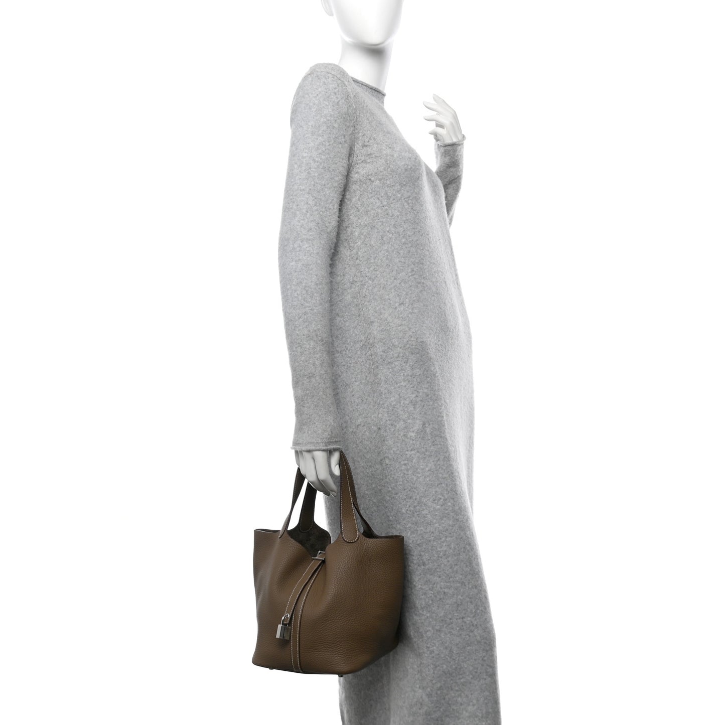 This is an authentic HERMES Taurillon Clemence Picotin Lock 22 MM in Etoupe. This stunning tote is crafted of luxuriously soft Clemence calfskin leather in taupe, in a relaxed bucket style, with polished palladium hardware. The bag features a unique one-piece reinforced design with leather top handles and a thin cross-over strap. The top is open to a matching suede interior.Follow this item for alerts. Hermes is a registered trademark of Hermes. FASHIONPHILE is not affiliated with Hermes.