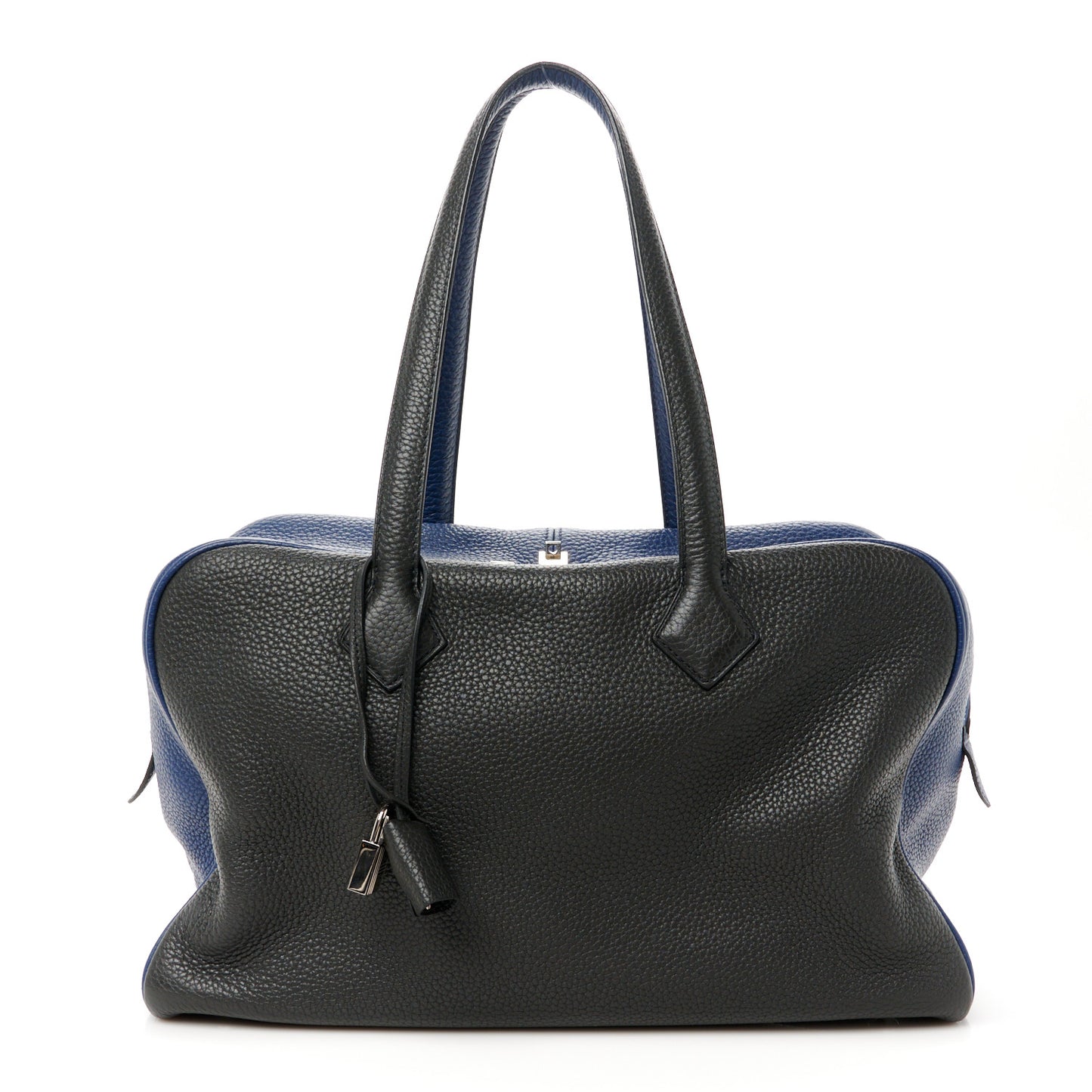 This is an authentic HERMES Taurillon Clemence Victoria II 35 in Black and Bleu De Malte. This stylish bag is crafted of grained calfskin leather. It features tall leather shoulder straps and palladium hardware. The top zipper opens to a herringbone fabric interior with zipper and patch pockets.Follow this item for alerts. Hermes is a registered trademark of Hermes. FASHIONPHILE is not affiliated with Hermes.