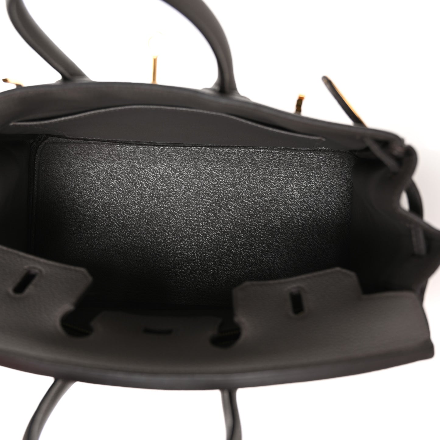 This is an authentic HERMES Togo Birkin 25 in Etain. This iconic handbag is handcrafted of togo leather in dark grey. It features rolled leather top handles, a short flap, and a cinch-style strap closure with gold hardware, secured by a signature turn-lock and optional padlock. The flap opens to a matching chevre goatskin leather interior with a zipper and patch pockets.Follow this item for alerts. Hermes is a registered trademark of Hermes. FASHIONPHILE is not affiliated with Hermes.