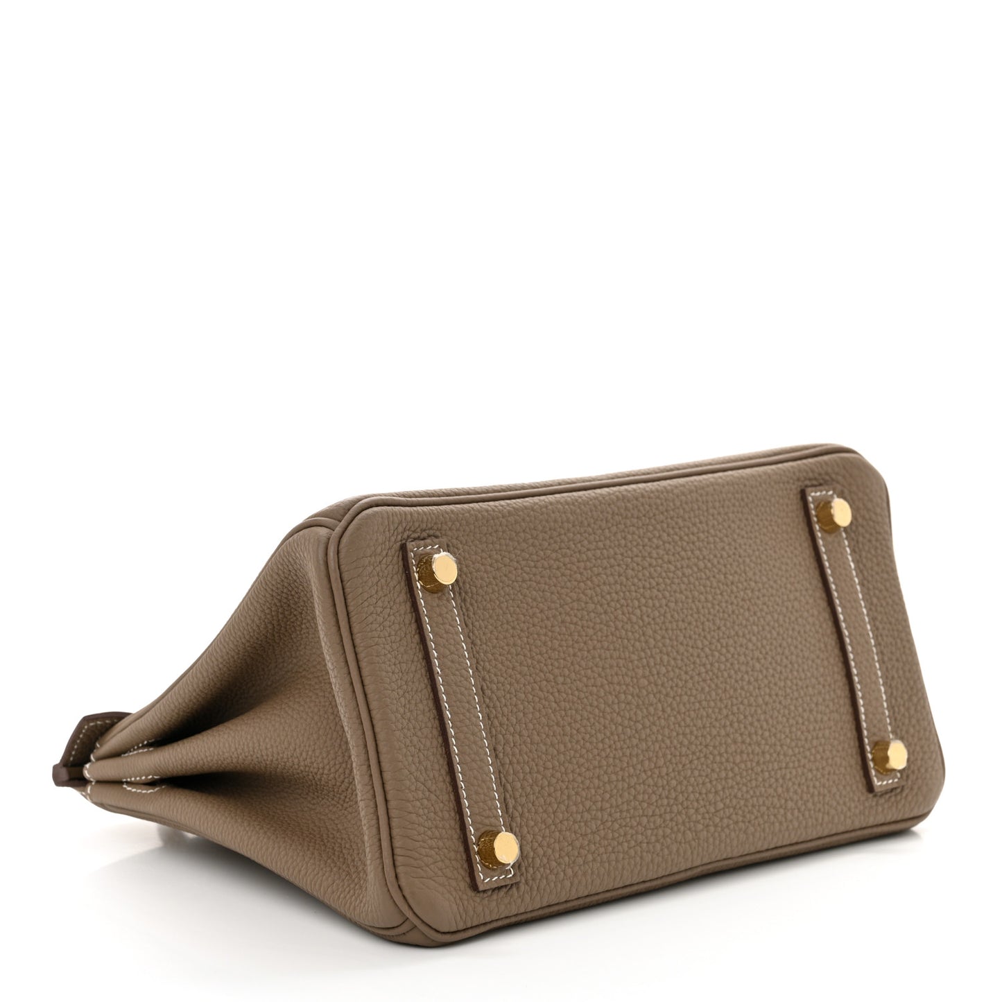 This is an authentic HERMES Togo Birkin 25 in Etoupe. This iconic handbag is hand-crafted of togo leather in taupe with white contrast stitching. The bag features rolled leather top handles, a short flap, and a cinch-style strap closure with gold links secured by a signature turn lock and optional padlock. The flap opens to a matching matte chevre goatskin leather interior with zipper and patch pockets.Follow this item for alerts. Hermes is a registered trademark of Hermes. FASHIONPHILE is not affiliated with Hermes.
