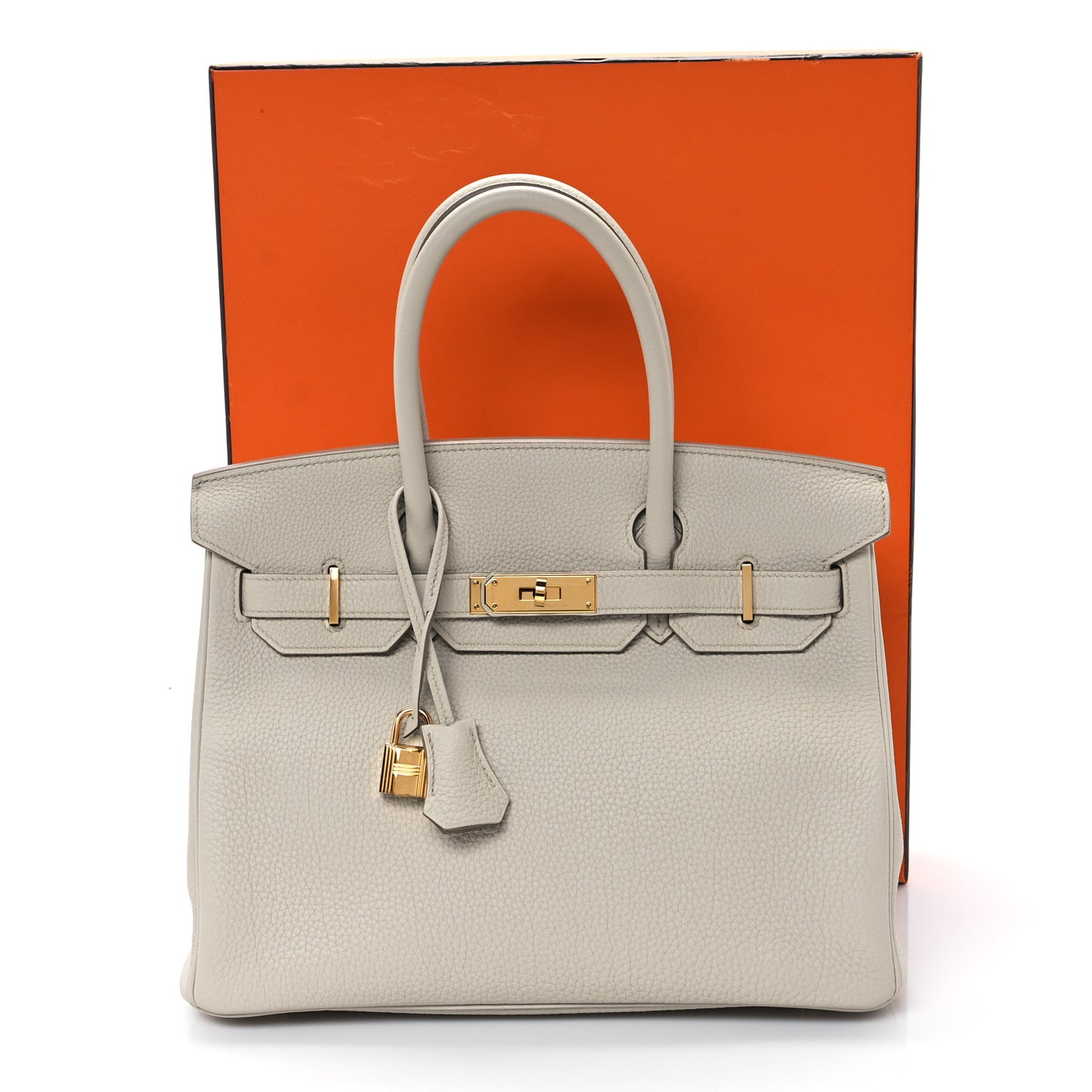 This is an authentic HERMES Togo Birkin 30 in Beton. This iconic handbag is crafted of grained calfskin leather in off-white. The bag features rolled leather top handles and a crossover flap with belt straps and gold plated turn lock that can be secured with the included padlock and keys. This opens the bag to a matching goatskin leather interior with a zipper and patch pocket.Follow this item for alerts. Hermes is a registered trademark of Hermes. FASHIONPHILE is not affiliated with Hermes.