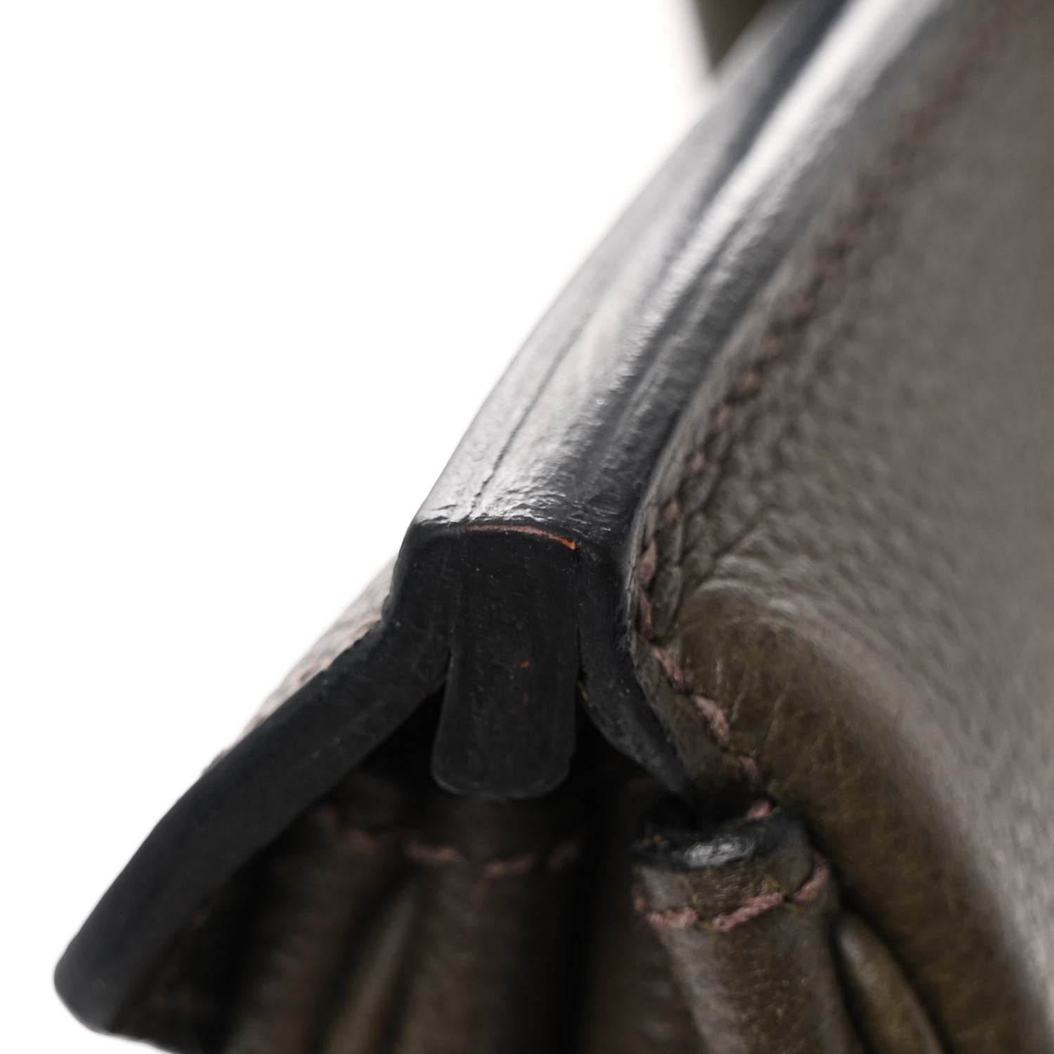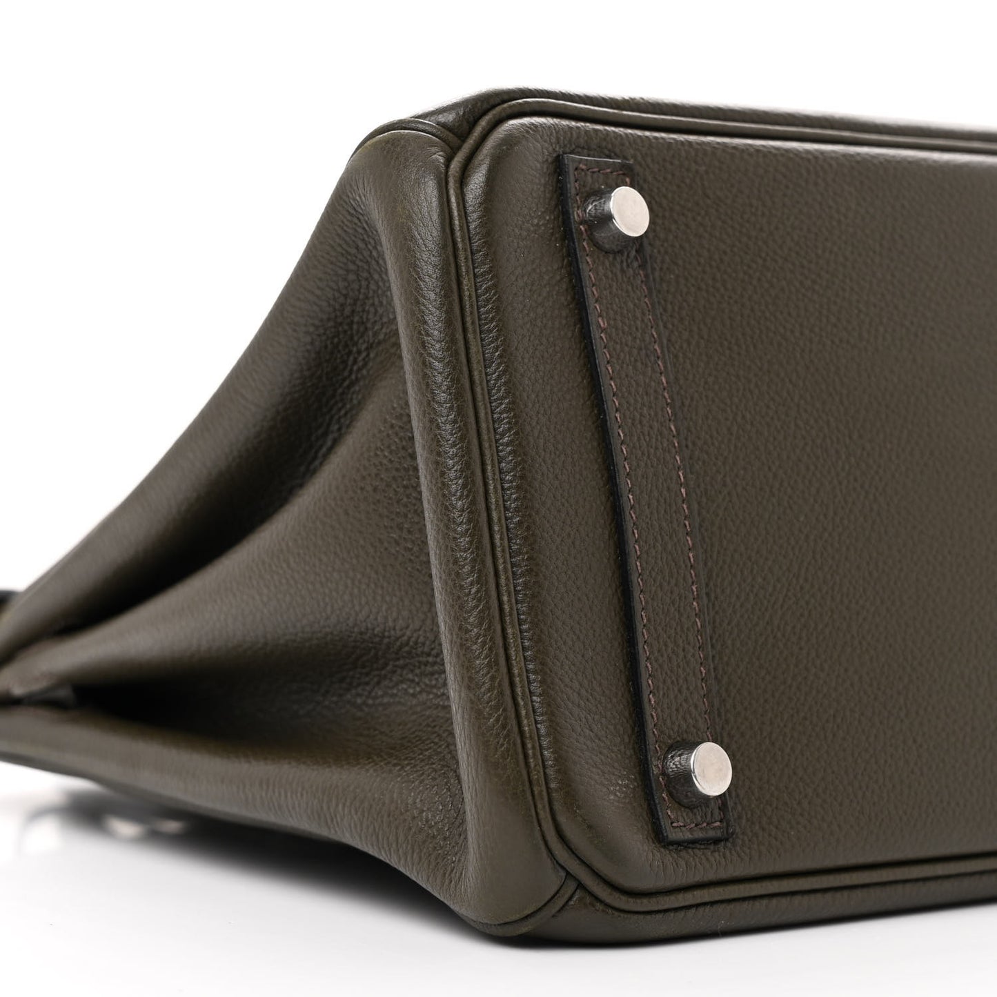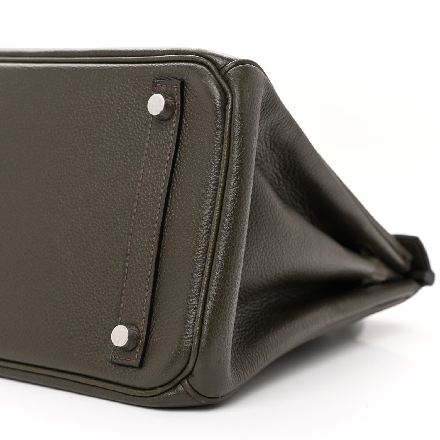 This is an authentic HERMES Togo Birkin 30 in Eucalyptus. This handbag is crafted of grained calfskin leather in greenish brown. The bag features rolled leather top handles, a leather belt, and polished silver palladium hardware including a turn lock, a padlock, and a hanging clochette with keys. The front flap opens to a matching goatskin leather interior with zipper and patch pockets.Follow this item for alerts. Hermes is a registered trademark of Hermes. FASHIONPHILE is not affiliated with Hermes.