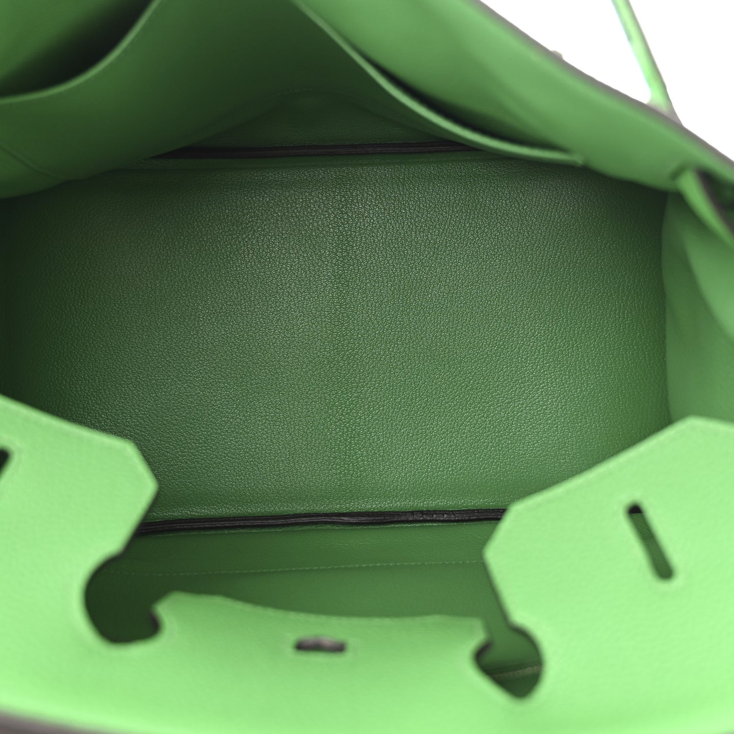 This is an authentic HERMES Togo Birkin 35 in Bambou. This stunning and spacious tote is crafted of Togo leather in bright green. The bag features thin but sturdy rolled leather top handles and a cross over flap with a strap closure and polished silver plated hardware including a polished silver turn lock and key clochette. This opens to a matte chevre goatskin leather interior with zipper and patch pockets.Follow this item for alerts. Hermes is a registered trademark of Hermes. FASHIONPHILE is not affiliated with Hermes.
