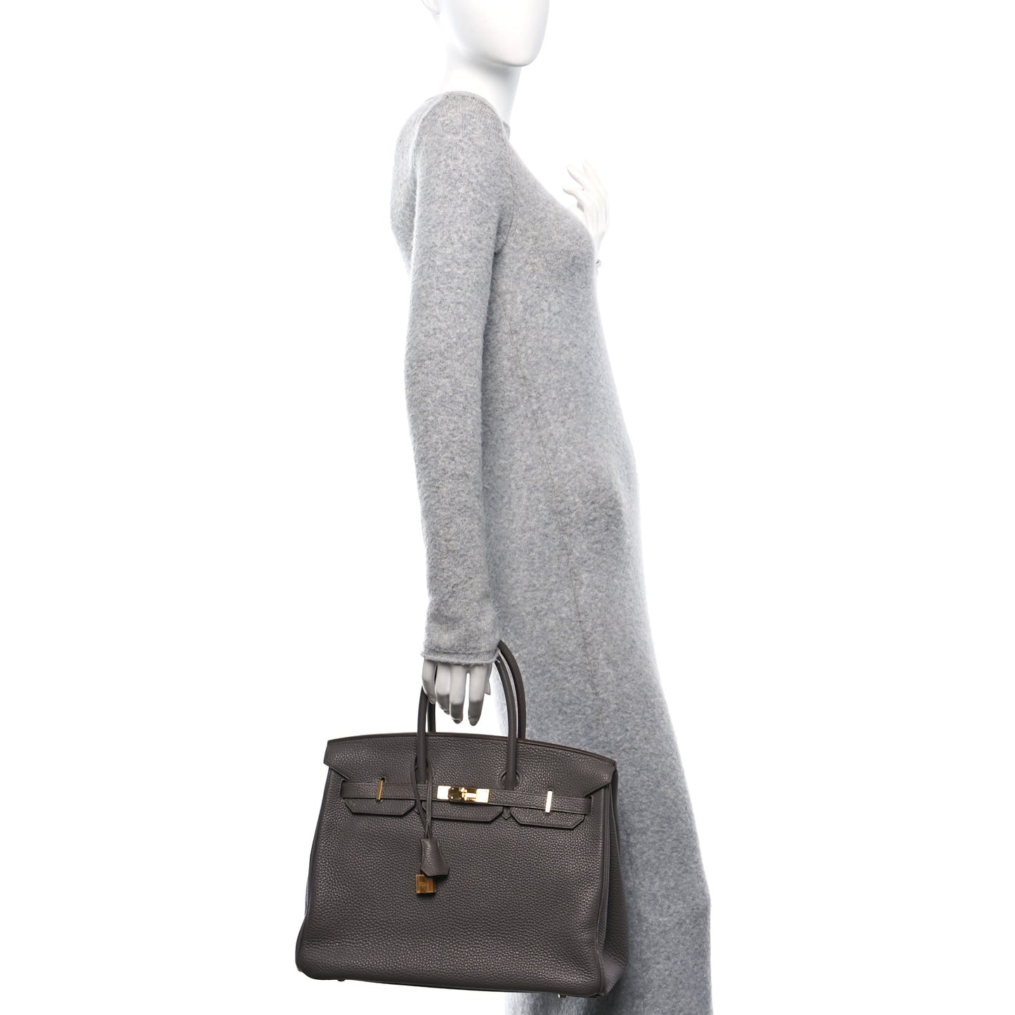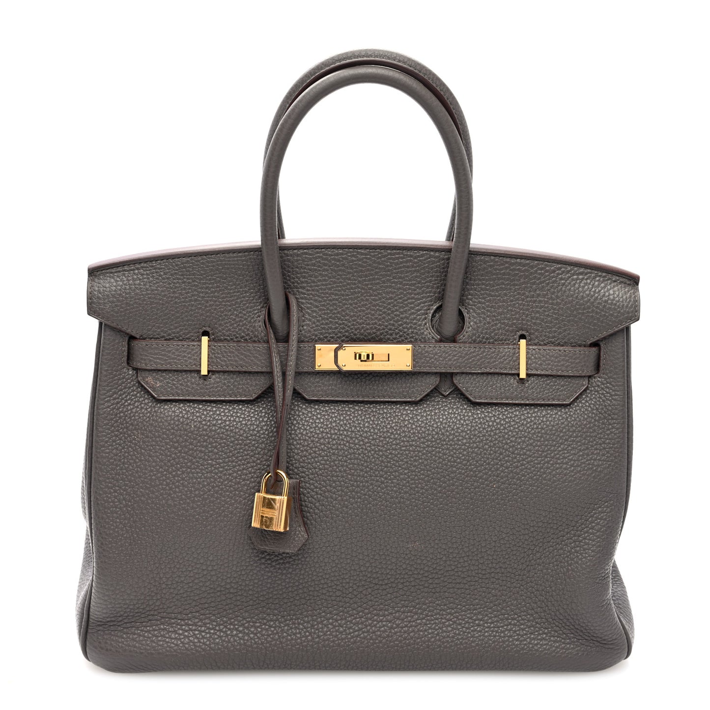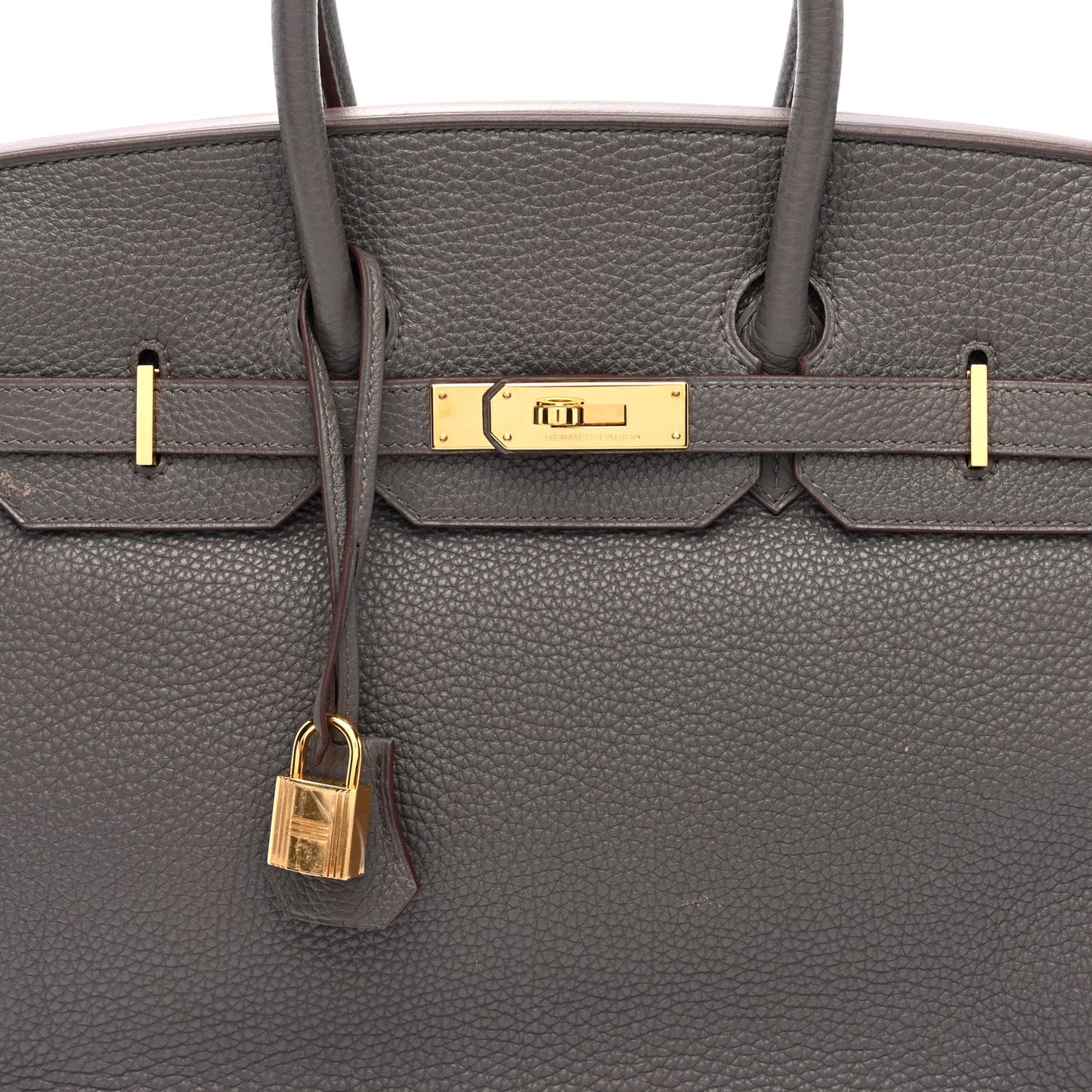 This is an authentic HERMES Togo Birkin 35 in Etain. This chic classic handbag is finely crafted of togo calfskin leather in grey. The bag features rolled leather top handles, a frontal flap, polished gold hardware including a turn lock, and a signature Hermes padlock with a hanging clochette for the key. The top flap opens to a chevre leather lining with zipper and patch pockets.Follow this item for alerts. Hermes is a registered trademark of Hermes. FASHIONPHILE is not affiliated with Hermes.