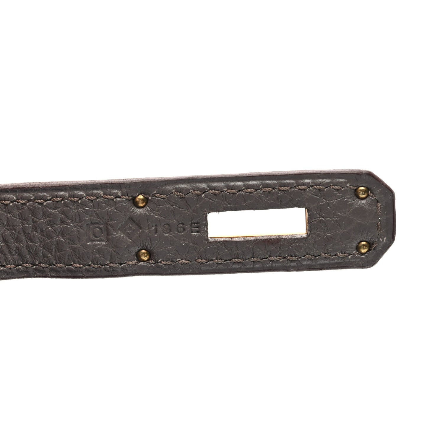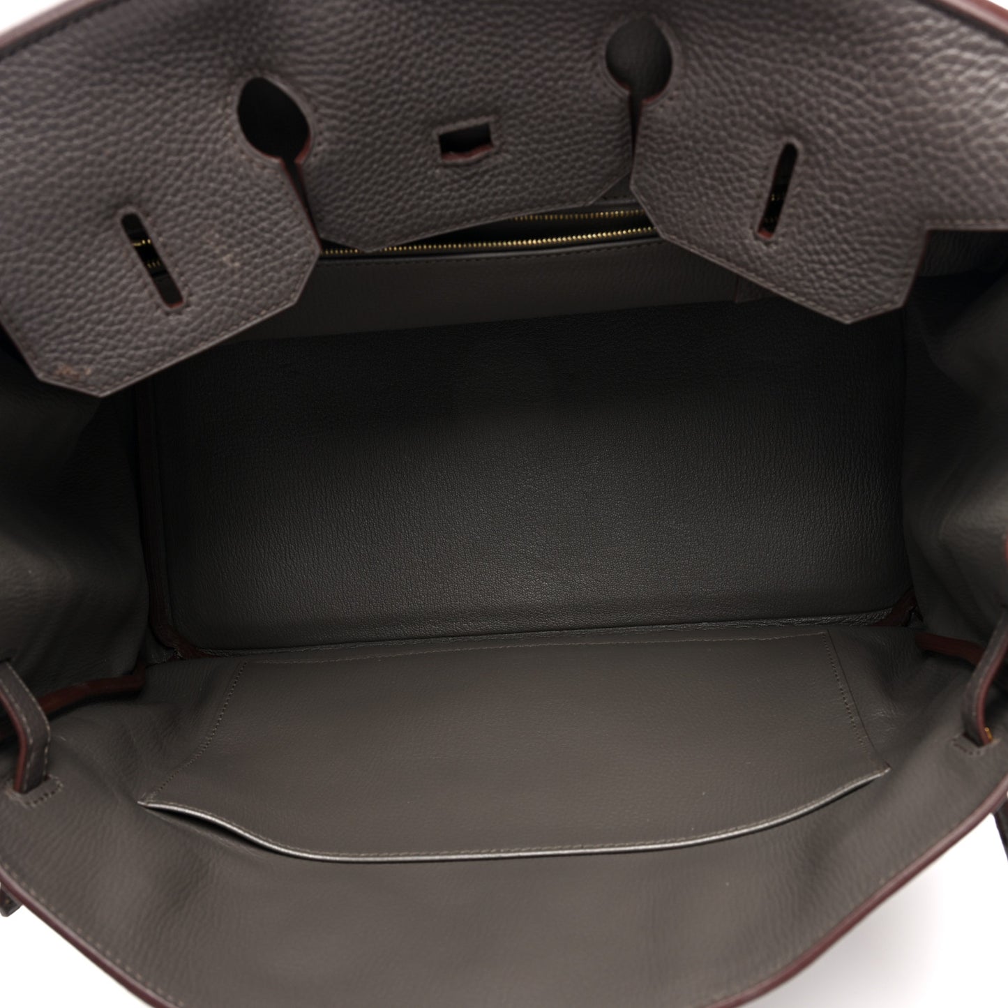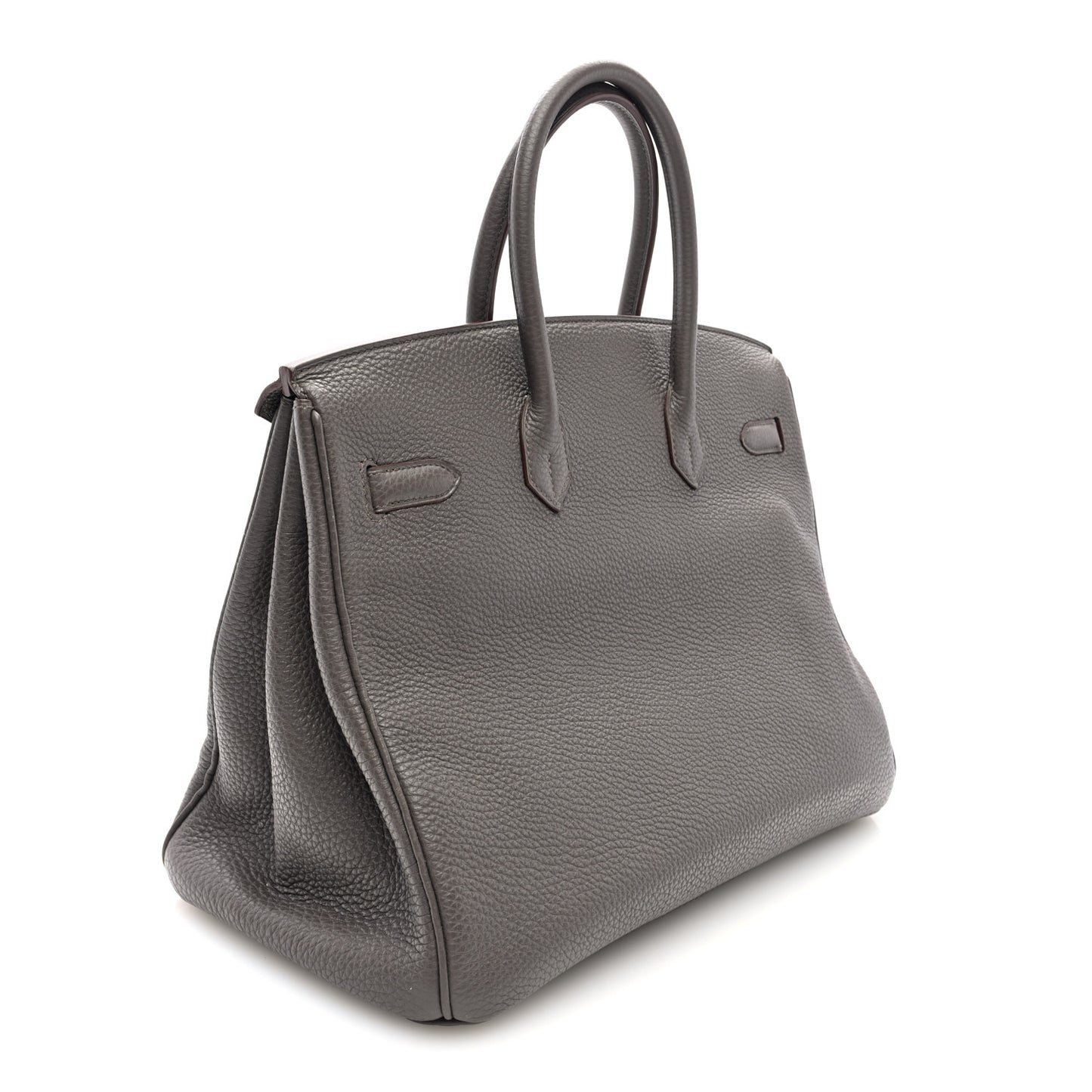 This is an authentic HERMES Togo Birkin 35 in Etain. This chic classic handbag is finely crafted of togo calfskin leather in grey. The bag features rolled leather top handles, a frontal flap, polished gold hardware including a turn lock, and a signature Hermes padlock with a hanging clochette for the key. The top flap opens to a chevre leather lining with zipper and patch pockets.Follow this item for alerts. Hermes is a registered trademark of Hermes. FASHIONPHILE is not affiliated with Hermes.