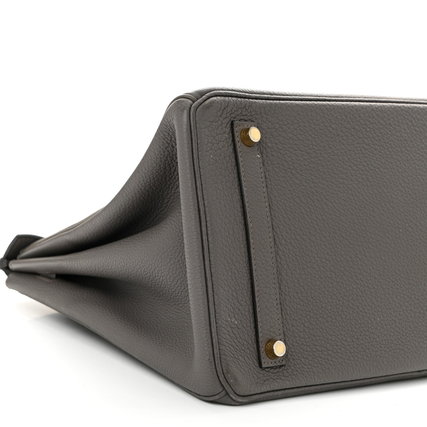 This is an authentic HERMES Togo Birkin 35 in Etain. This chic classic handbag is finely crafted of togo calfskin leather in grey. The bag features rolled leather top handles, a frontal flap, gold plated hardware including a turn lock, and padlock with a hanging clochette for the keys. The top flap opens to a chevre leather lining with zipper and patch pockets.Follow this item for alerts. Hermes is a registered trademark of Hermes. FASHIONPHILE is not affiliated with Hermes.