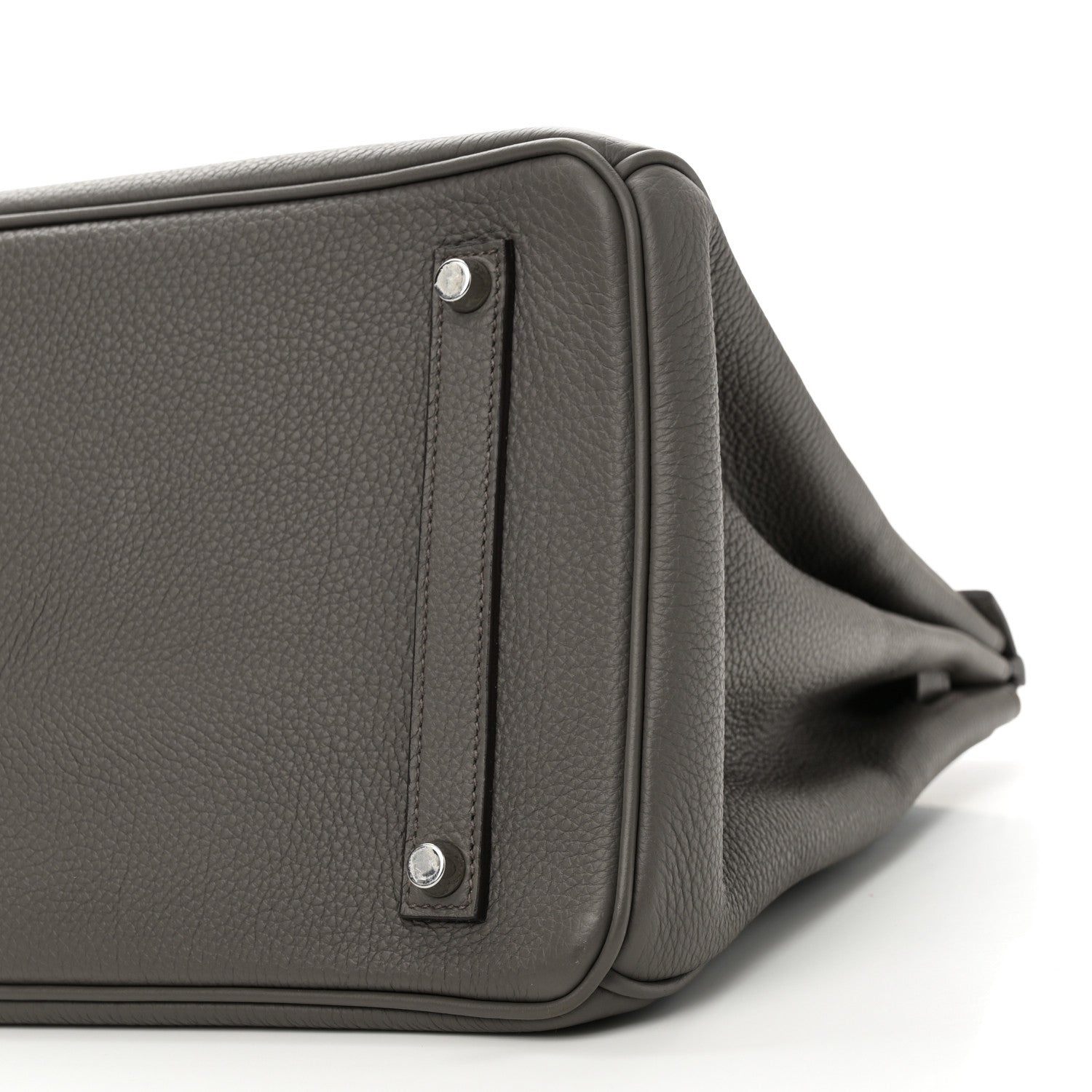 This is an authentic HERMES Togo Birkin 35 in etain. This chic classic handbag is finely crafted of togo calfskin leather in grey. The bag features rolled leather top handles, a frontal flap, palladium hardware including a turn lock, and padlock with a hanging clochette for the keys. The top flap opens to a chevre leather lining with zipper and patch pockets.Follow this item for alerts. Hermes is a registered trademark of Hermes. FASHIONPHILE is not affiliated with Hermes.